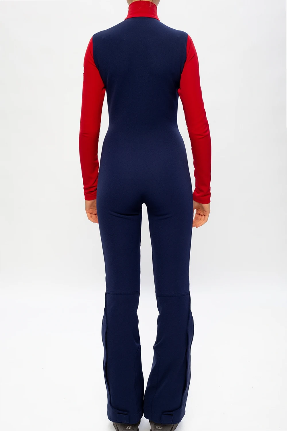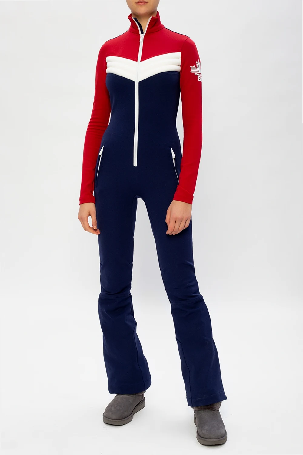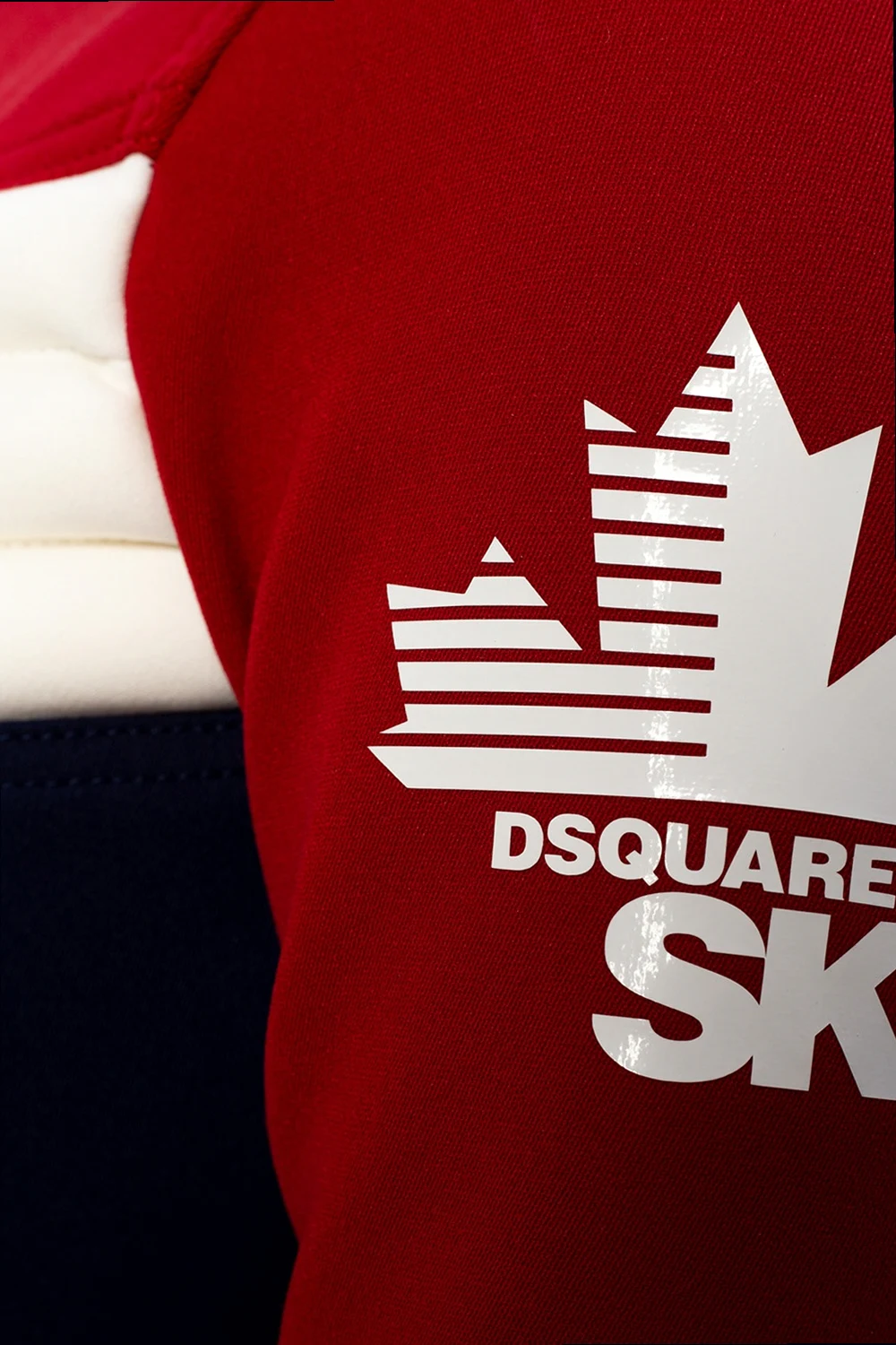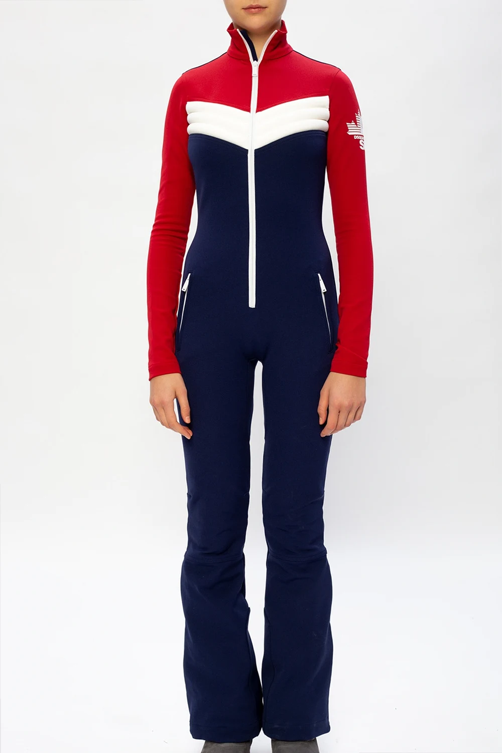 Red, white and navy ski jumpsuit with a band collar from Dsqaured2. Fastened with a zip, this garment features a logo print, two front zip pockets and velcro strap fasteners at the cuffs.