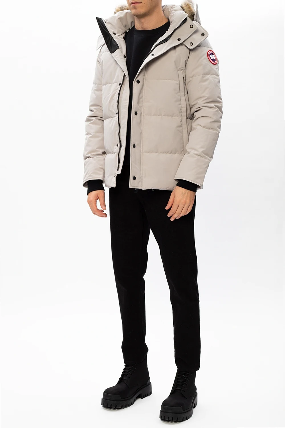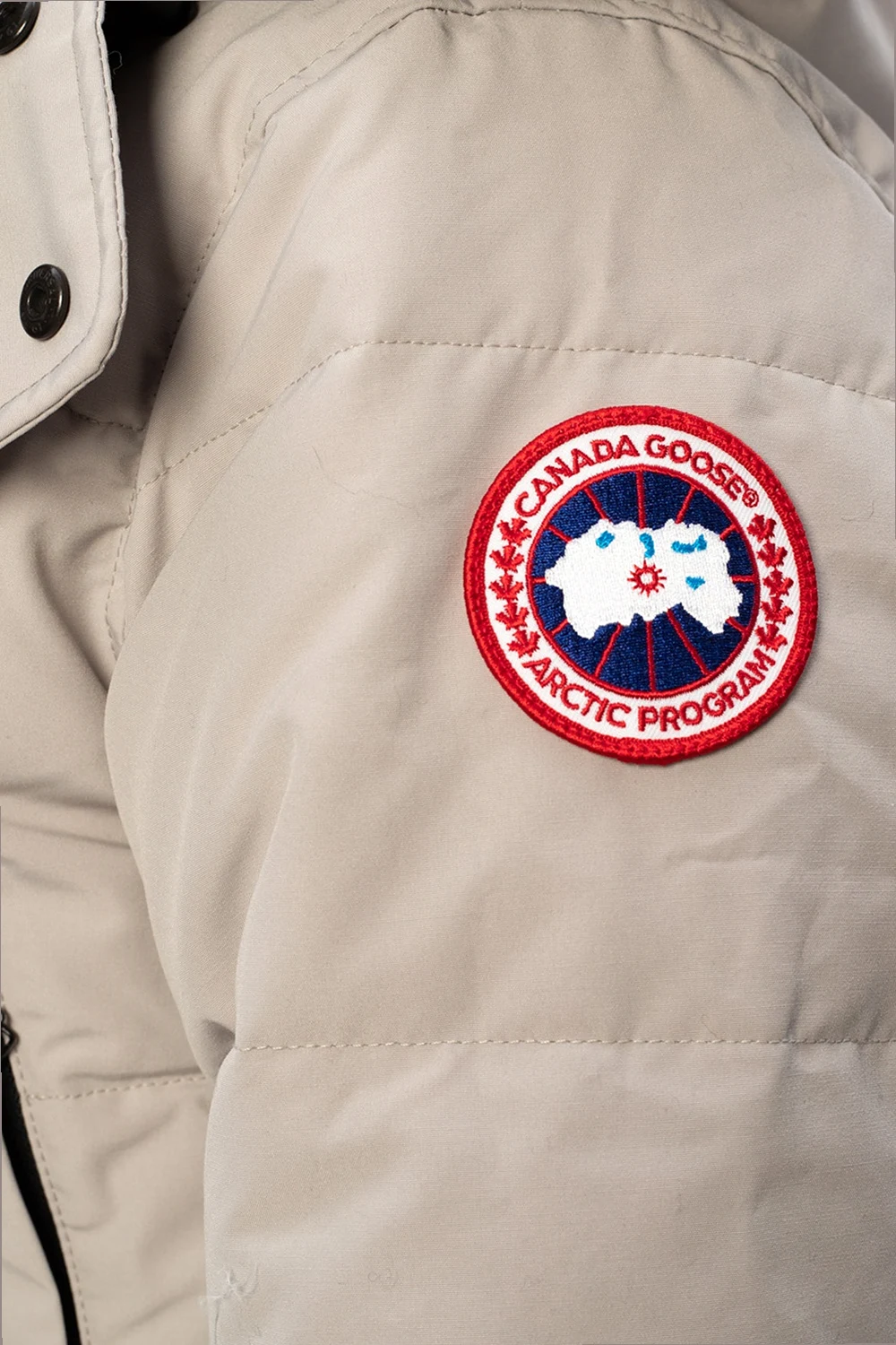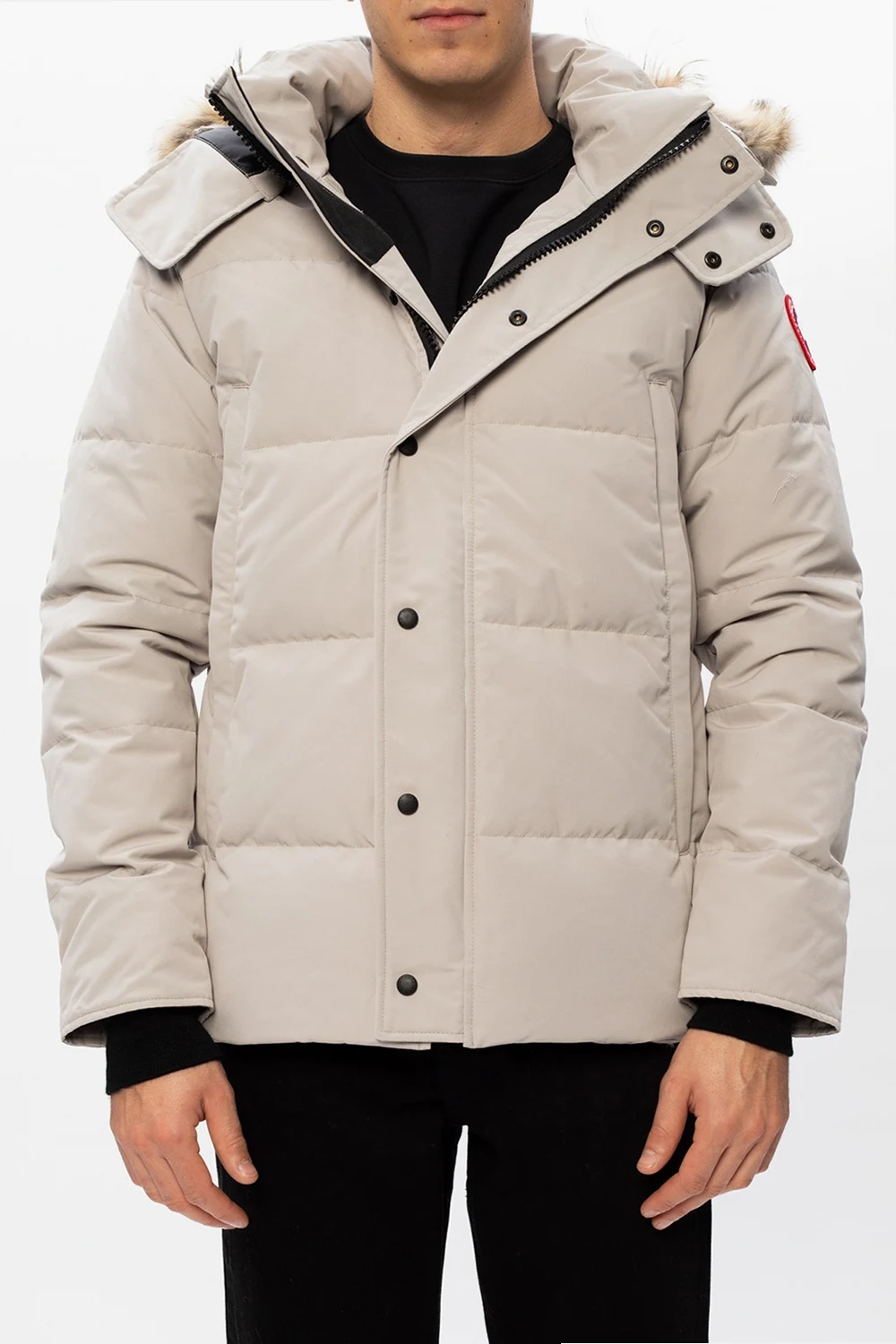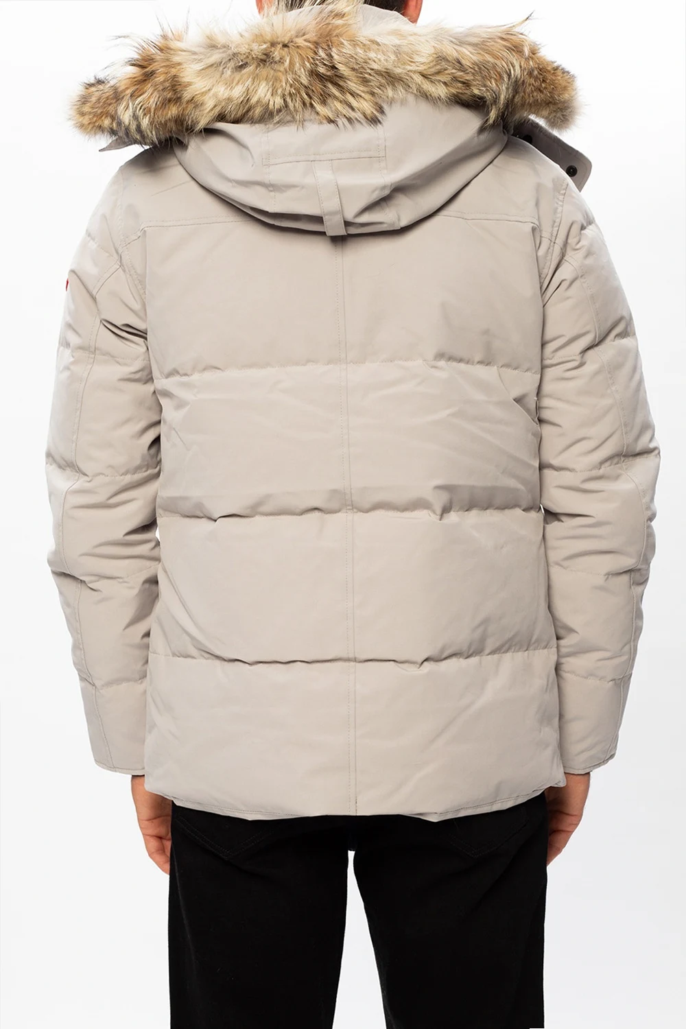 Grey and black ‘Wyndham’ down jacket from Canada Goose. Fastened with a two-way zip and snaps, this garment features a drawstring hood trimmed with coyote fur, two front zip pockets and long sleeves with a colorful logo patch. Temperature rating: -10 to -20°C.