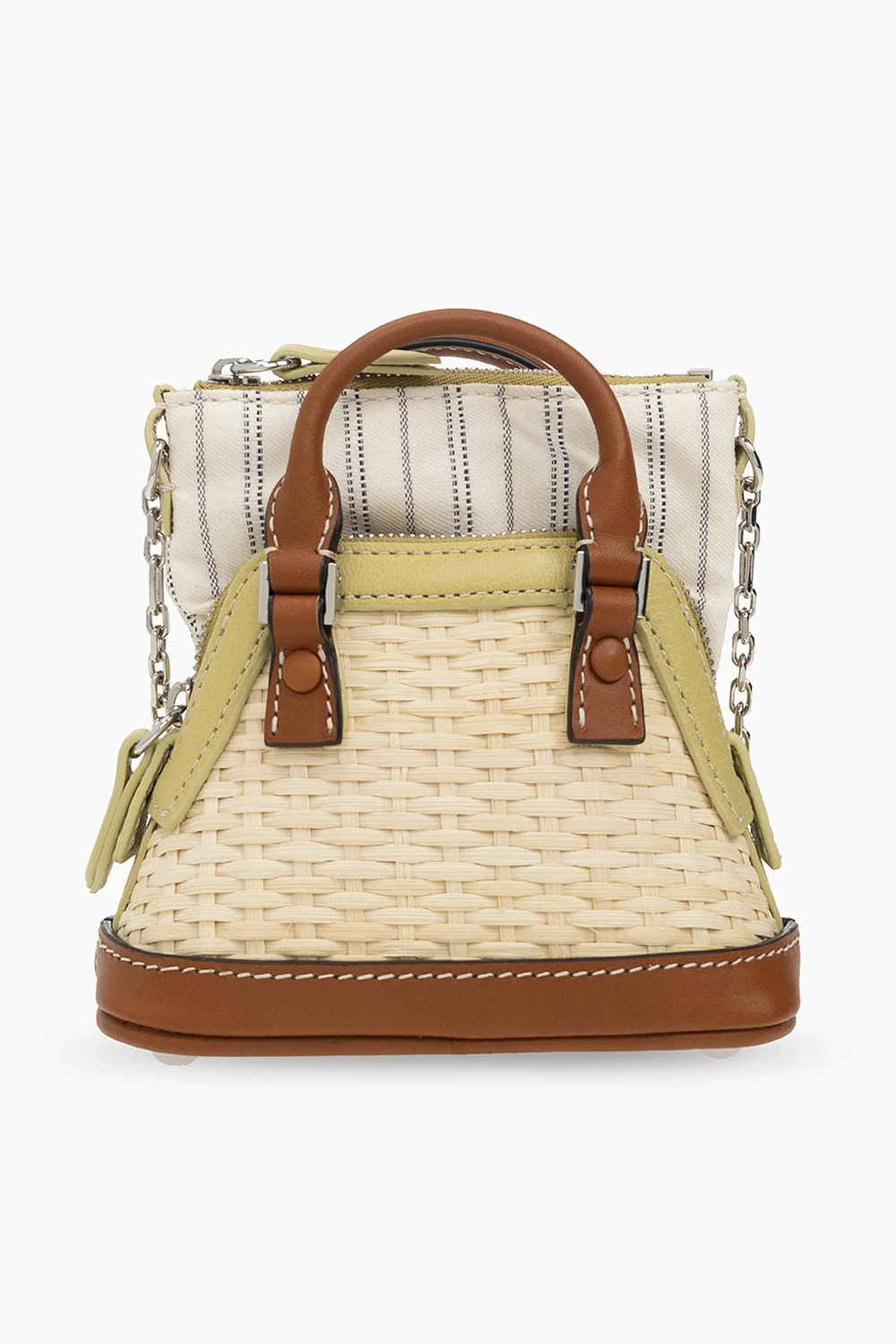 Beige, brown and green ‘5AC Classique Baby’ shoulder bag from Maison Margiela. Woven from raffia with leather trims, this model features an internal canvas compartment with a stripe pattern and zip, numerical logo patch, two half-round handles, shoulder chain and silver-tone metal hardware.