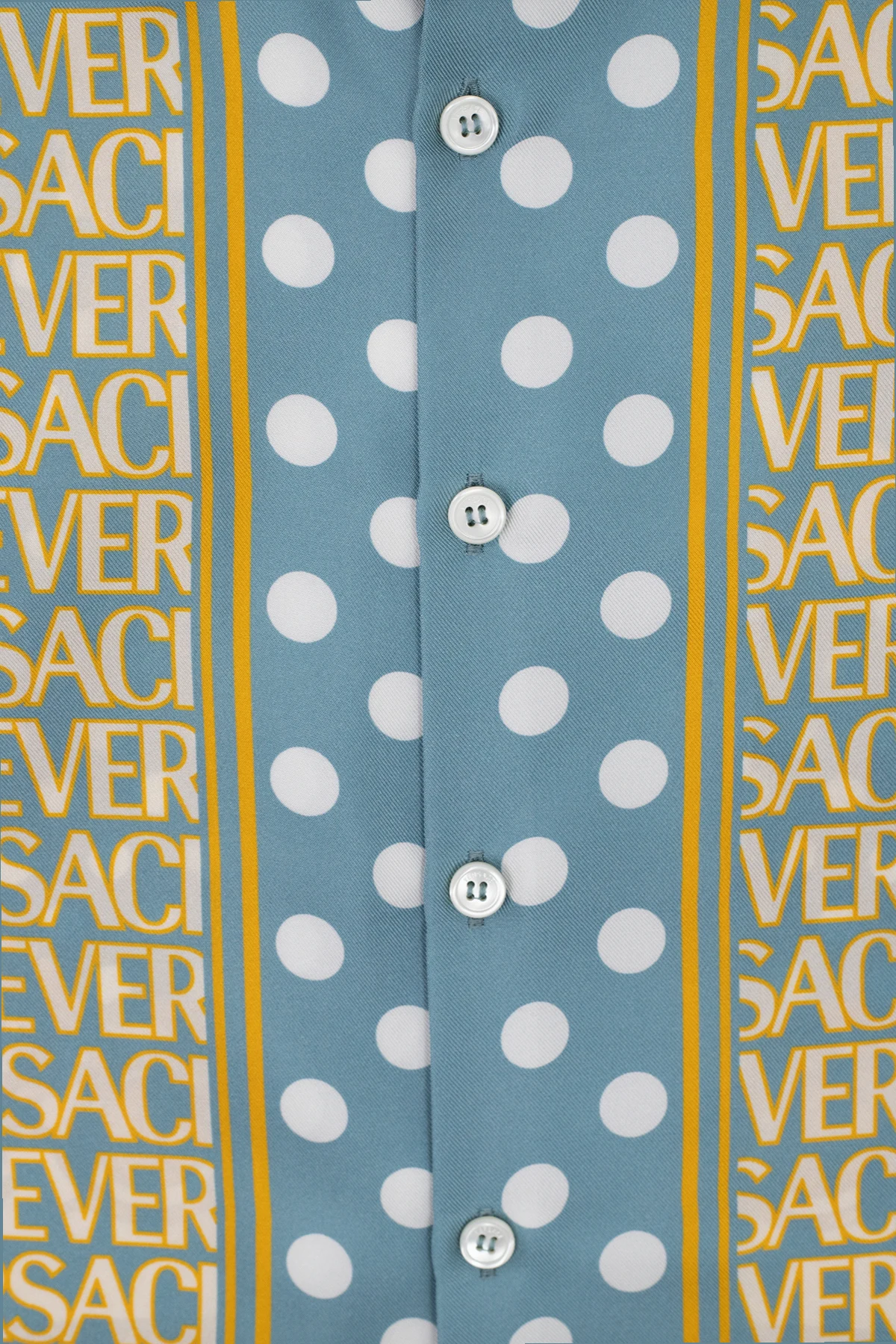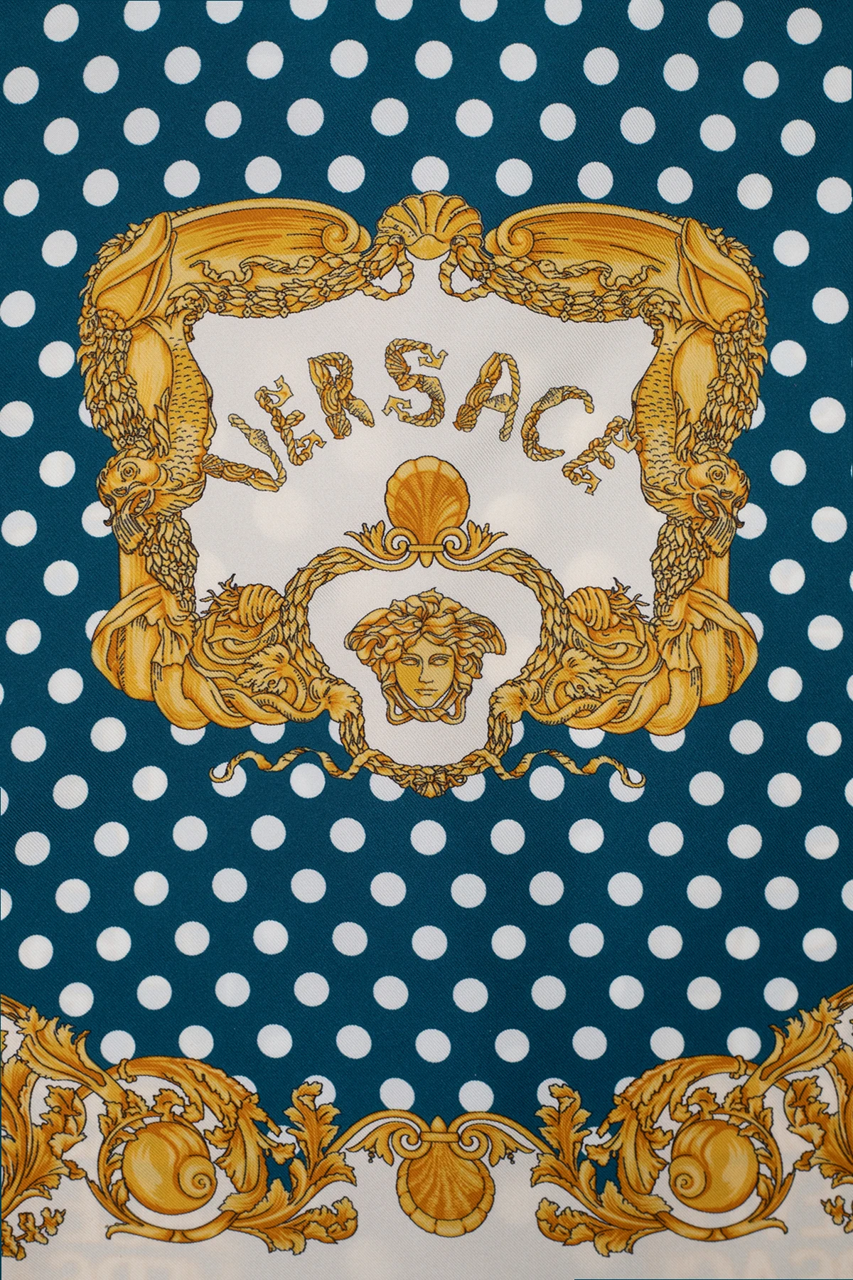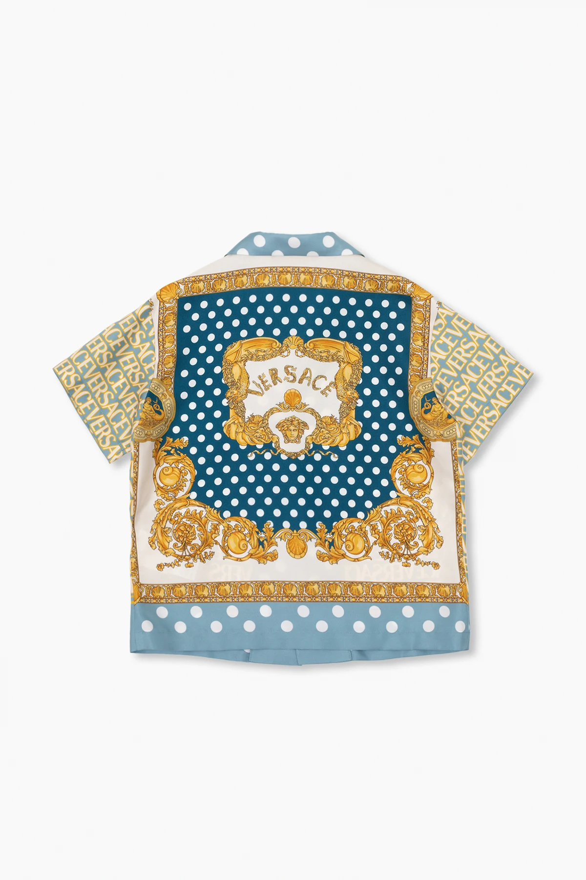 Blue, cream and gold-tone shirt from Versace Kids, ‘La Vacanza’ capsule collection. Made of silk, this short sleeve design fastens with buttons and is decorated with Versace Allover Polka Dot Kids and Seashell Baroque Polka Dot Kids patterns.
