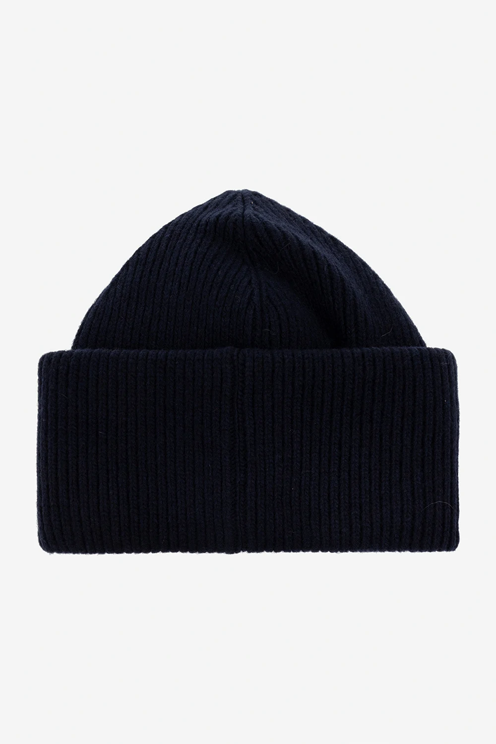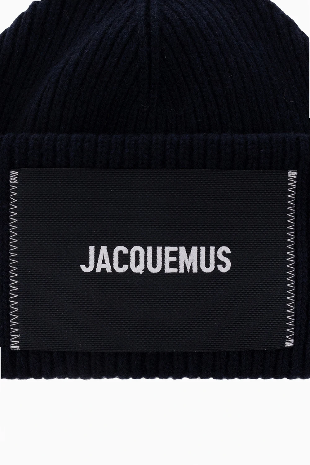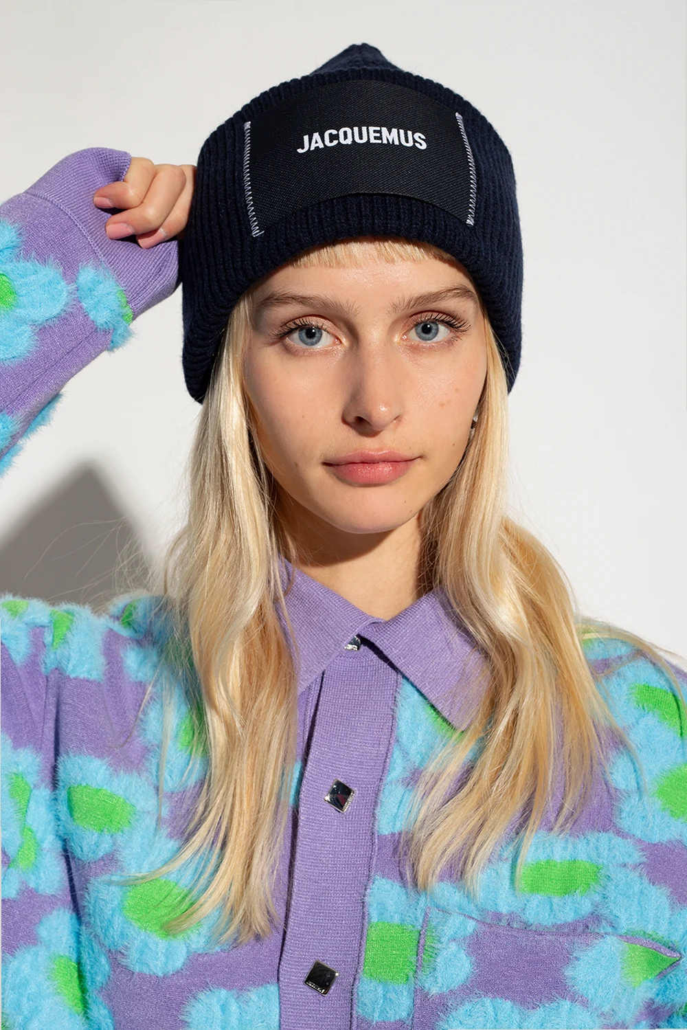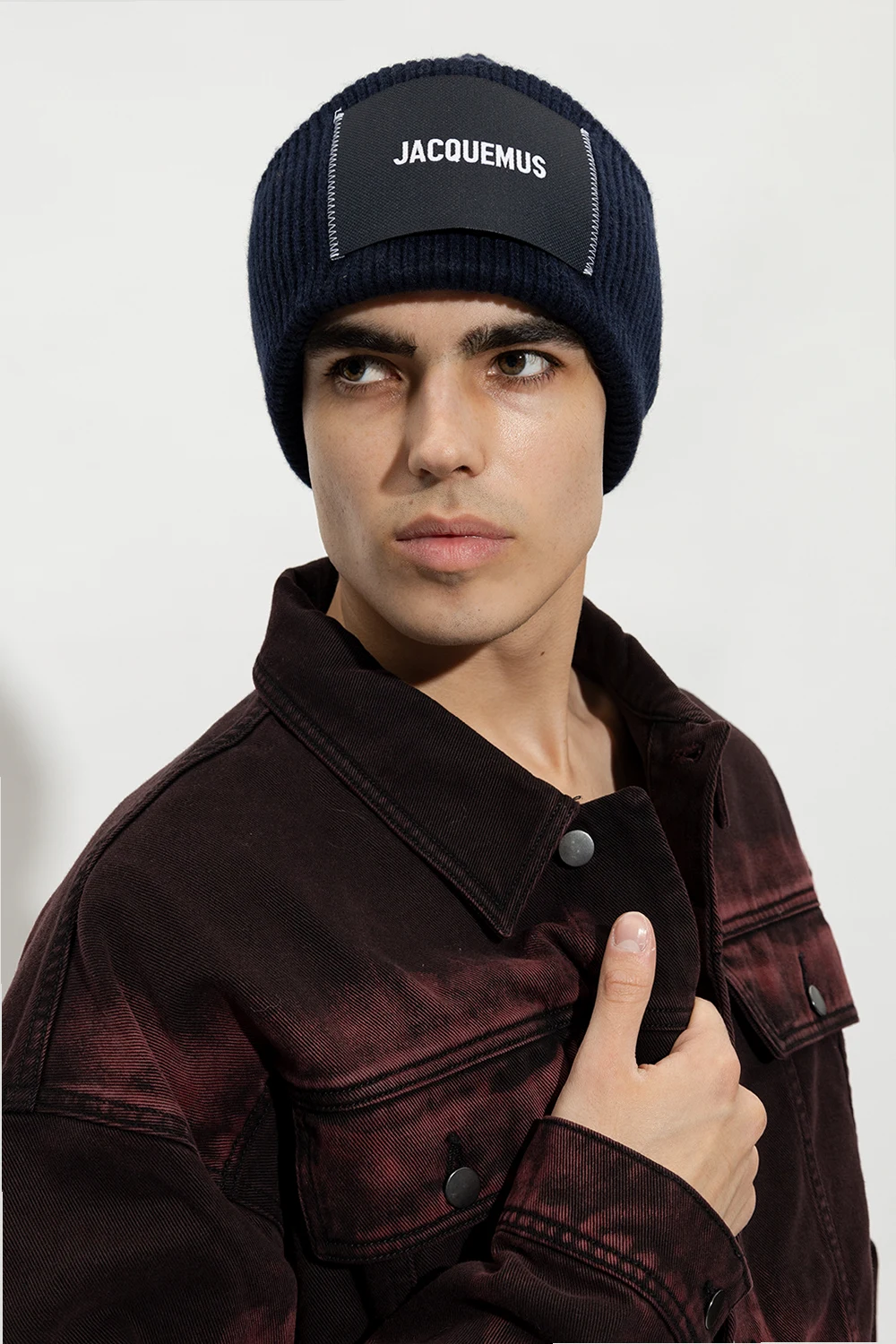Navy blue beanie from Jacquemus. Made of wool, this item features a turn-up hem and a black and white logo patch on the front.