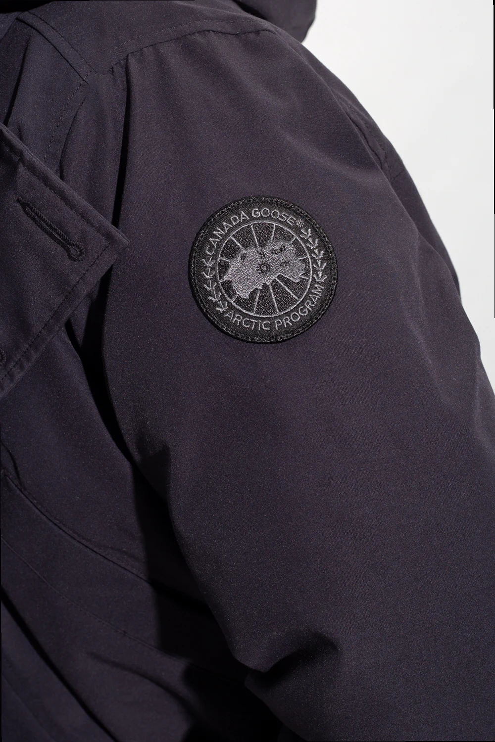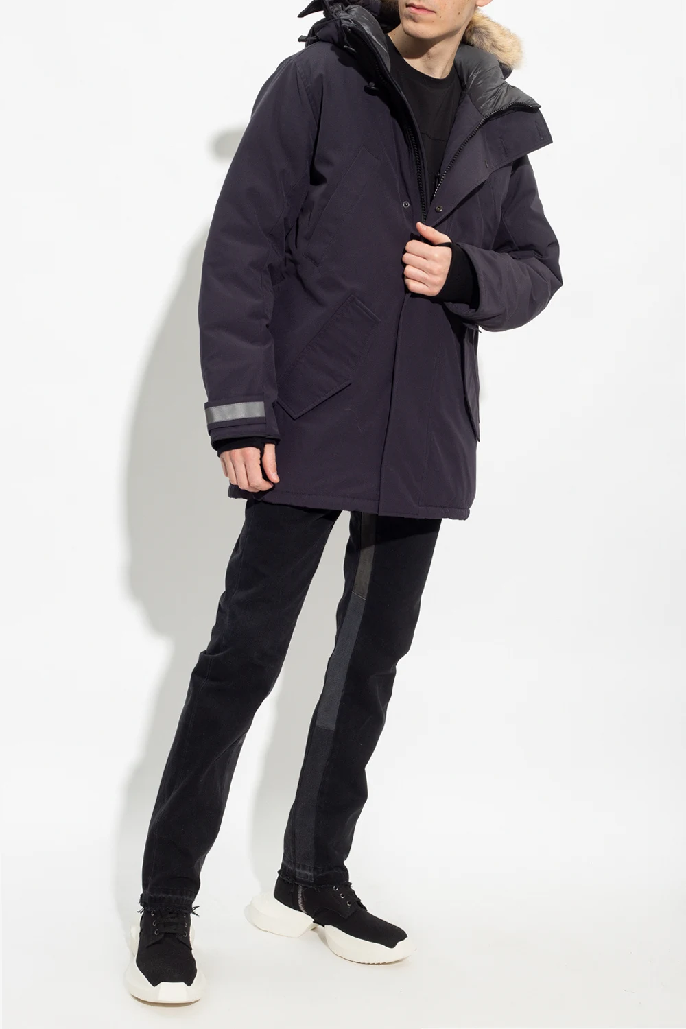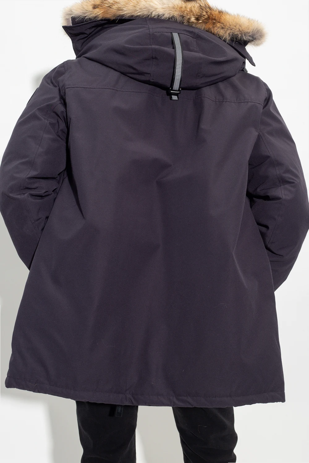 Navy blue ‘Edgewood’ jacket from Canada Goose. Packed with duck down, this style secures with a two-way zip and snap and features a drawcord-adjustable hood with a detachable brown coyote fur insert, four snap-fastened pockets on the front (two with flaps), a branded sleeve patch, long sleeves with elasticated cuffs and thumbholes, and internal straps which allow the item to be carried hands-free over the shoulders.