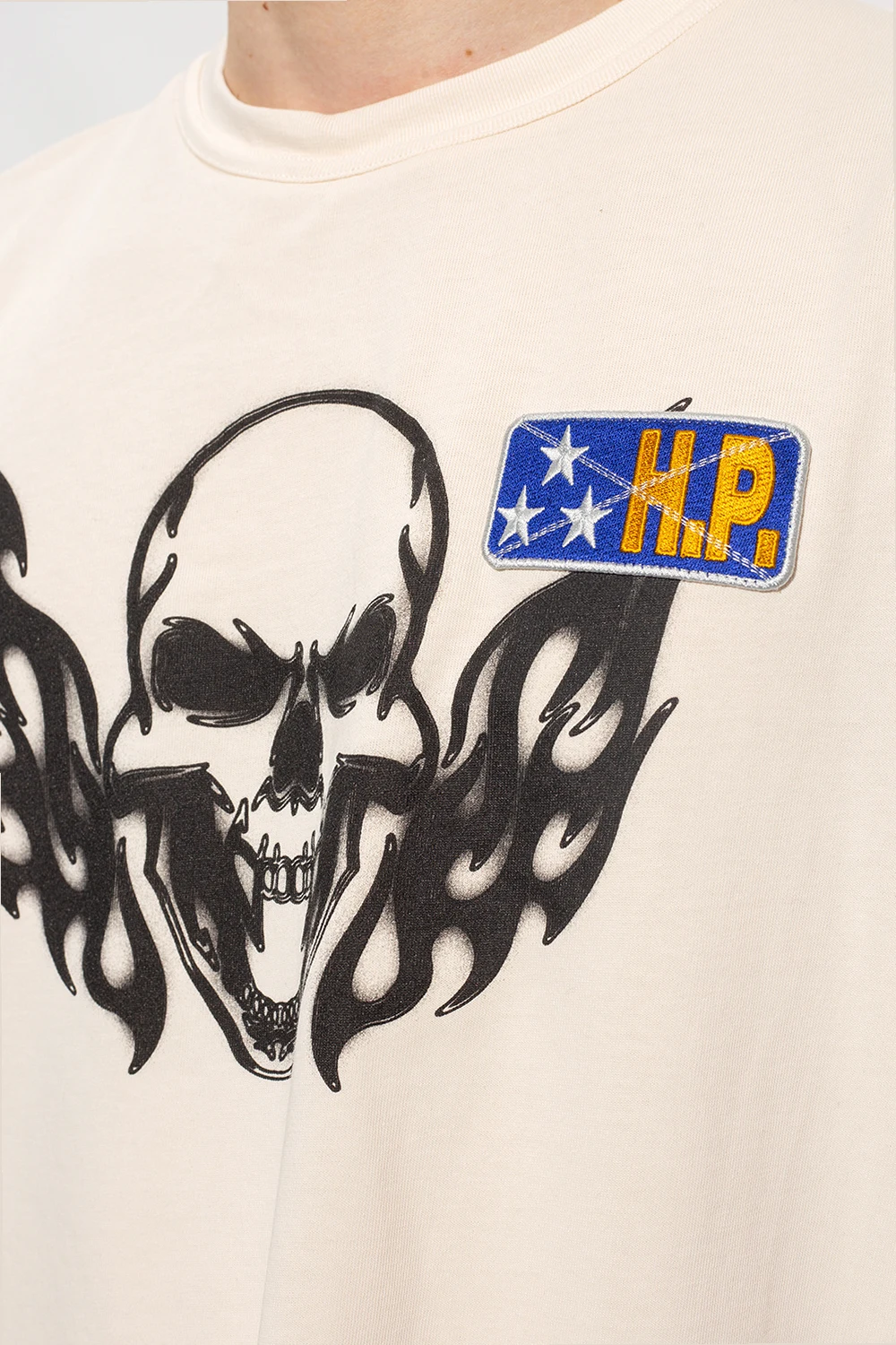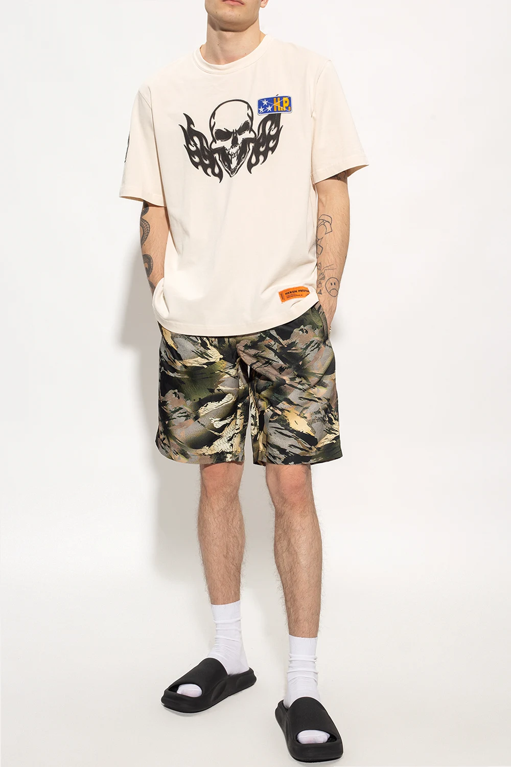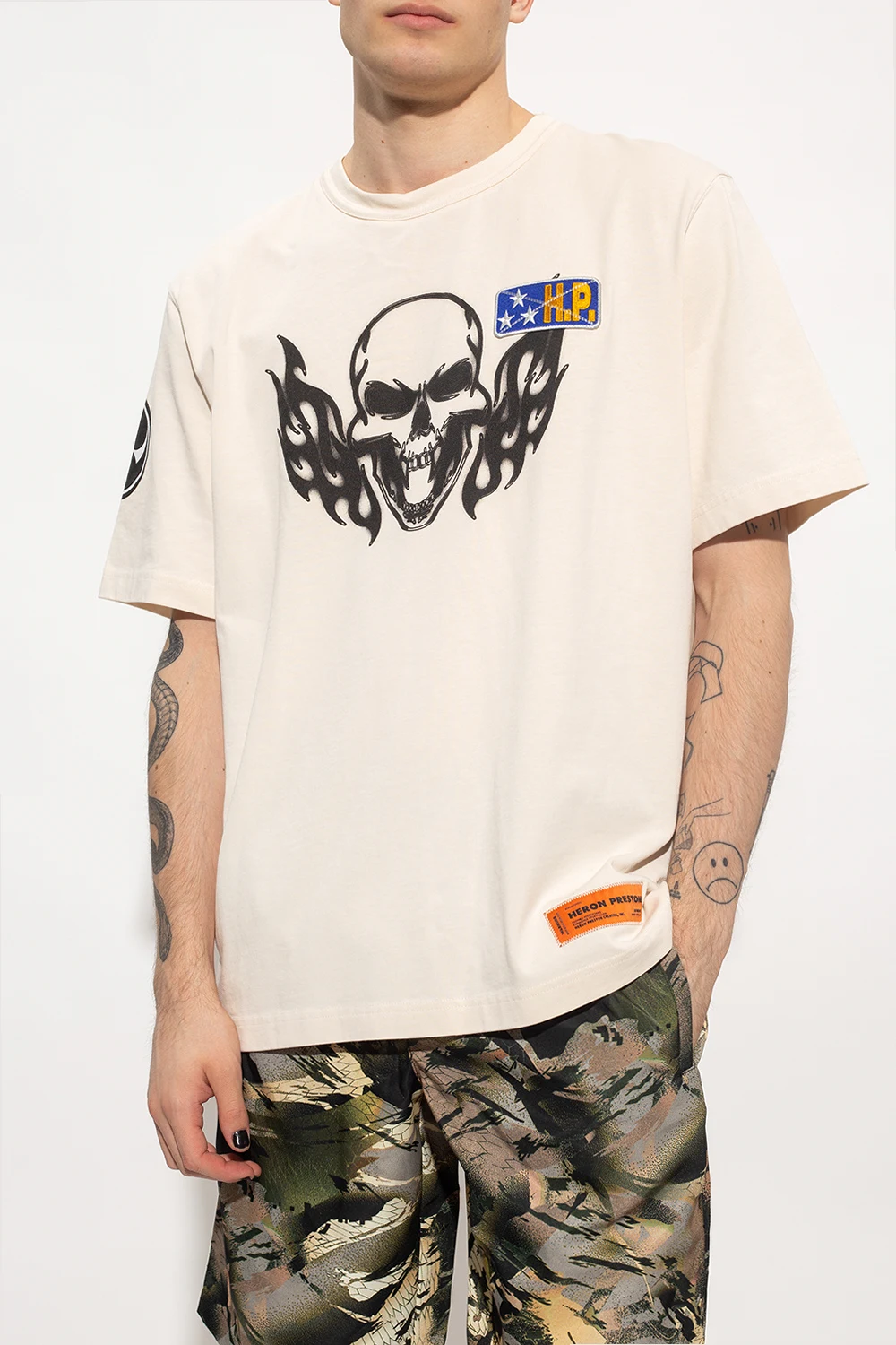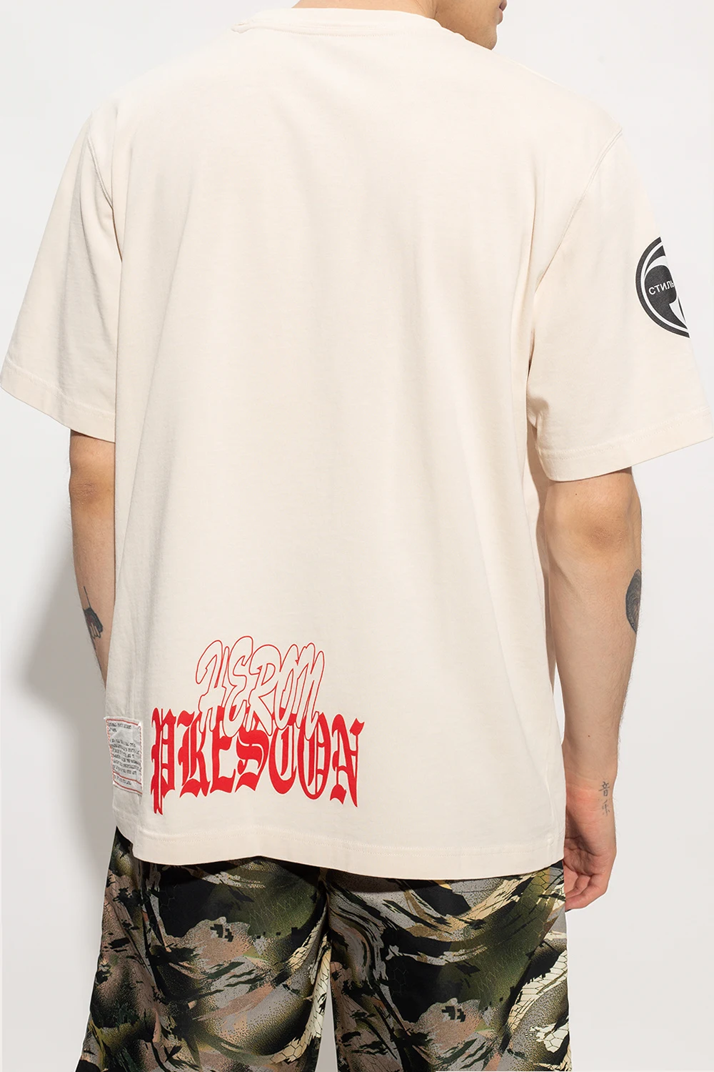 Light beige crewneck T-shirt from Heron Preston. Made of cotton, this style features short sleeves and a black and red graphic print accompanied by logo patches.