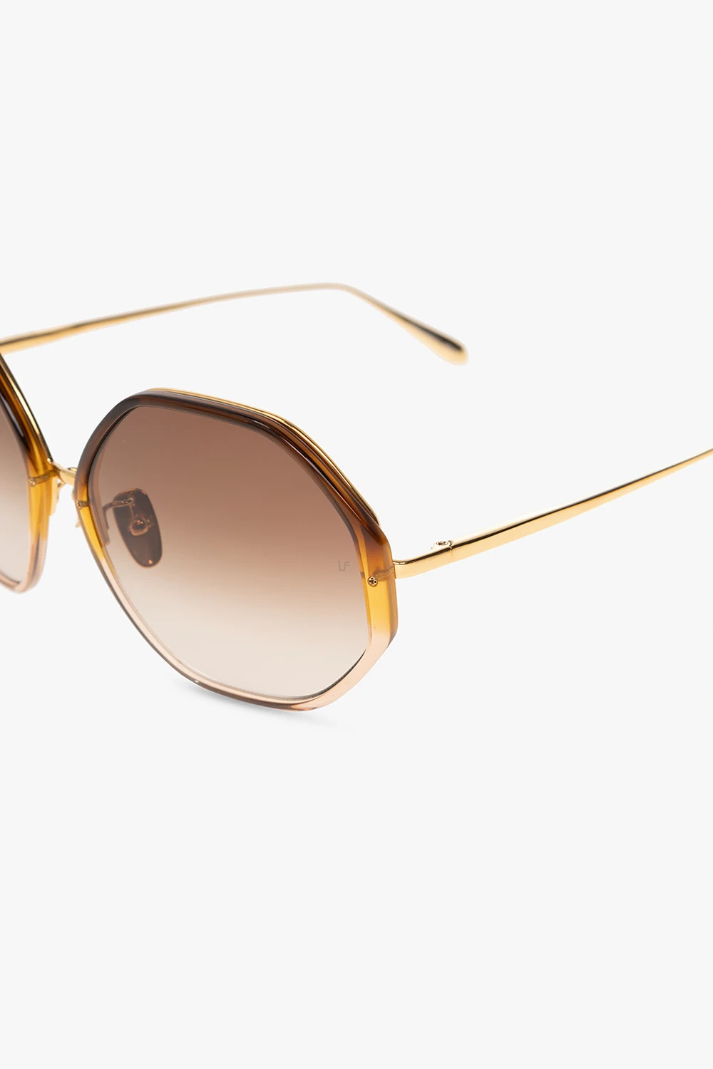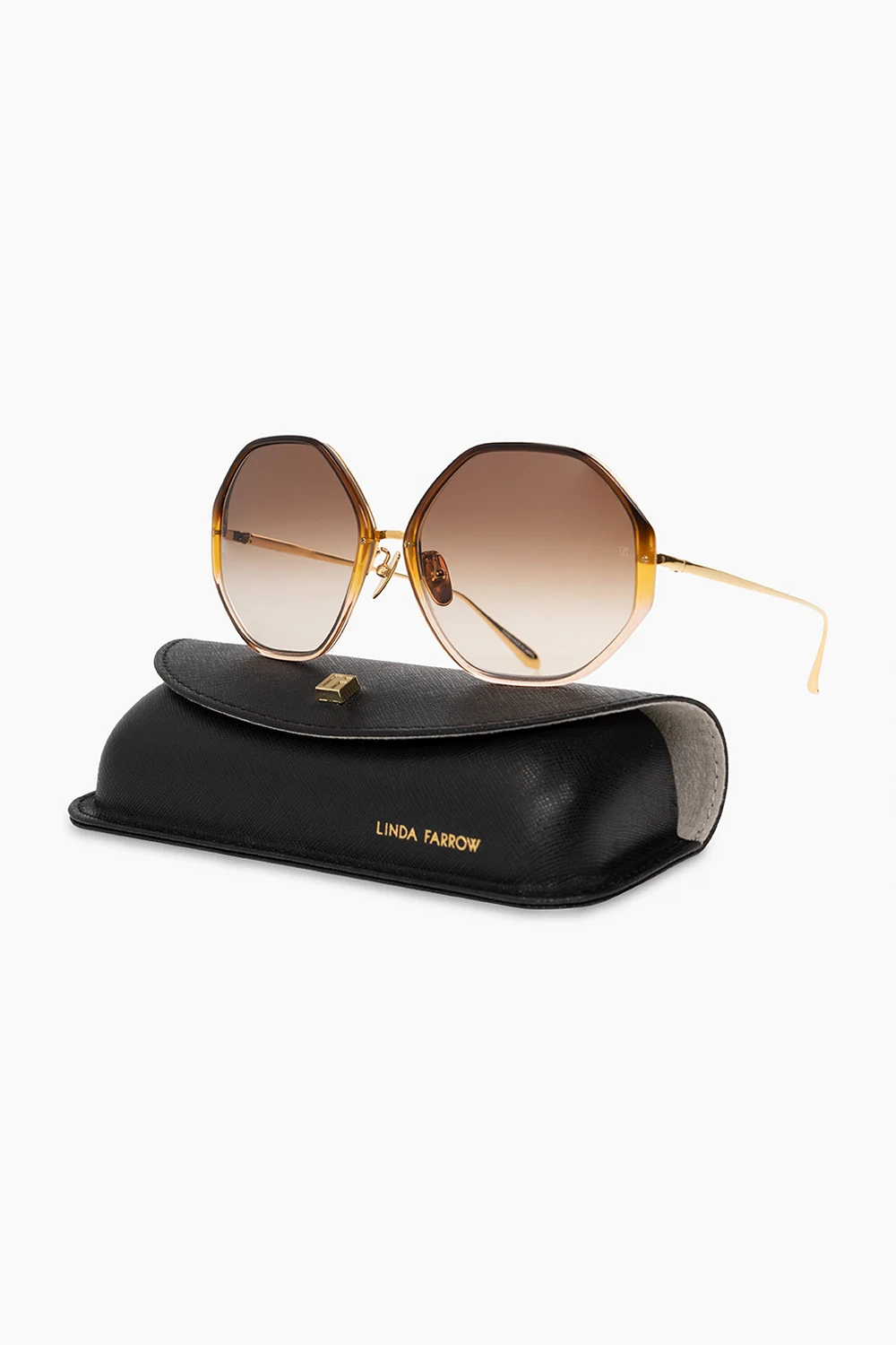 Brown and gold-tone ‘Alona’ sunglasses from Linda Farrow. Made of transparent acetate with a gradient effect and titanium elements plated with 22k yellow gold, this pair has oversize rounded heptagonal frames, single bridge with branded nose pads, thin temples and brown anti-reflective gradient lenses with ZEISS technology and 100% UV protection. Comes with a case.