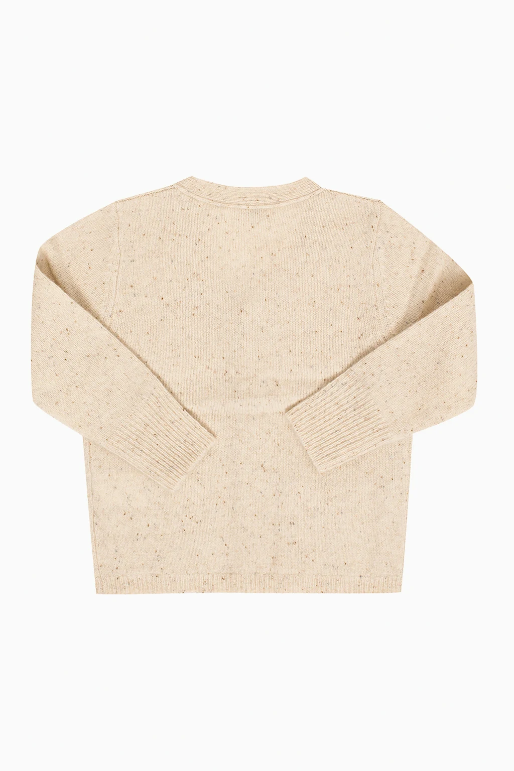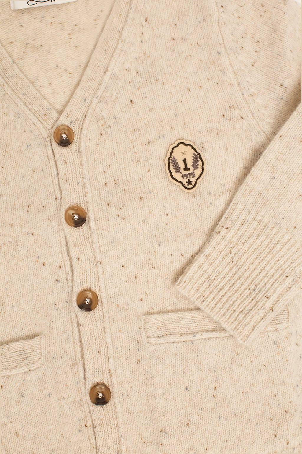 Cream cardigan from Bonpoint Kids. Crafted from wool, this style fastens via buttons and showcases a logo patch, two slip pockets and elasticated trims on the bottom hem and cuffs.