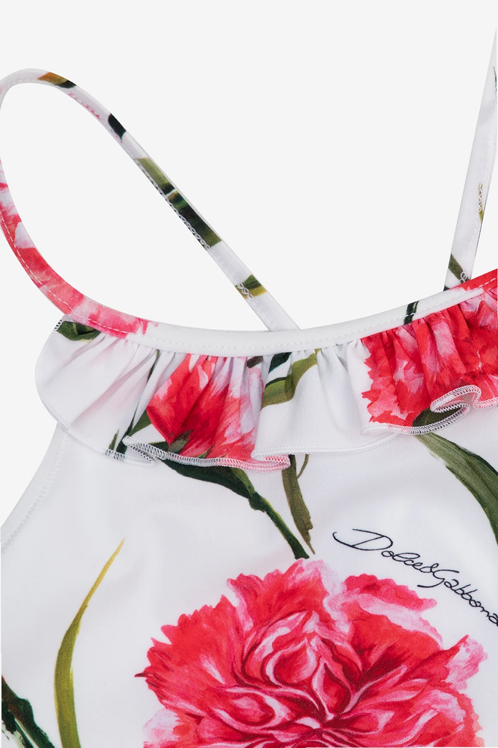 White one-piece swimsuit from Dolce & Gabbana Kids. This model features a multicolored floral print, logo detail, decorative ruffles and criss-cross straps at the back.