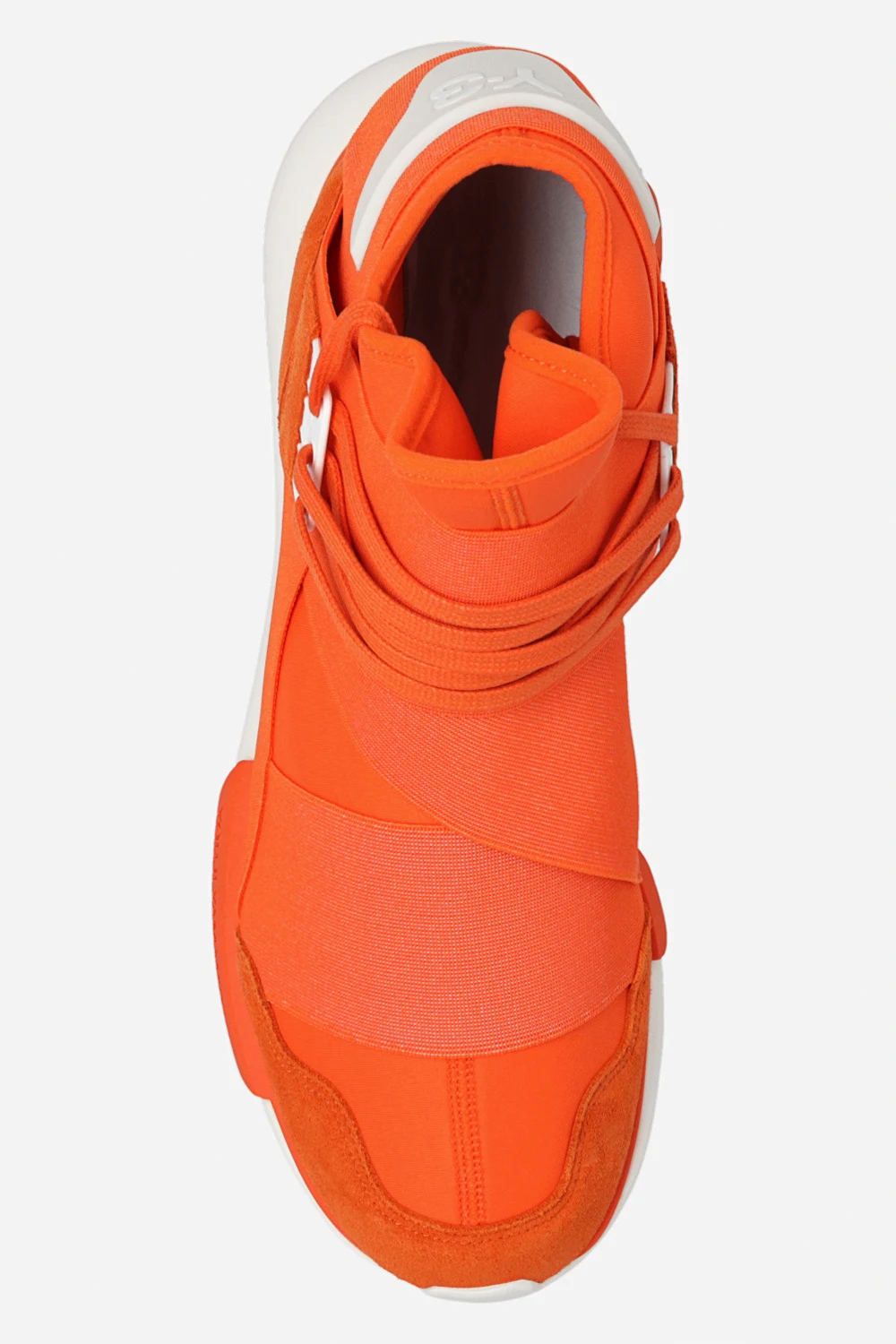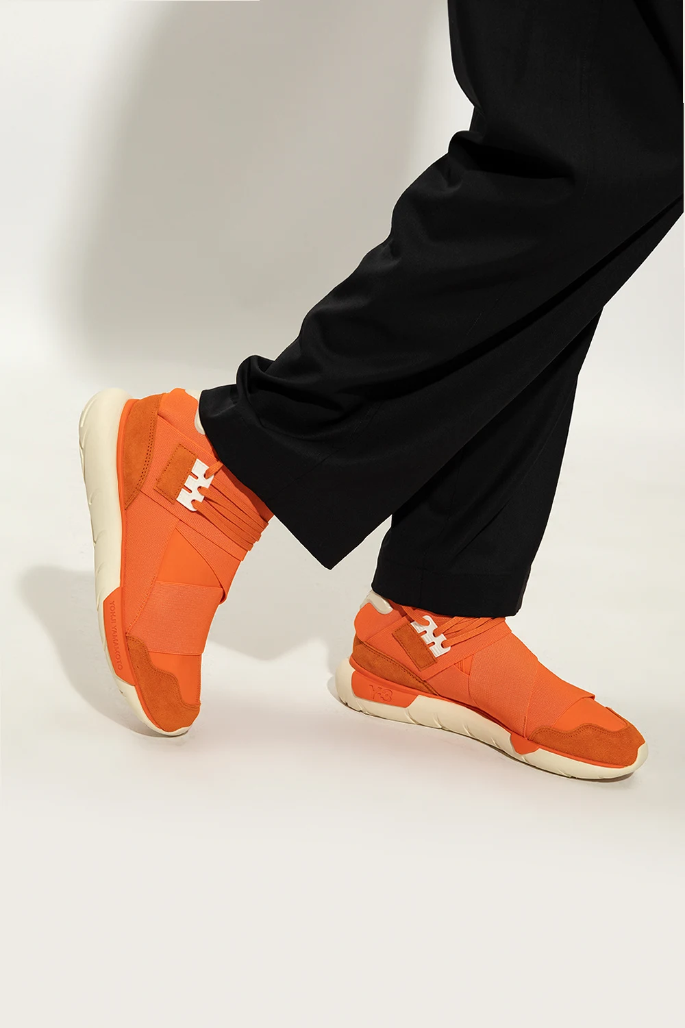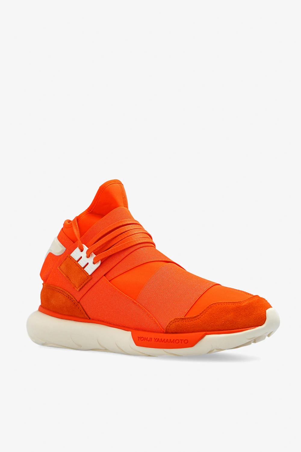 Orange ‘Qasa’ sneakers from Y-3 Yohji Yamamoto. Crafted from fabric and leather, this lace-up model sits on a cream and orange rubber sole and showcases an elastic tape on the front and an embossed logo.