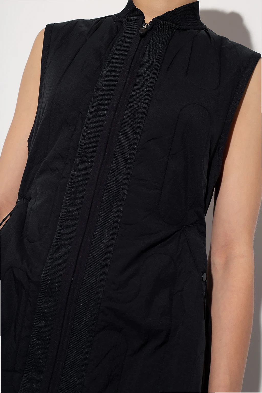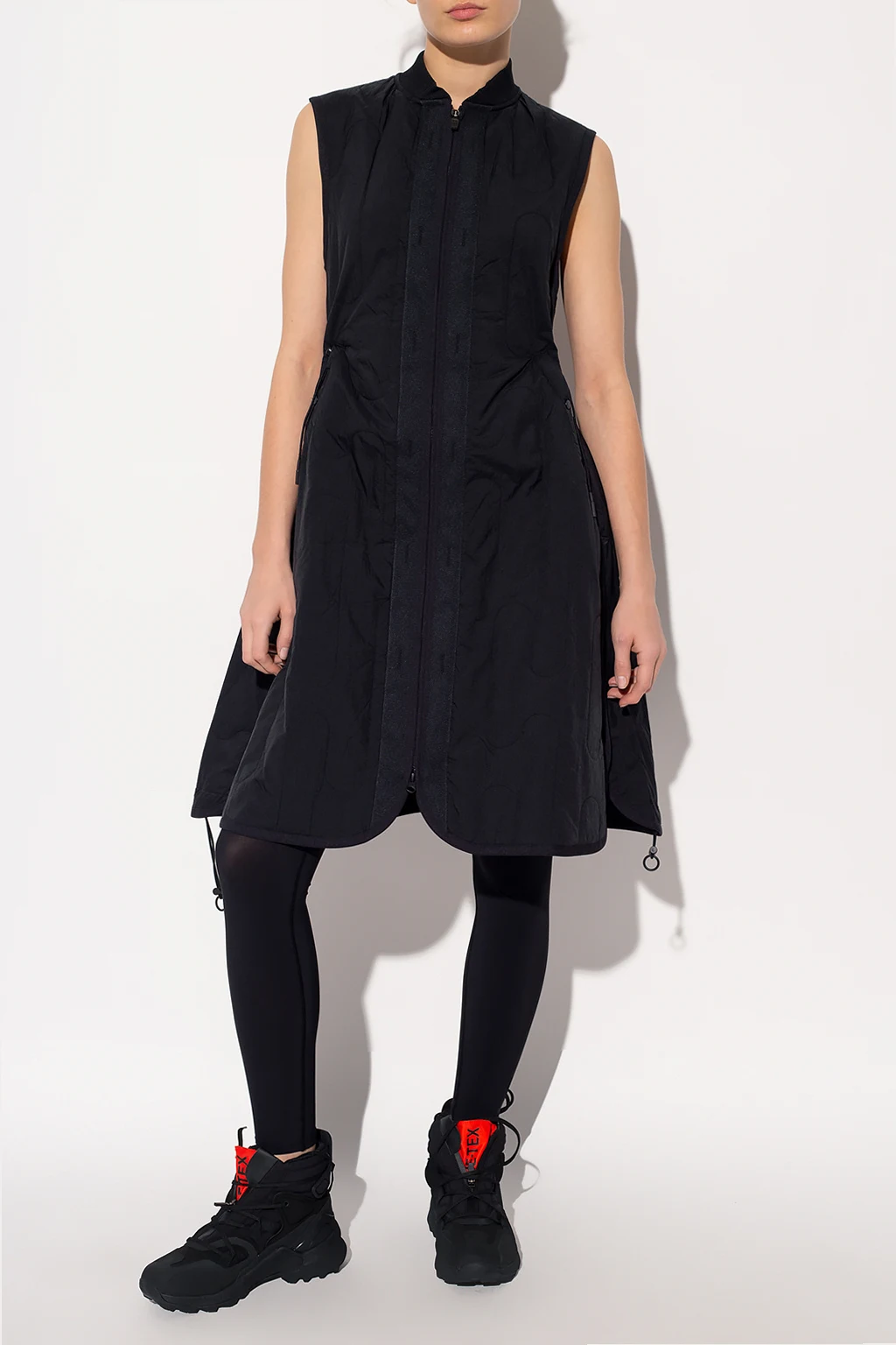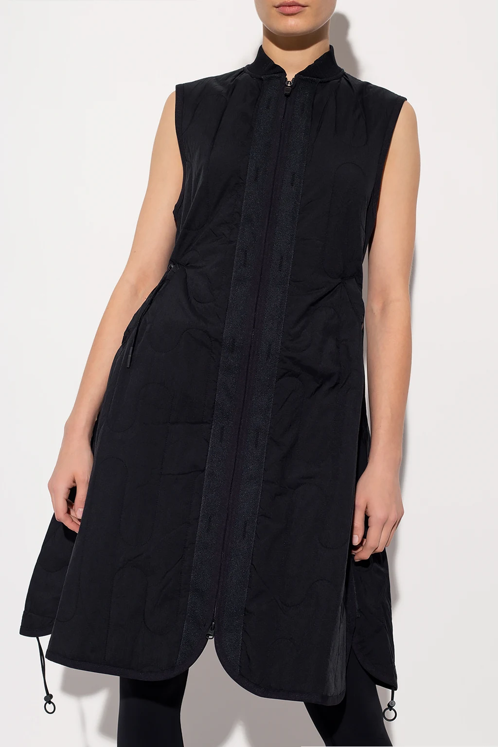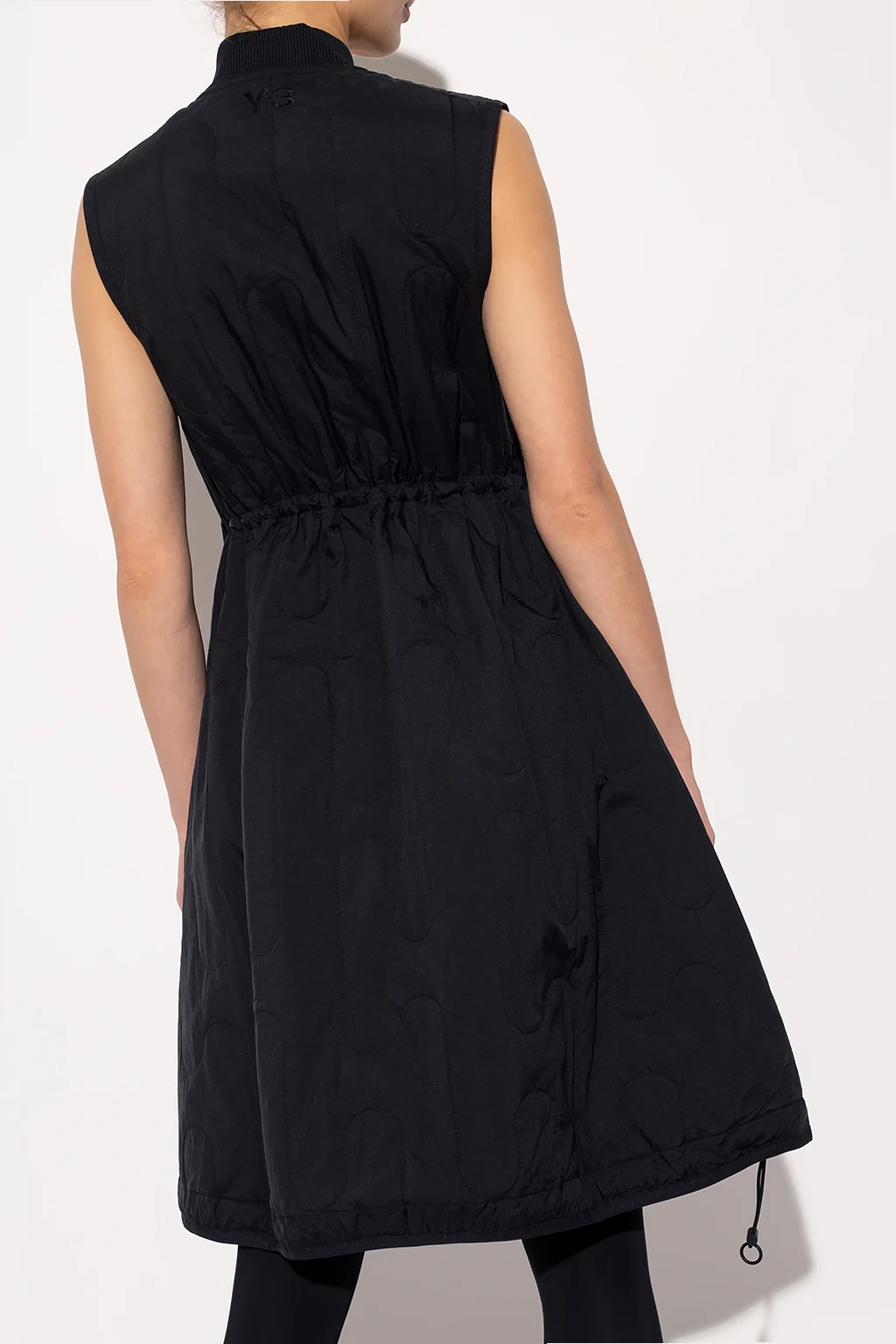 Black sleeveless quilted dress with thermal insulation properties from Y-3 Yohji Yamamoto. Fastened with a two-way zip, this garment features a logo embroidery, two snap-fastened pockets, zips on the sides and a drawstring hem.