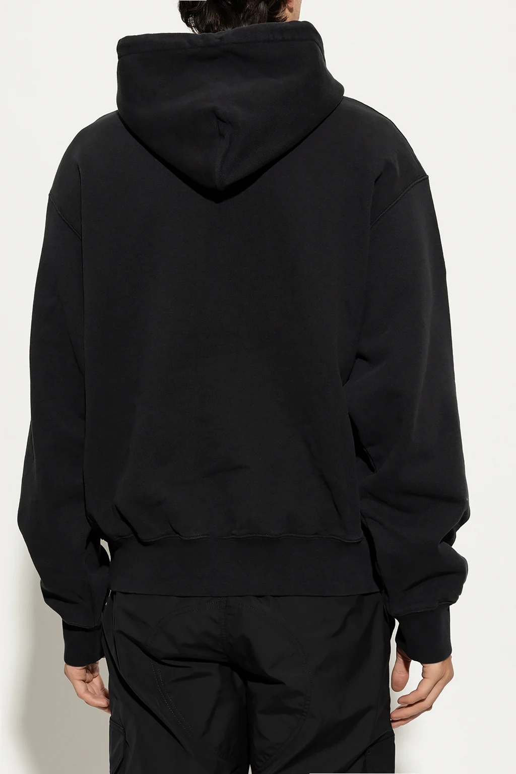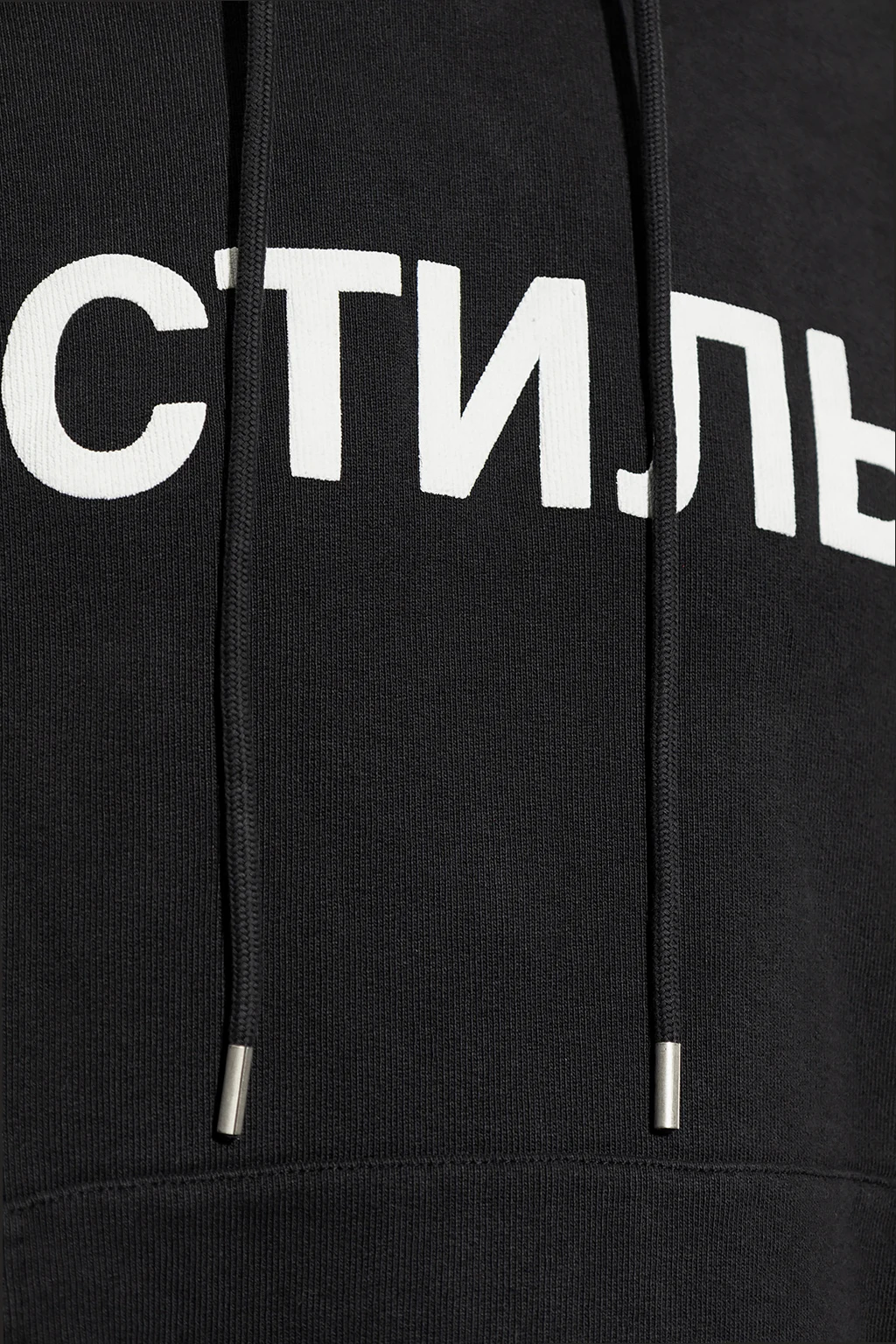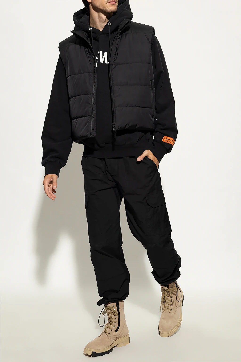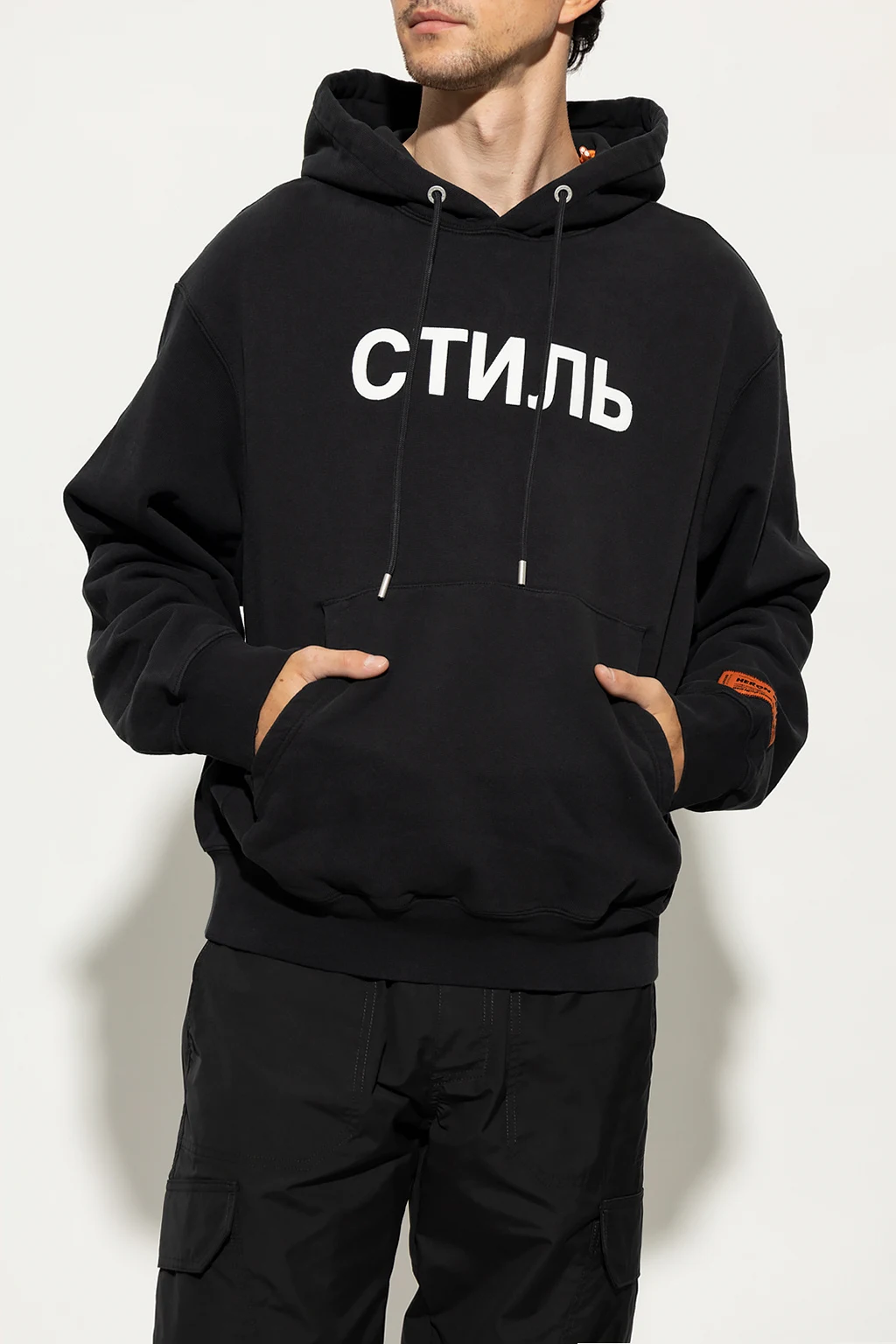 Black hoodie from Heron Preston. Made of cotton, this garment features a white logo print, drawstring hood, slip pocket and ribbed trims at the hem and cuffs.