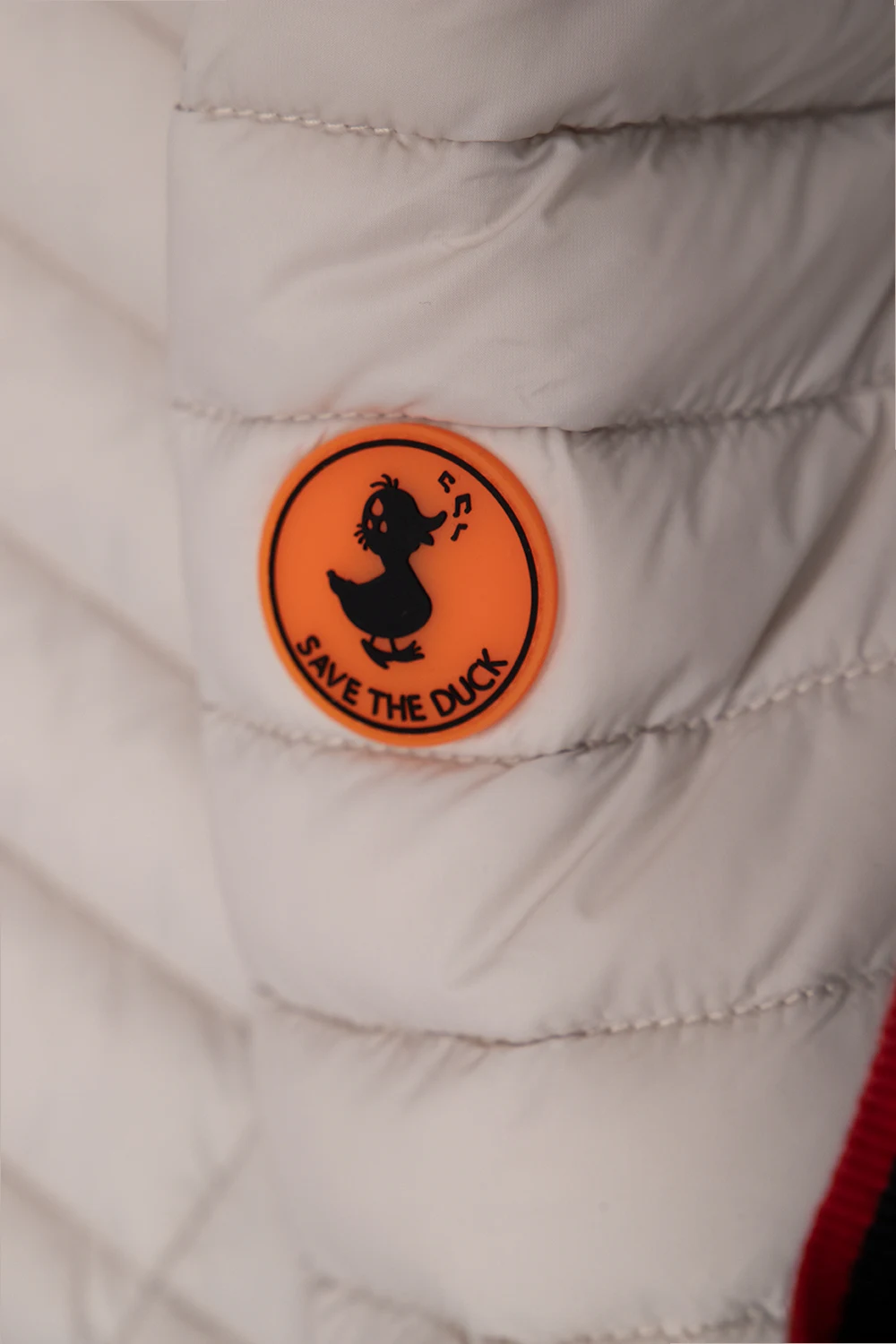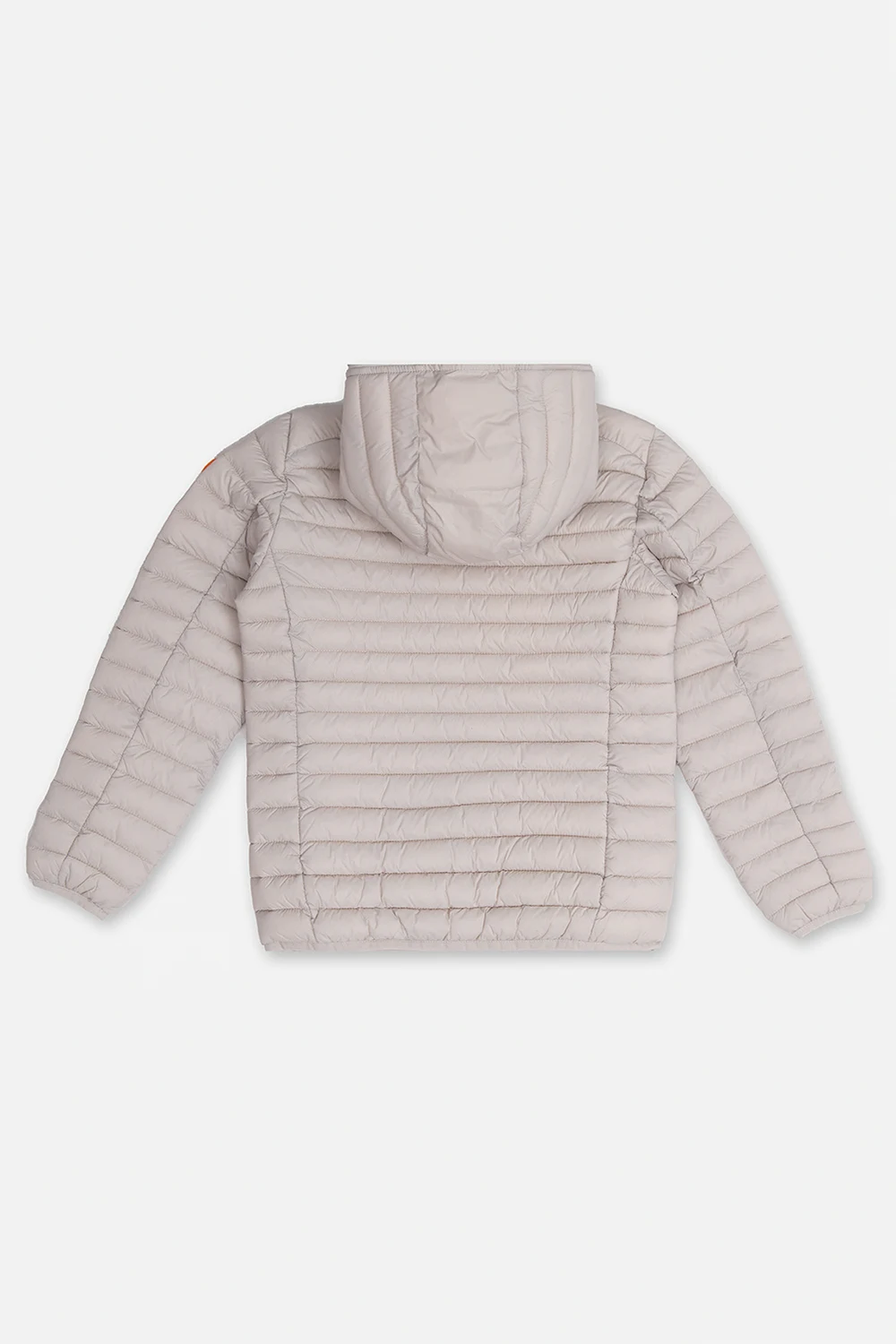 Light grey ‘Ana’ quilted jacket from Save The Duck Kids. Fastened with a zip, this garment features two front zip pocket, light purple lining and long sleeves with a rubber logo patch.