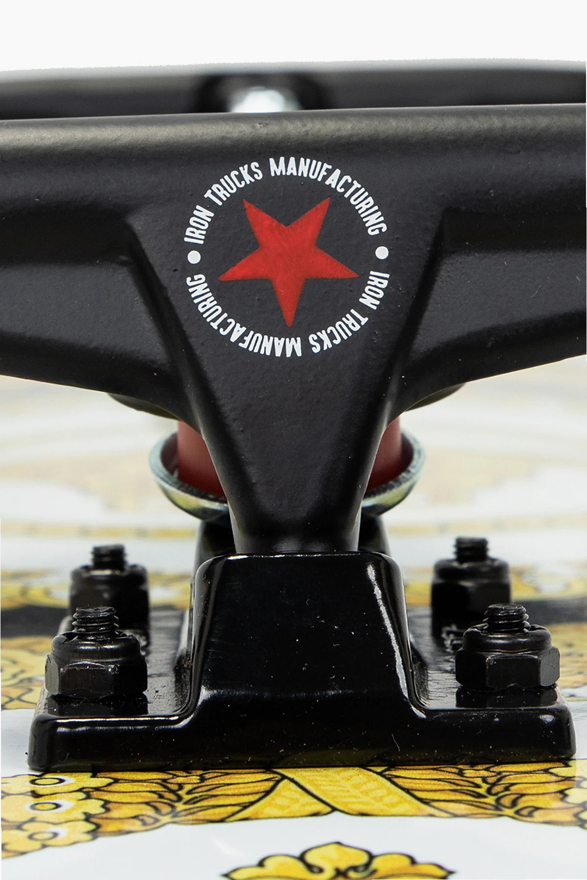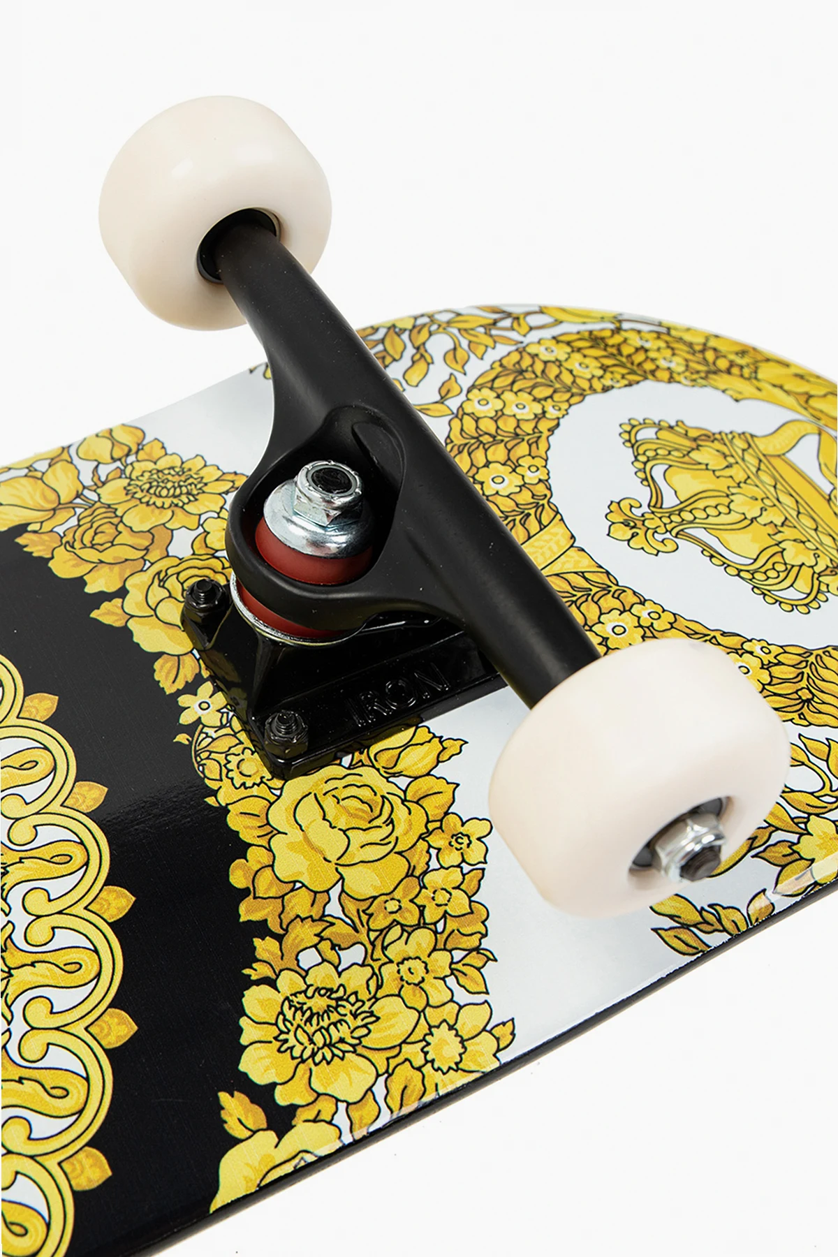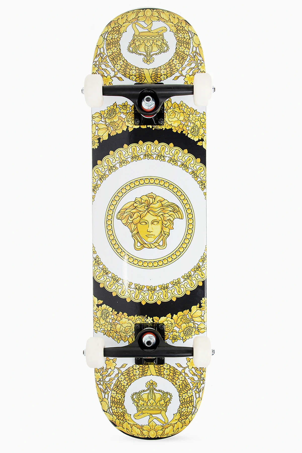 Black, white and gold-tone skateboard from Versace Home. Crafted from wood, this item showcases the label’s signature Baroque motif and Medusa head.