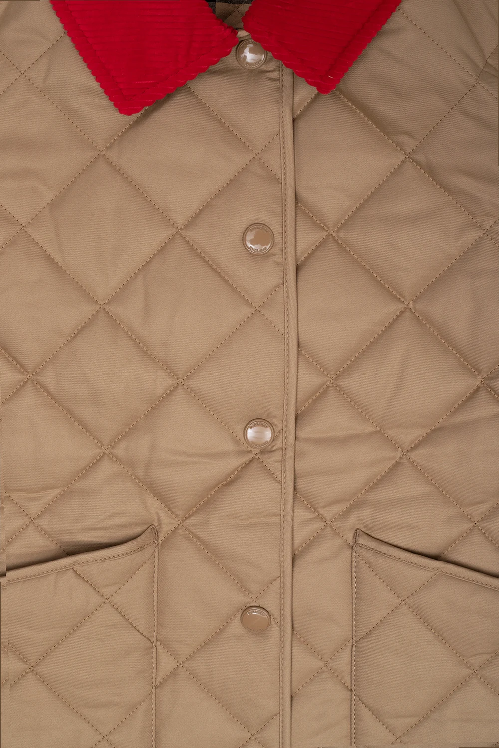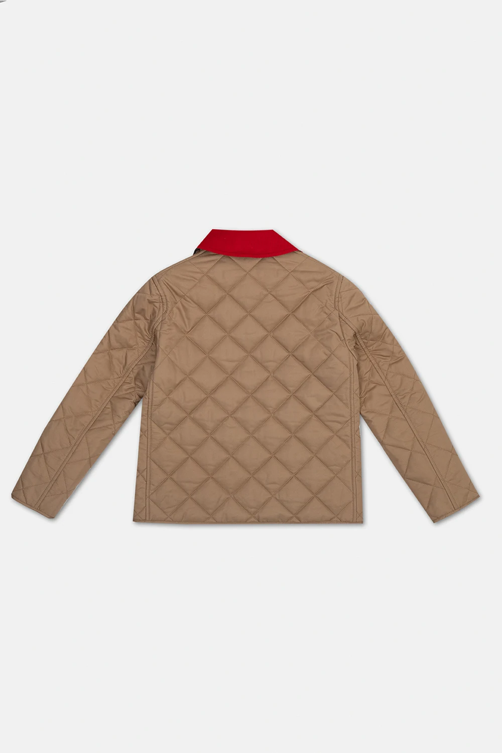 Beige ‘Daley’ quilted jacket from Burberry Kids. Made of cotton. Fastened with snaps, this garment is complete with a cotton outer layer, red corduroy collar and two slip pockets.