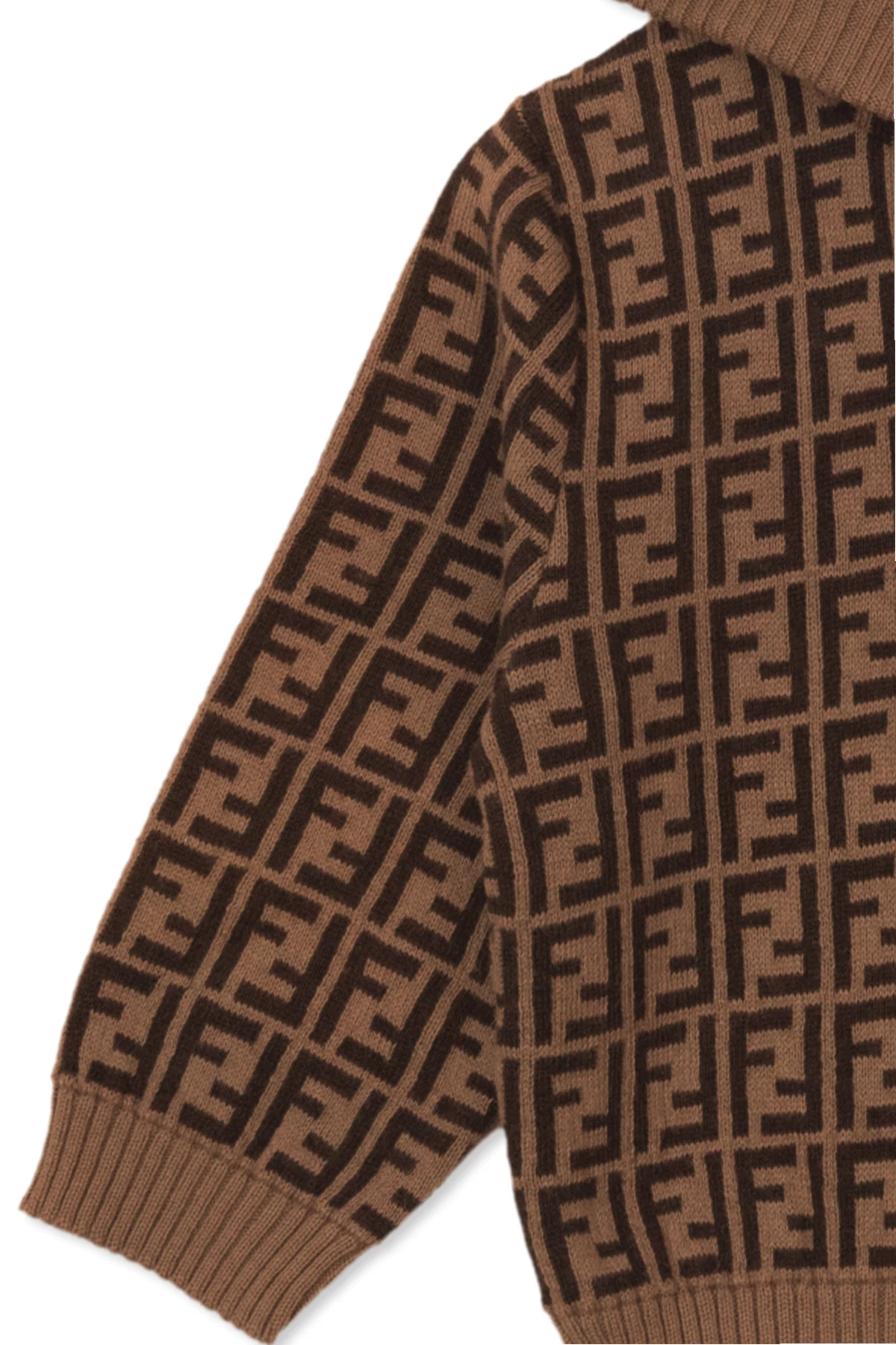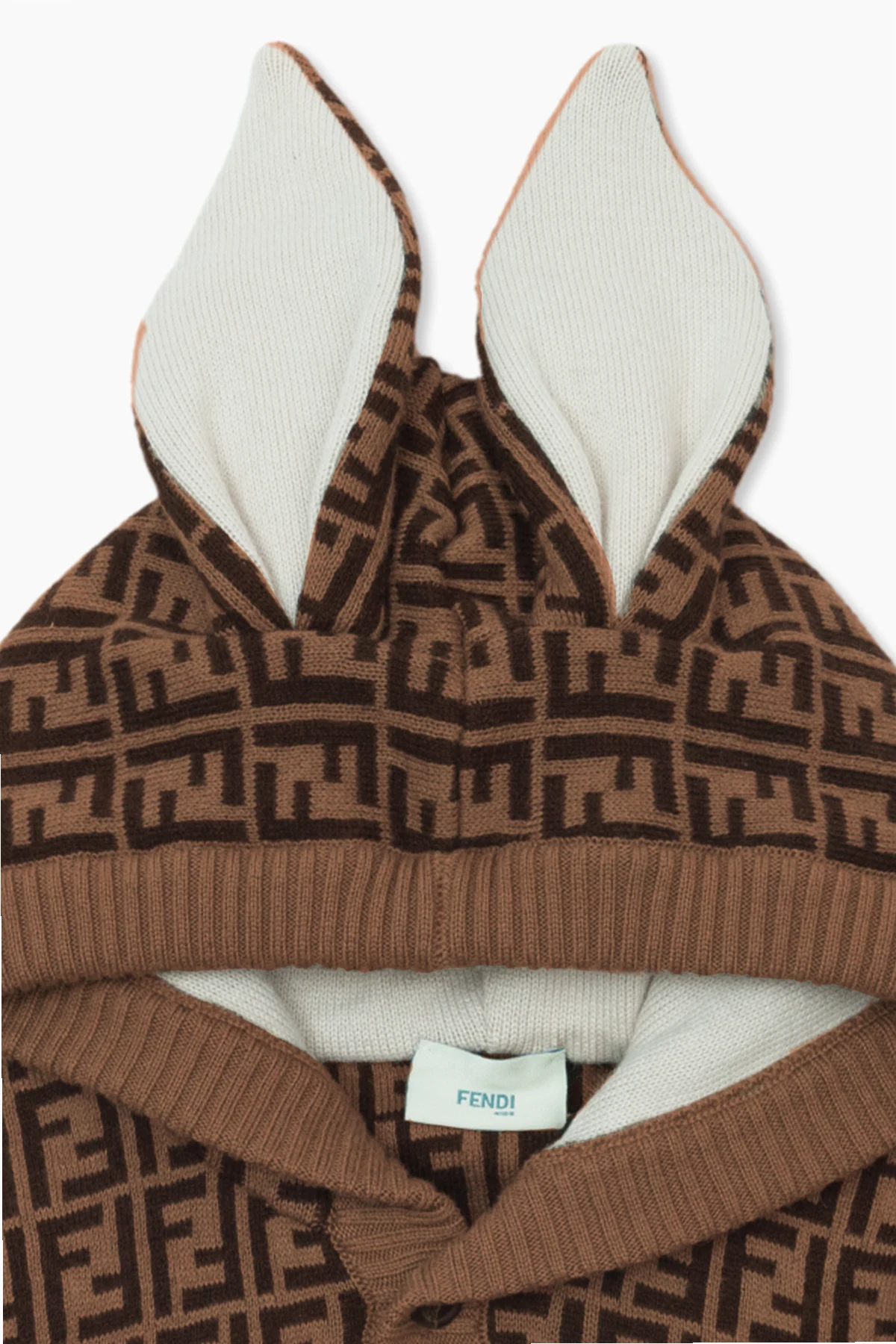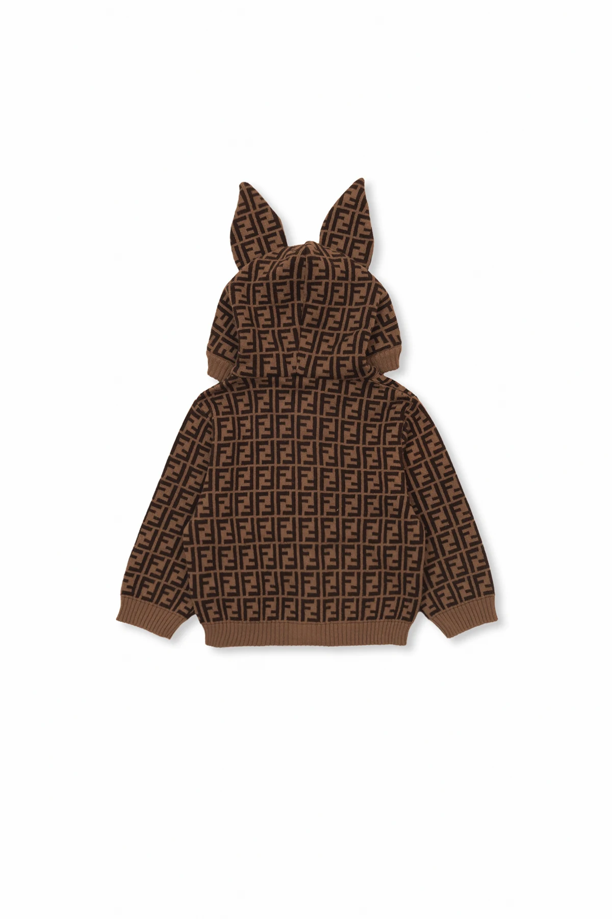 Brown cardigan from Fendi Kids. Crafted from a cotton and cashmere blend, this style showcases a logo pattern, patches with an animal motif on the hood and ribbing on the bottom hem and long sleeves.