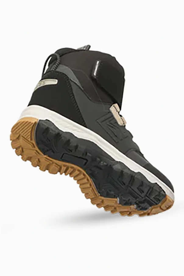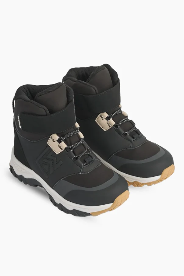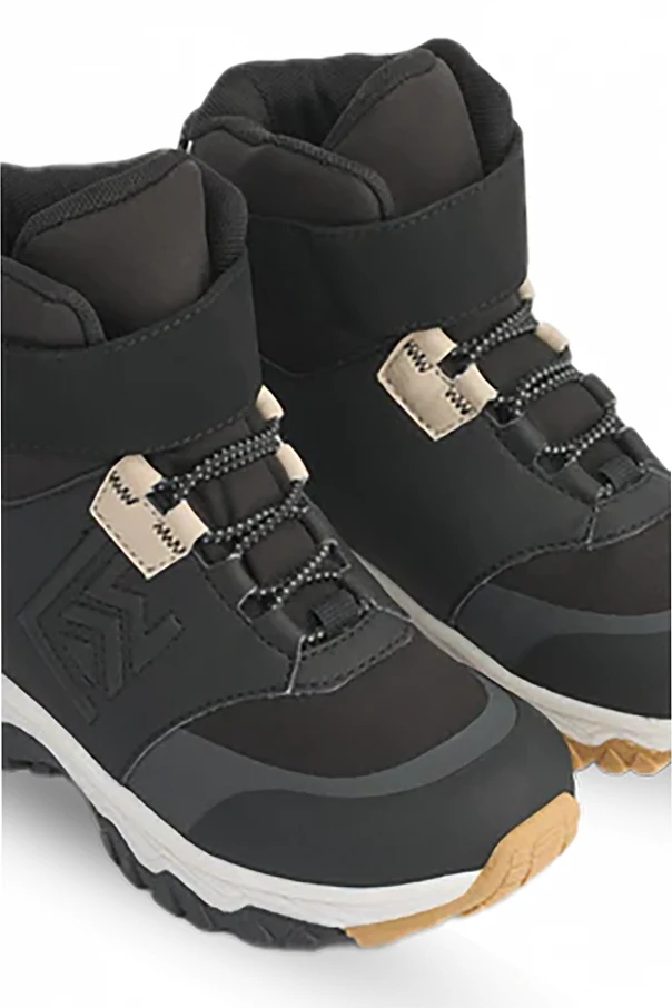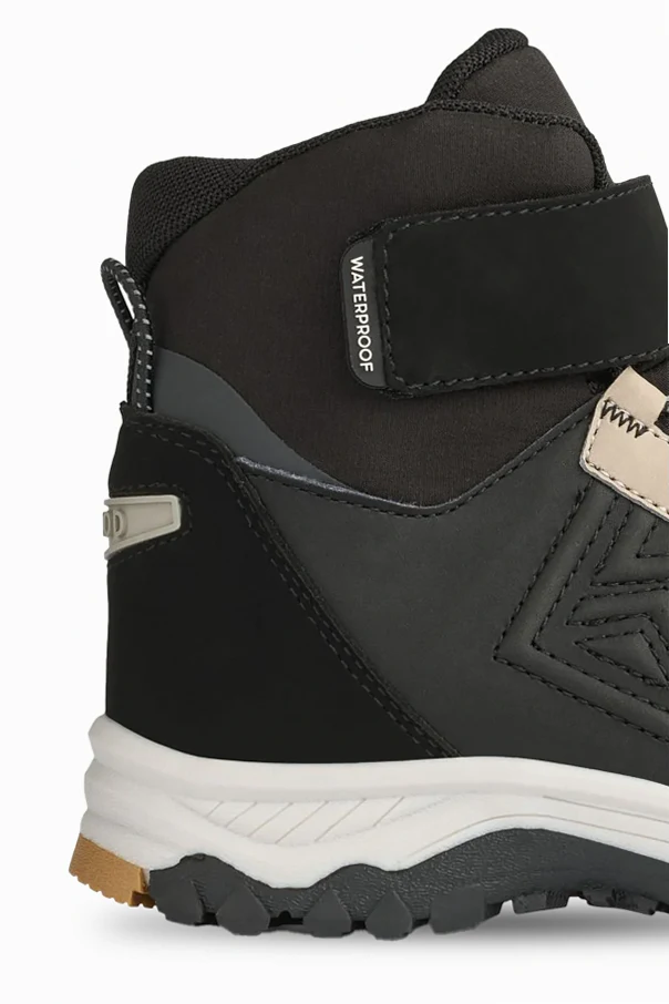 Auffällig sind die Elemente in einem kontrastierenden, beigen Farbton direkt am Verschluss, die dem Gesamteindruck eine besondere Note verleihen. Der Schaft aus modernen, wasserdichten Stoffen und synthetischen Materialien garantiert effektiven Schutz vor Feuchtigkeit – dies wird durch die sichtbare Kennzeichnung "WATERPROOF" bestätigt. Der weich gepolsterte Kragen sowie die robuste Gummisohle mit ausgeprägtem Profil sorgen für Komfort und Sicherheit bei jedem Schritt.