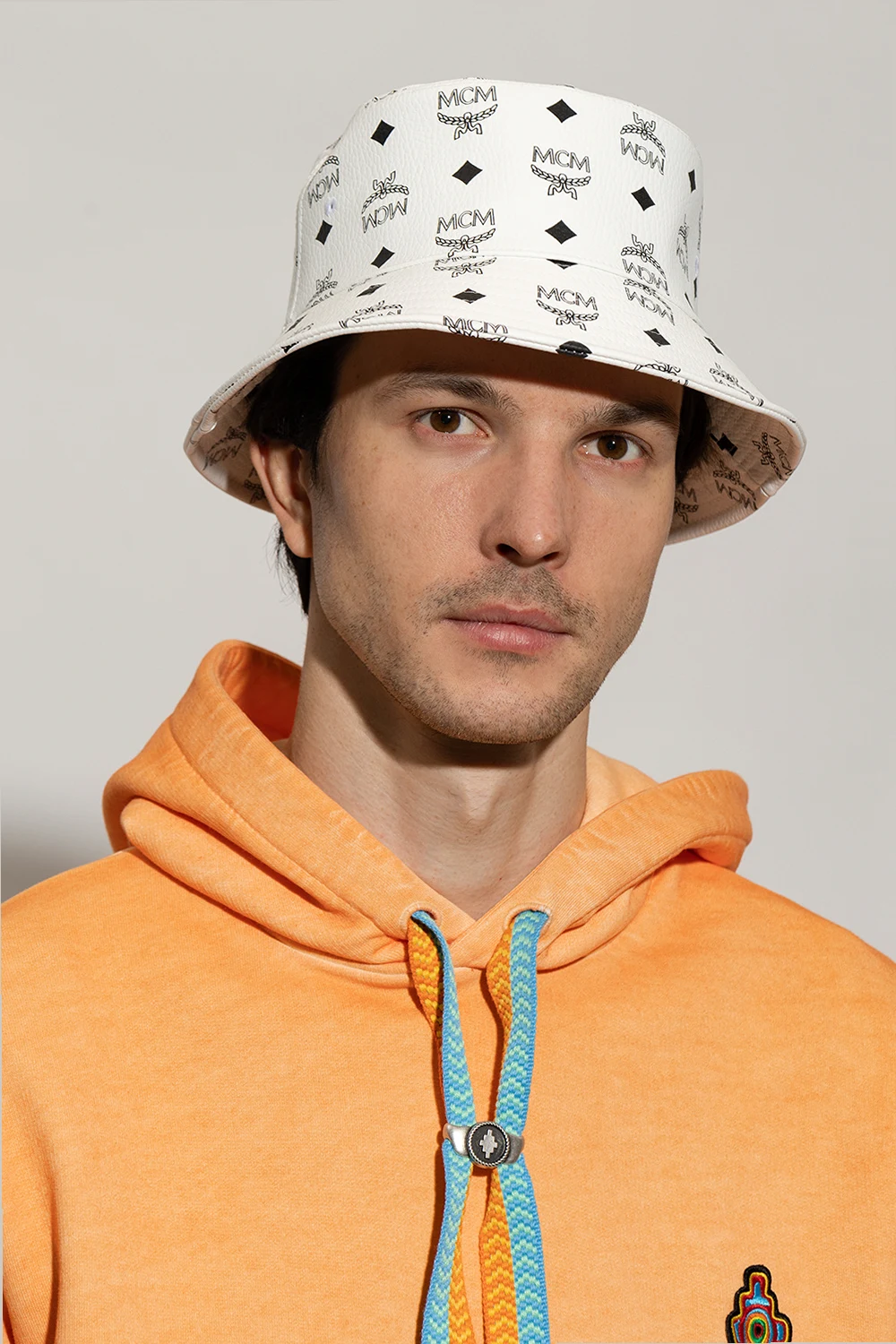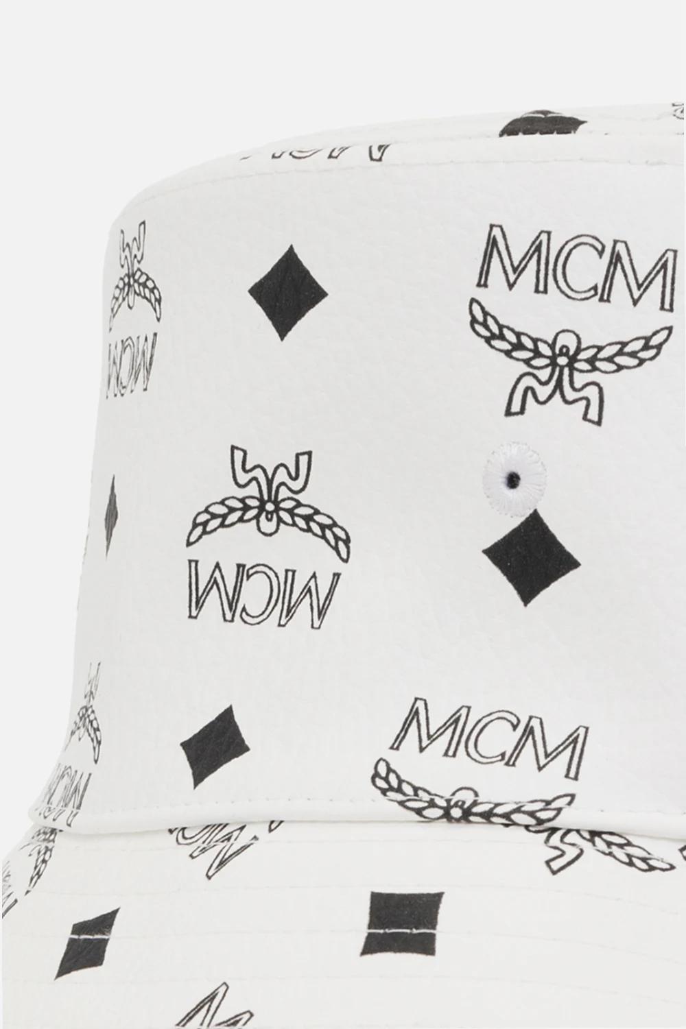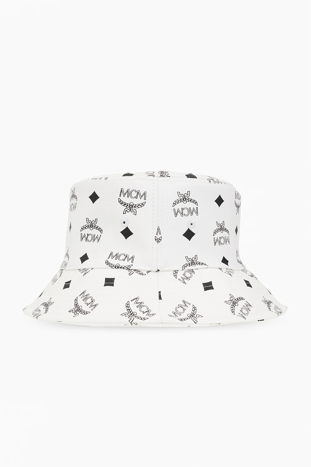 White and black bucket hat from MCM. Made of the brand’s signature coated canvas with the Visetos monogram.