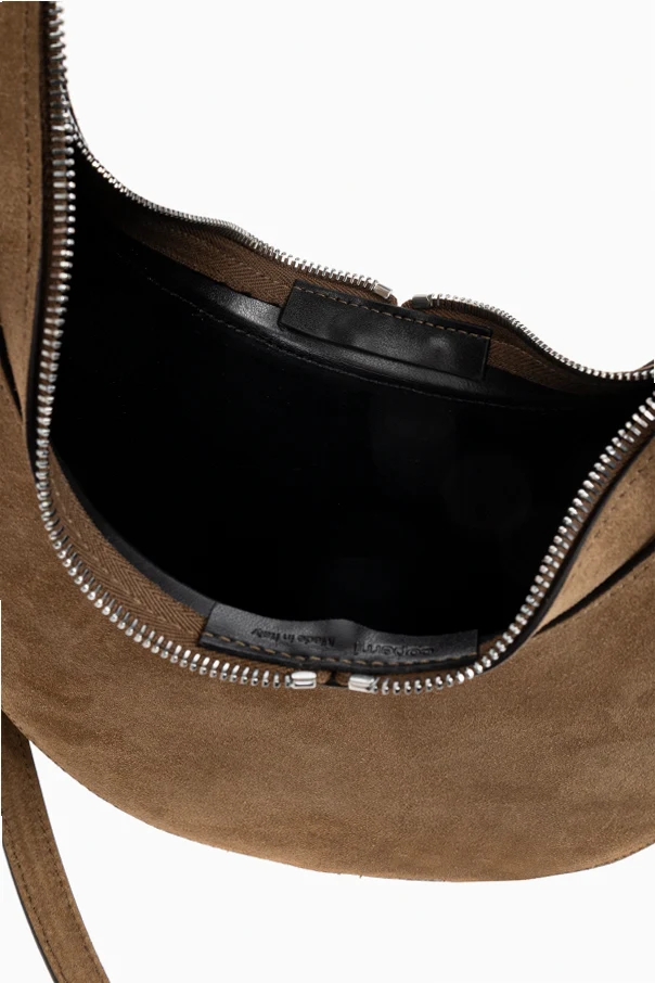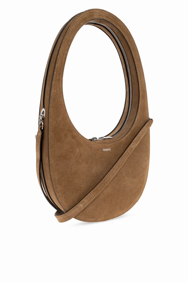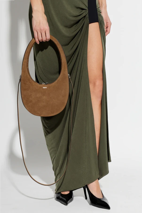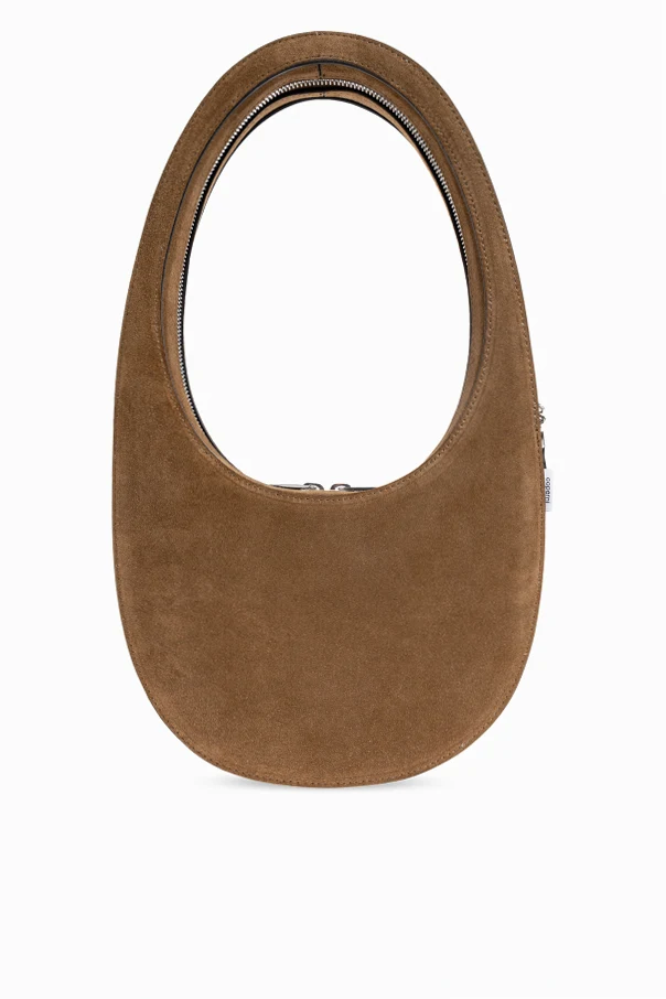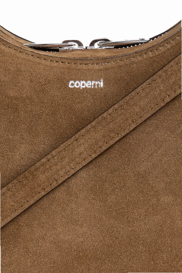 Die Schultertasche mit Logo von Coperni ist die Quintessenz moderner, Pariser Eleganz, eingefangen in einer dezent ovalen Form. Die raffinierte Silhouette, deren Griff harmonisch in den Korpus übergeht, besticht durch ein anspruchsvolles Design, inspiriert vom Minimalismus und der Architektur. Sorgfältig gefertigt aus weichem, mattem Wildleder in Braun , begeistert sie mit einer einheitlichen Oberfläche, die auf überflüssige Verzierungen verzichtet – der Blickfang ist einzig das kleine, silberne „coperni“-Logo, das zentral unter dem Griff platziert ist.