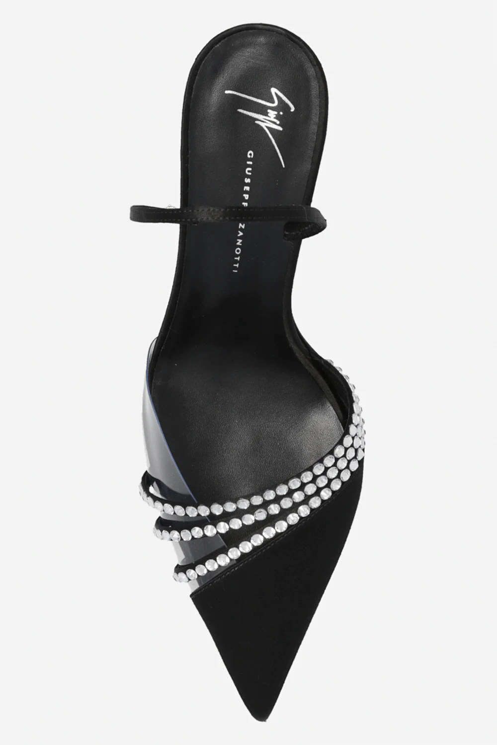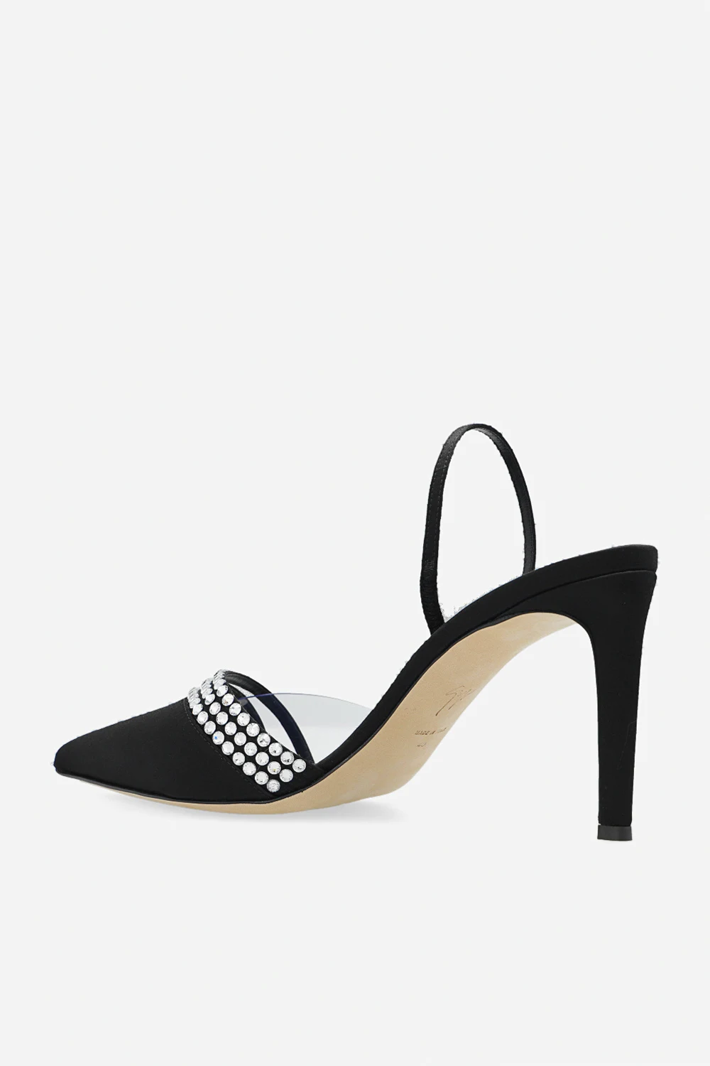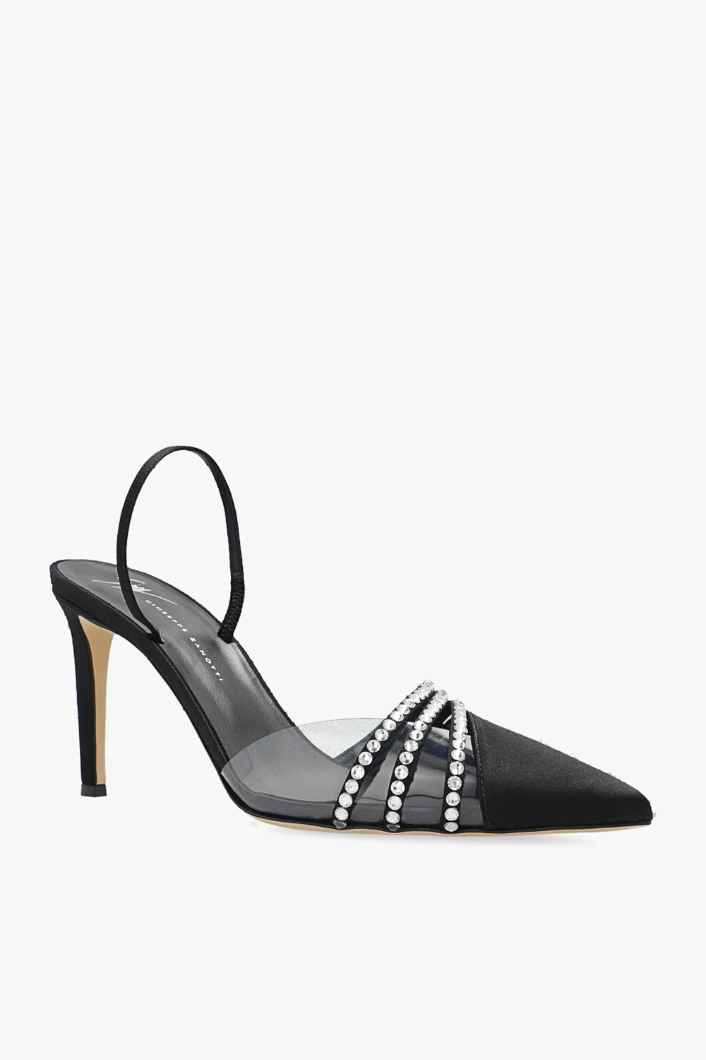 Black ‘Audrine’ pumps from Giuseppe Zanotti. Crafted from satin, this pair features a transparent insert, straps embellished with crystals, pointed toe and cream leather sole.