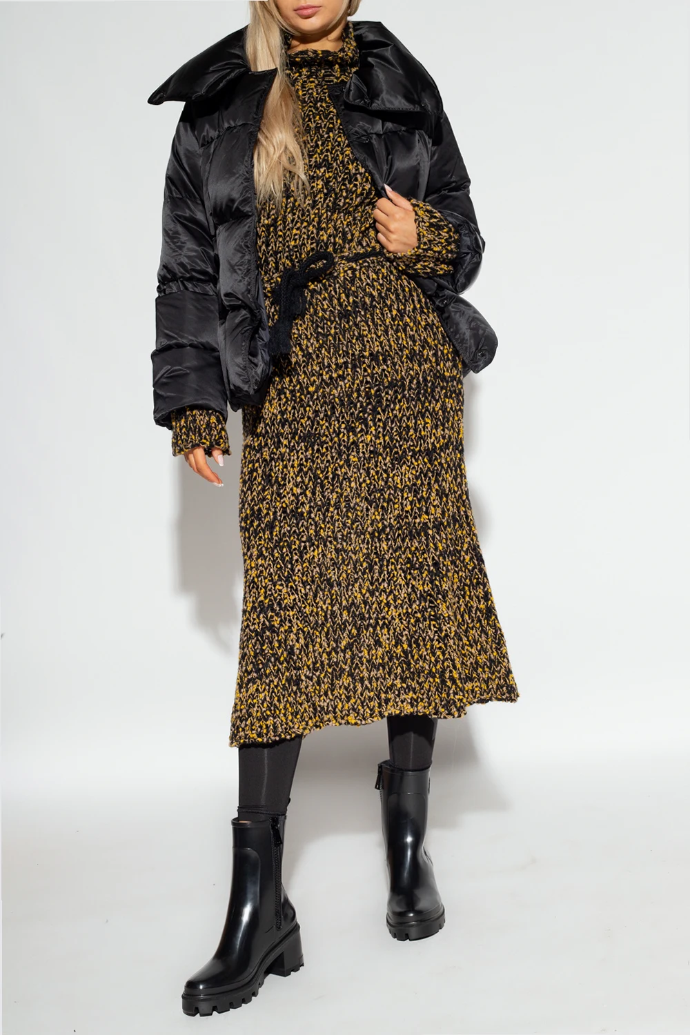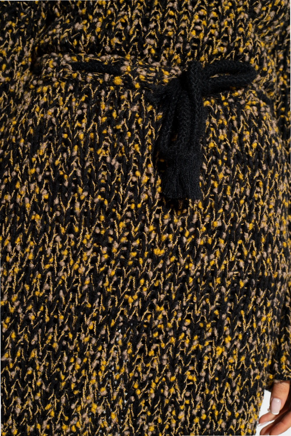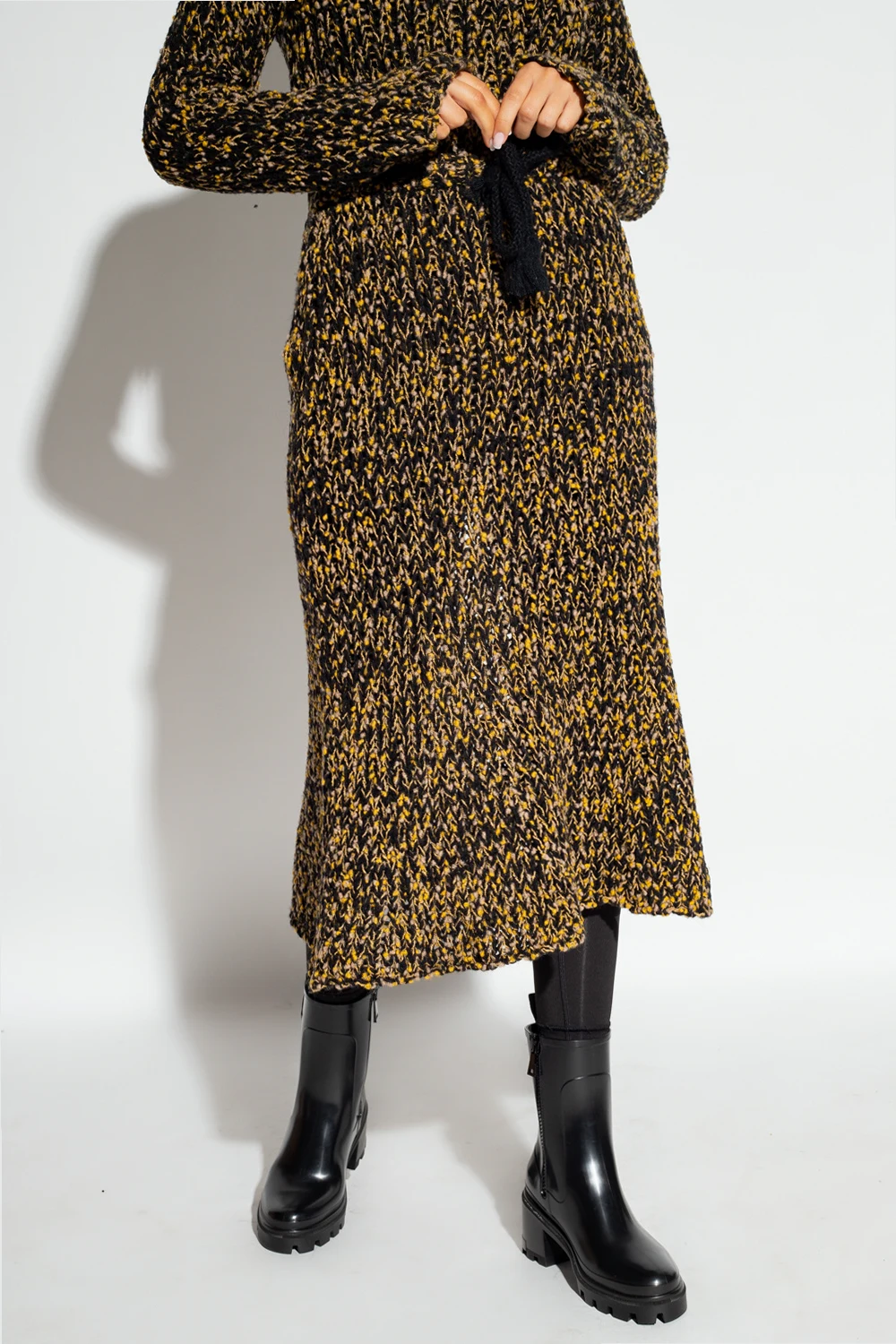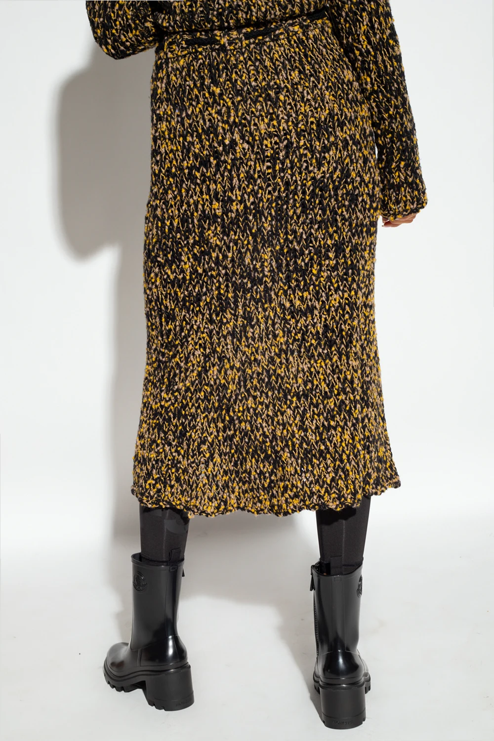 Black, yellow and beige ‘Gonna’ skirt from Moncler Genius, the ‘2 Moncler 1952’ collection. Crafted from wool with a transparent finish, this style features a ribbed texture and a drawstring waist.