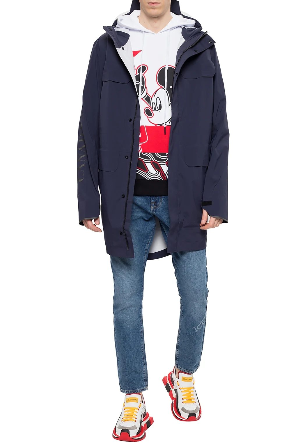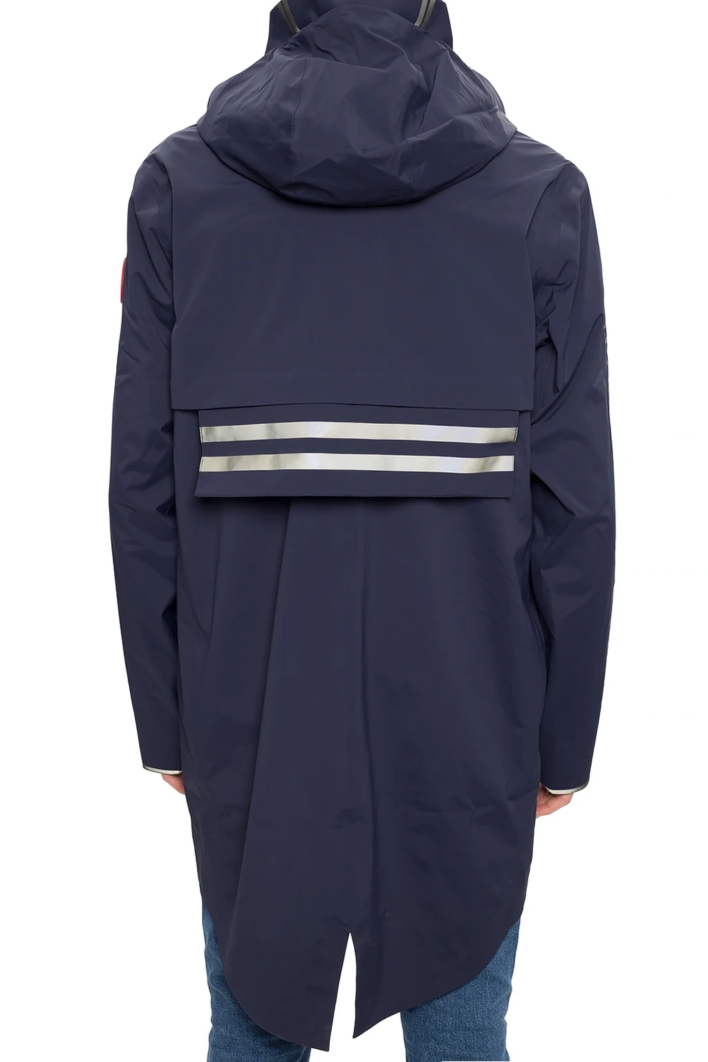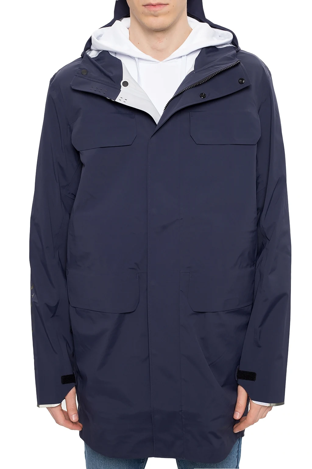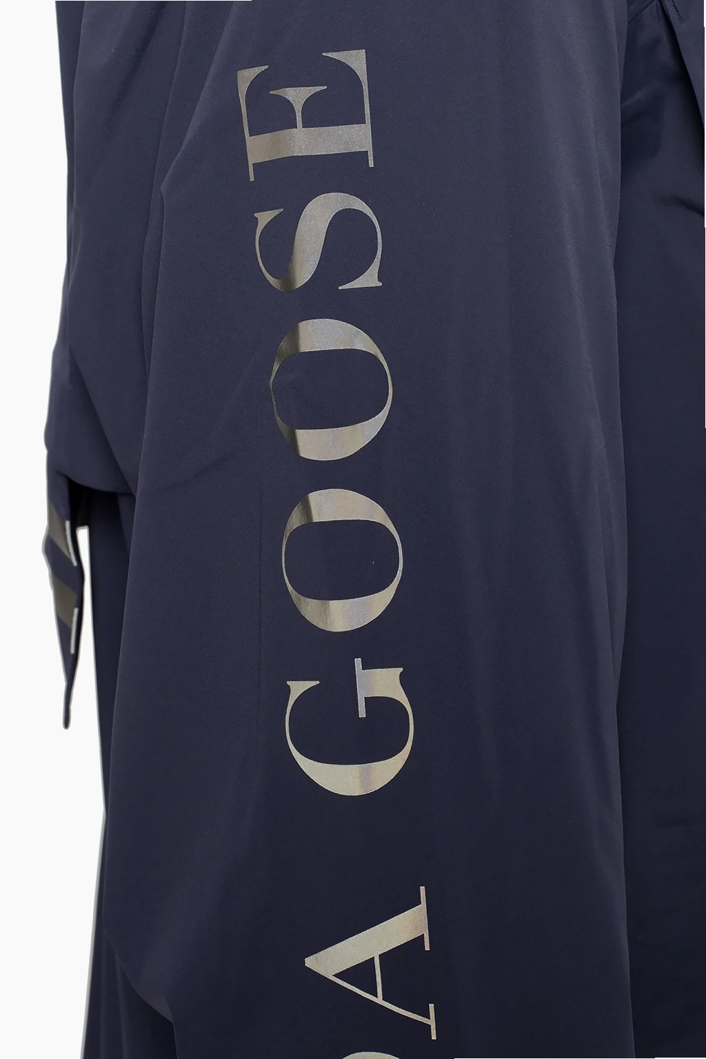 Navy ‘Seawolf’ asymmetrical hooded jacket from Canada Goose. Fastened with a two-way zip and snaps. Sleeves, back and hood decorated with reflective prints. 4 flap pockets fastened with velcro on the front. Applique featuring a logo embroidery in red, white and navy on one sleeve. Temperature range: 5°C to -5°C.