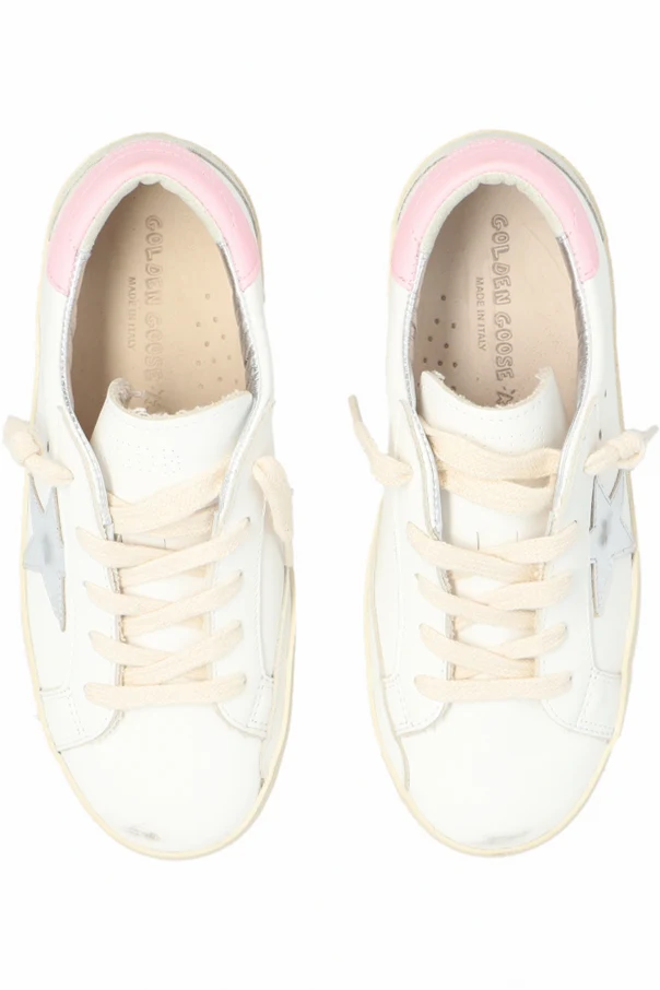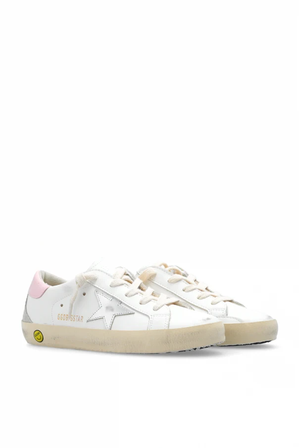 White ‘Super-Star Classic’ distressed sneakers with a vintage effect from Golden Goose Kids. Made of leather, this lace-up pair features the brand's signature star patch in silver-tone, a pink heel counter, logo detail and rubber sole in black and white.