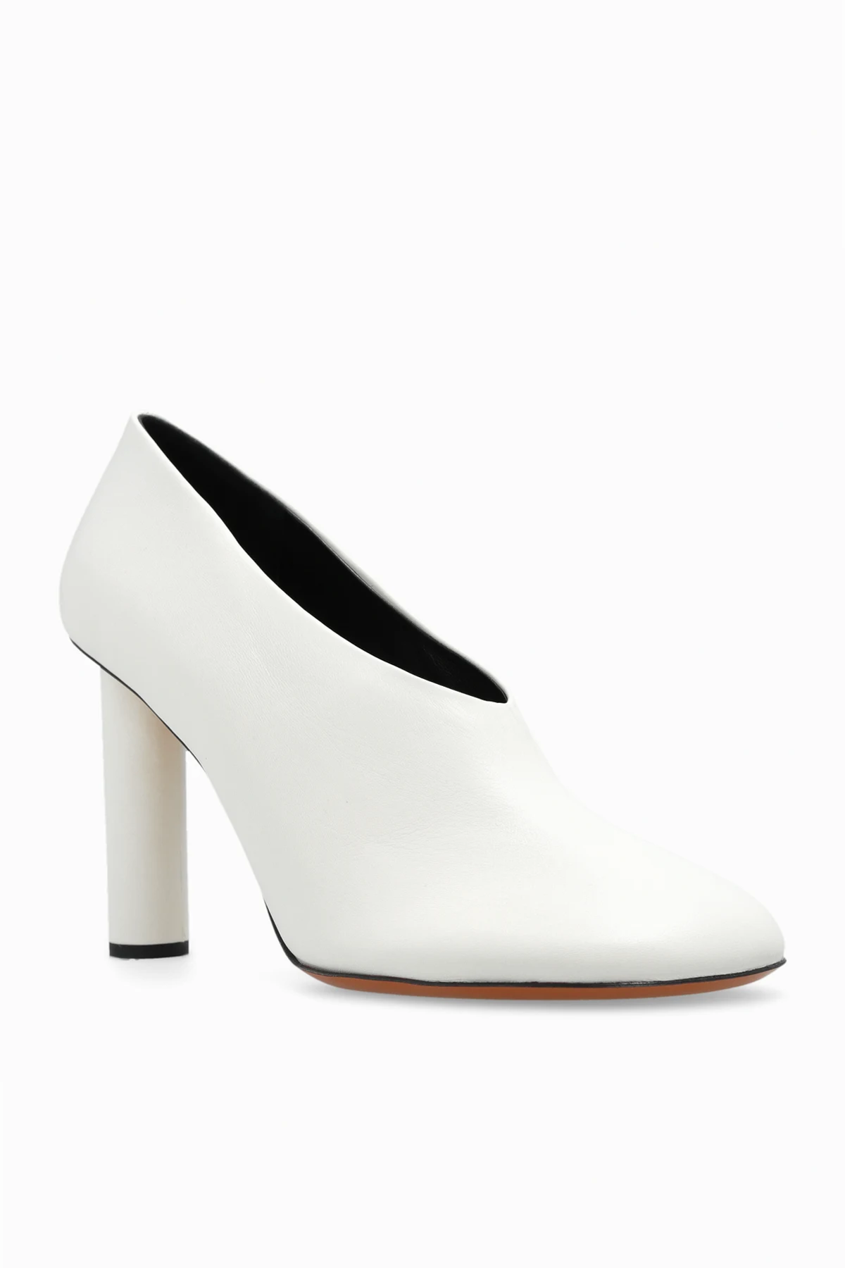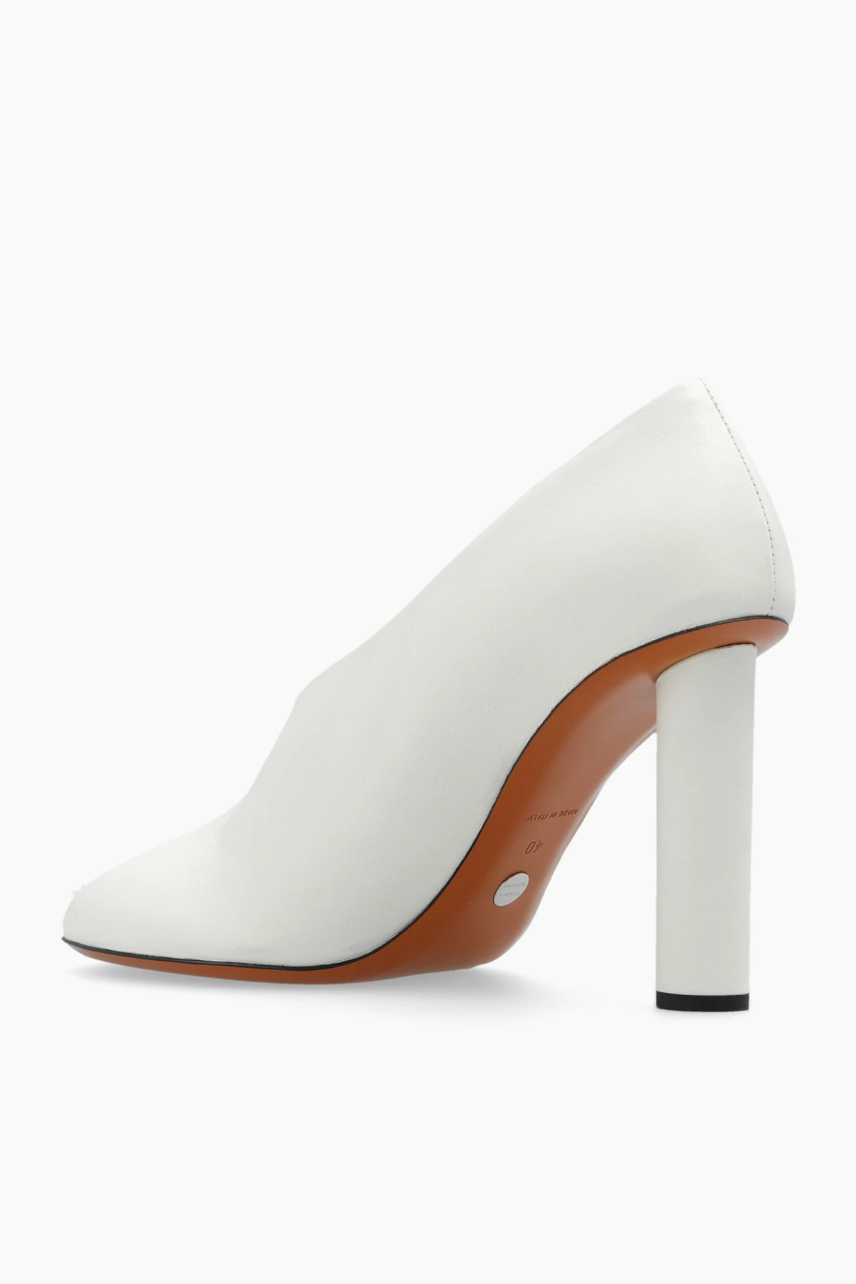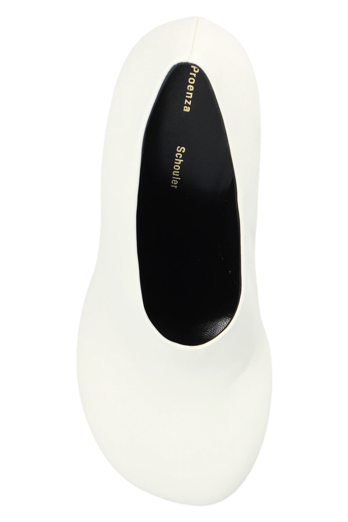 White pumps from Proenza Schouler. Made of leather, this model sits on a brown leather sole and features a round toe.
