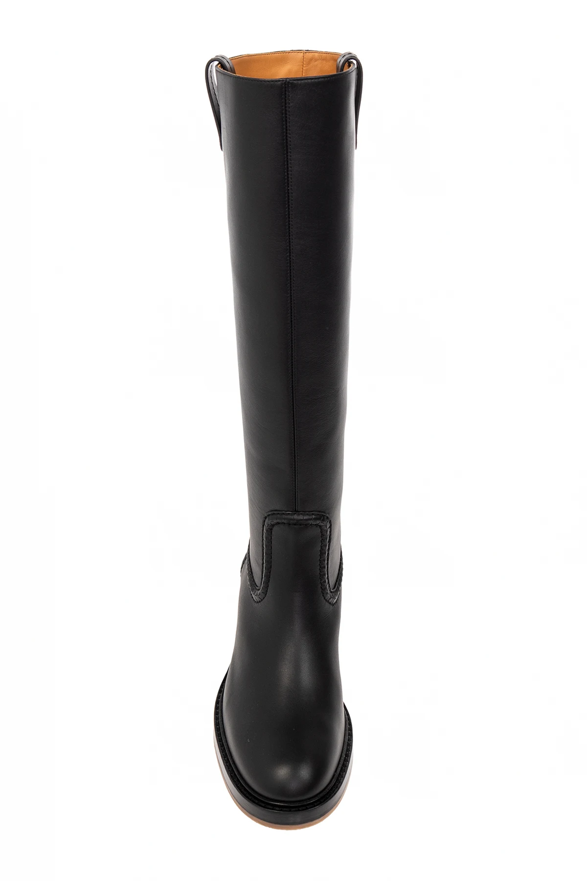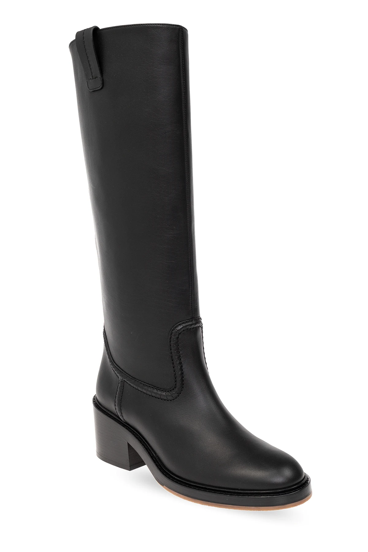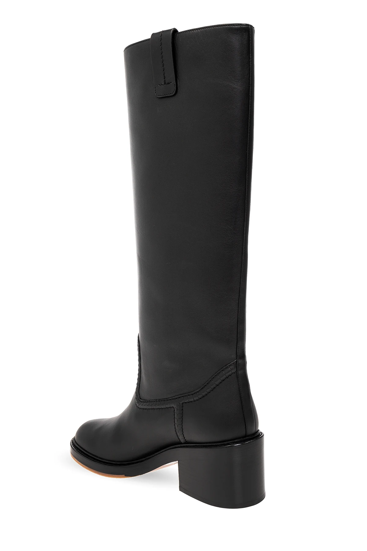 Black ‘Mallo’ heeled boots from Chloe. Made from leather with a slip-on silhouette, this model sits on a beige, brown and black sole in leather and rubber and features decorative stitching details and pull tabs on the sides.