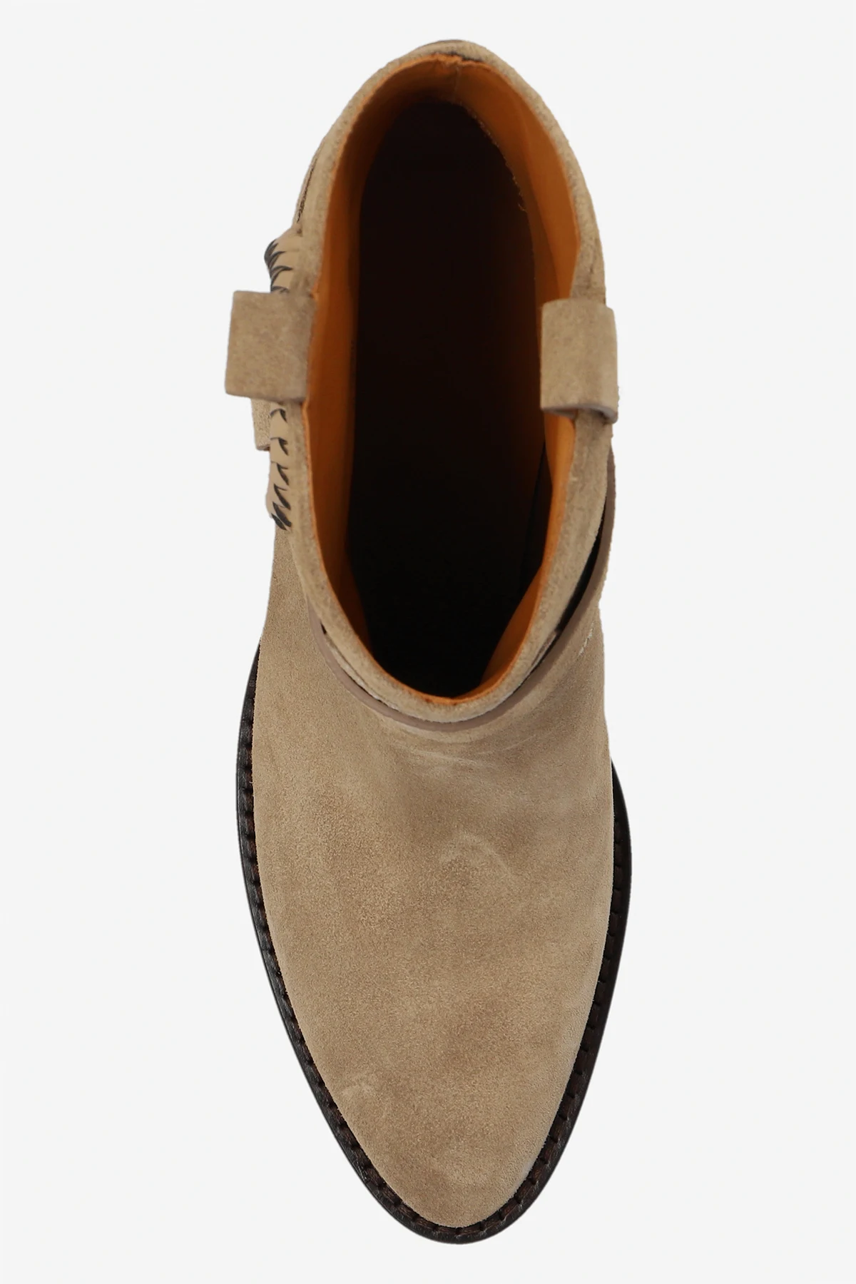 Beige ‘Hana’ cowboy boots from See By Chloe. Made of suede with an almond-shaped toe, this model sits on a black rubber sole and features a gold-tone metal ring with braided detailing.