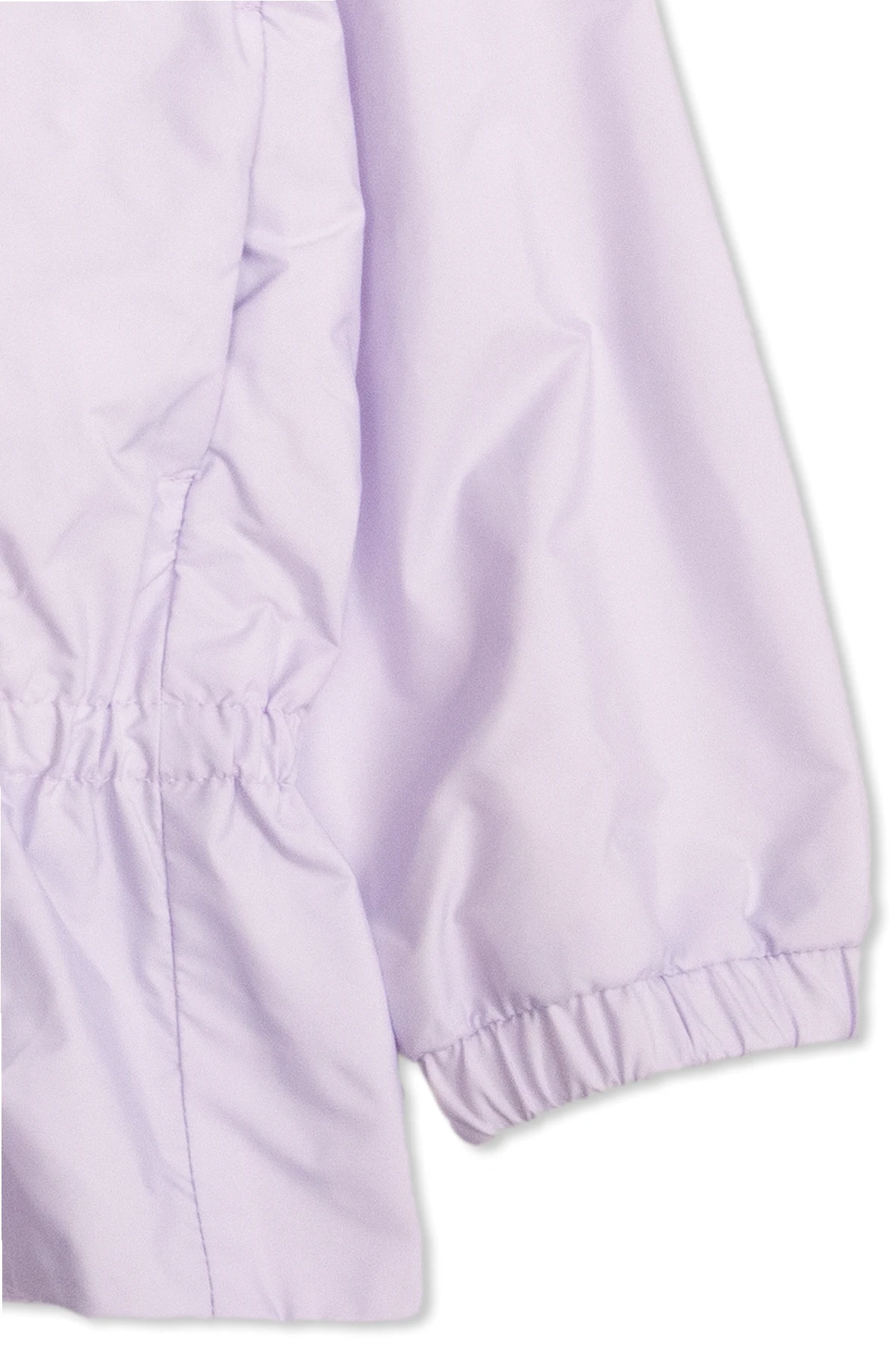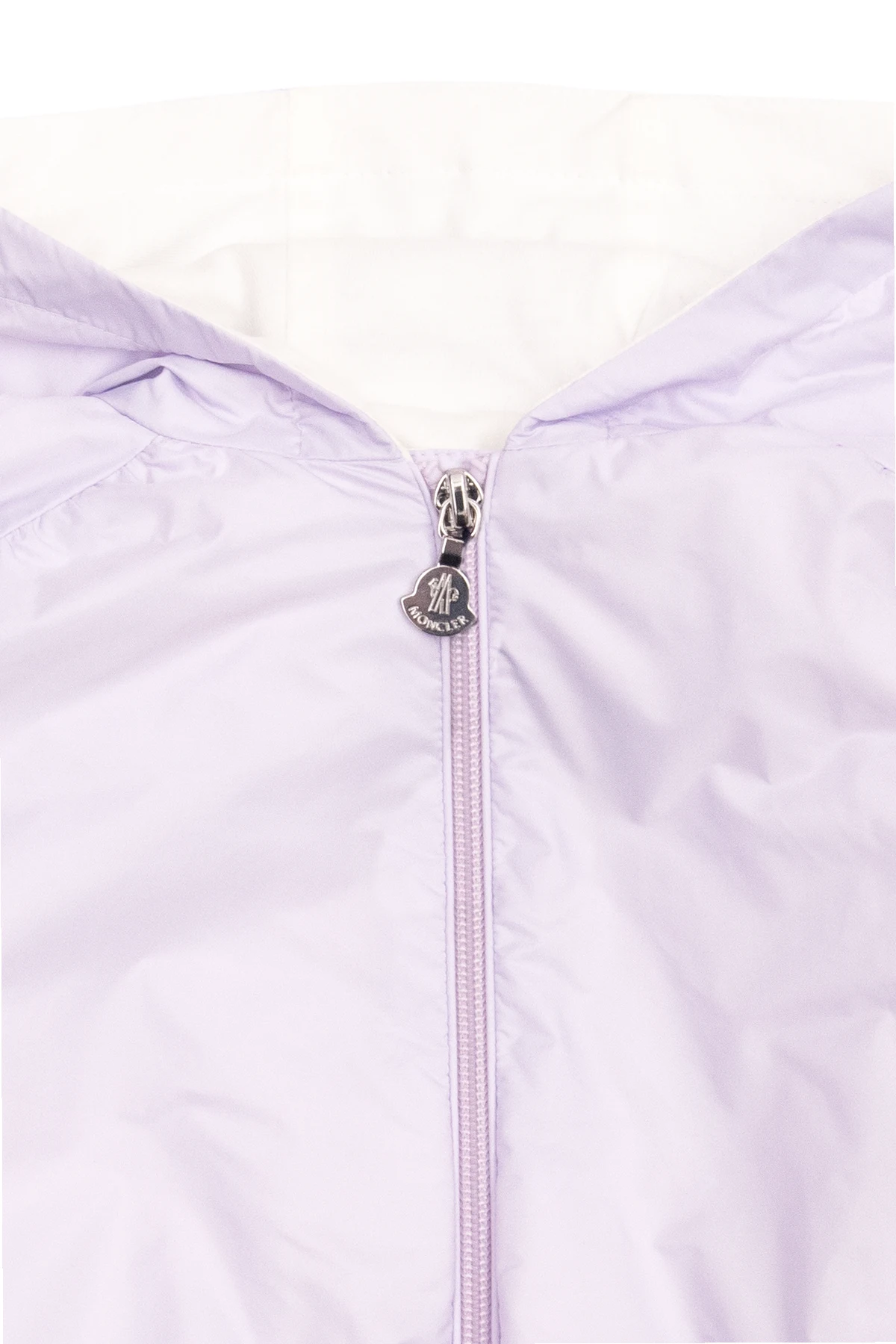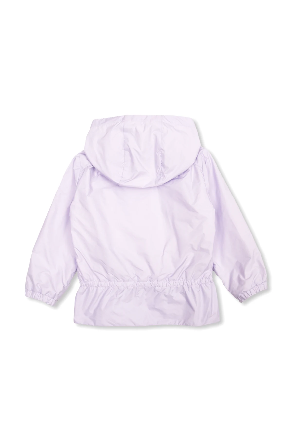 Light purple ‘Marino’ jacket with a hood from Moncler Enfant. Emblazoned with a colourful logo patch on the sleeve, this style features a zip fastening, two frontal pockets and a white cotton lining.