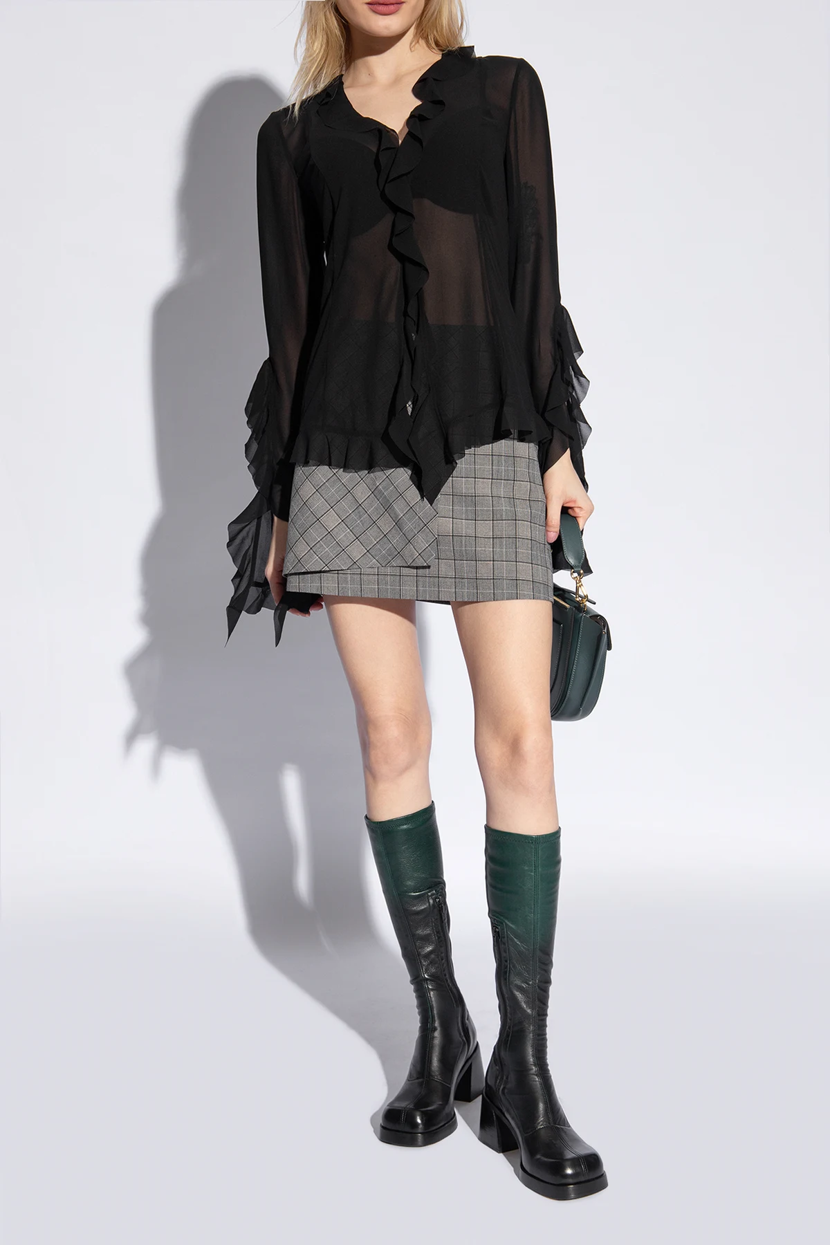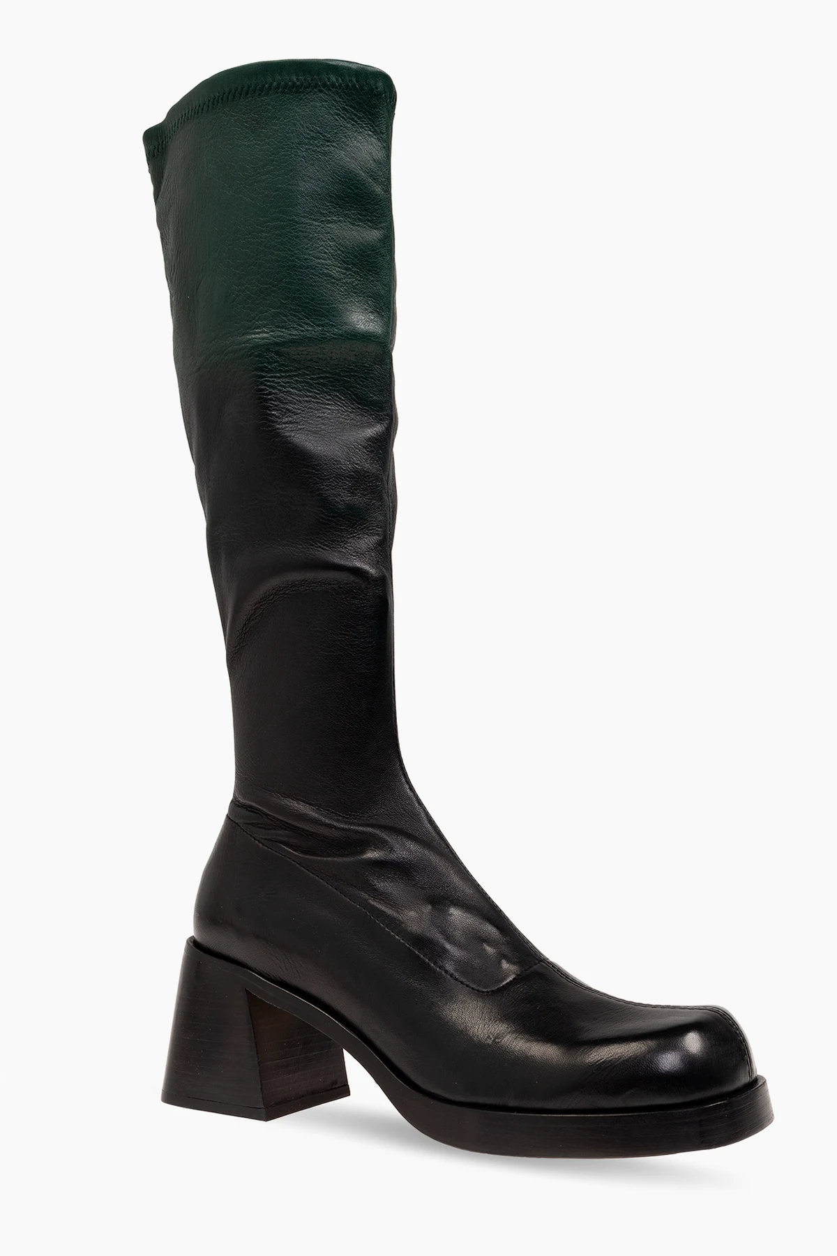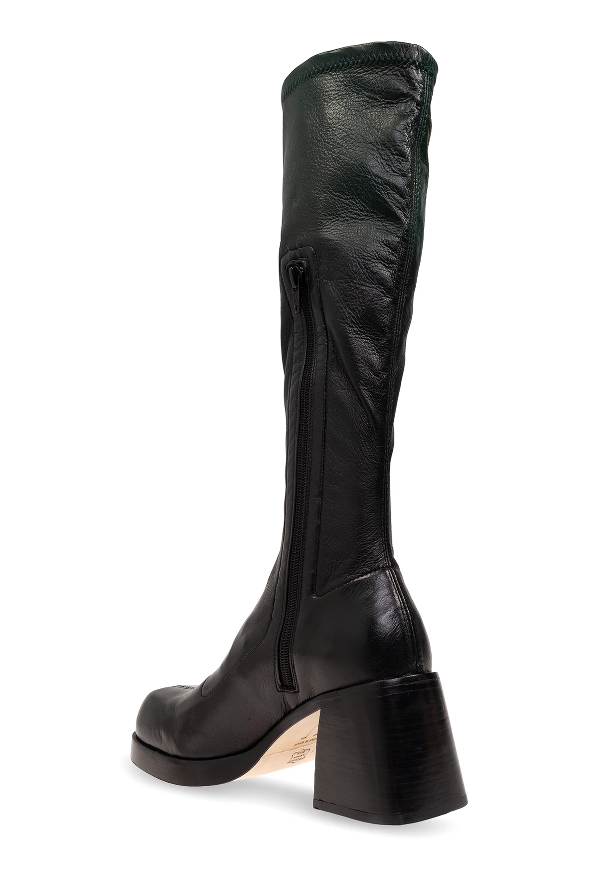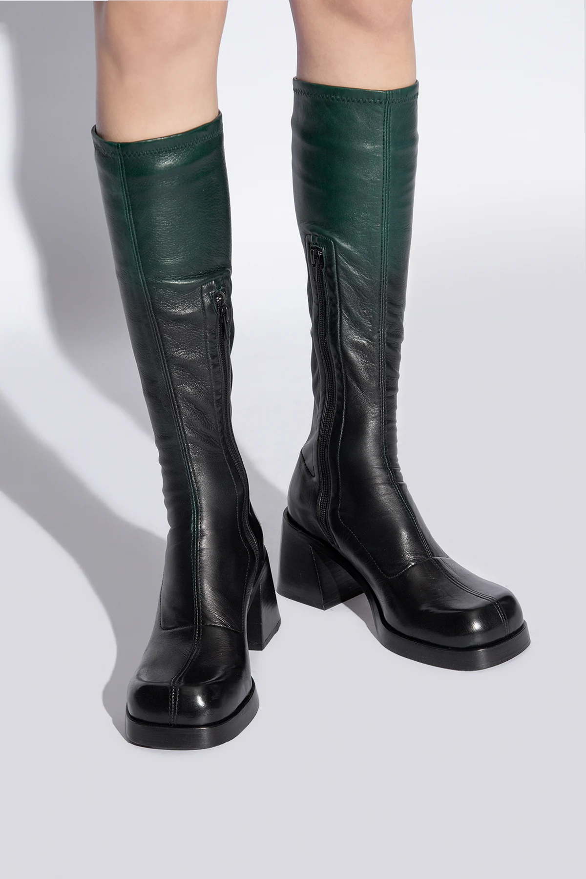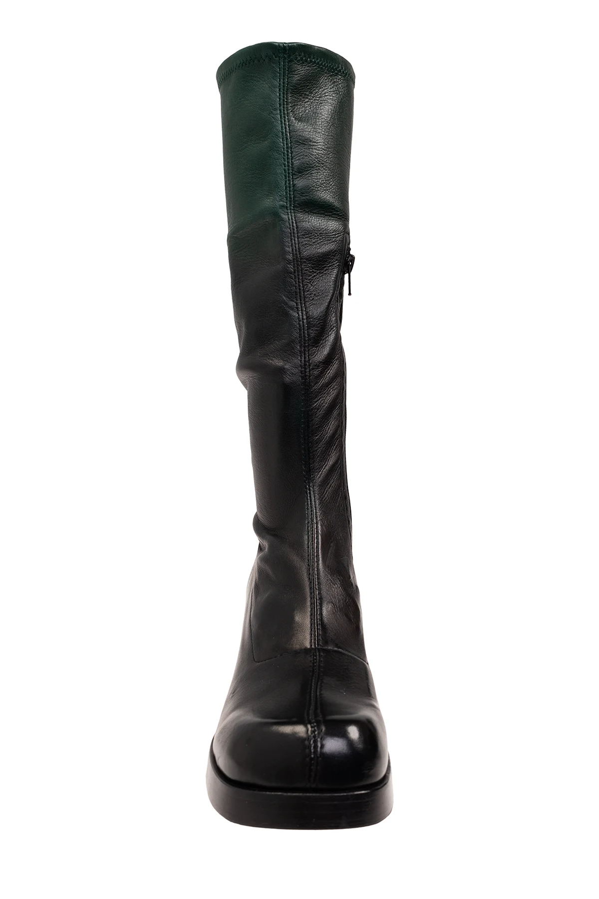 Black and green ‘Hedy’ boots from Miista. Made of leather, this pair features stitches, a rounded square toe, side zip, slanted block heel and a cream leather sole.