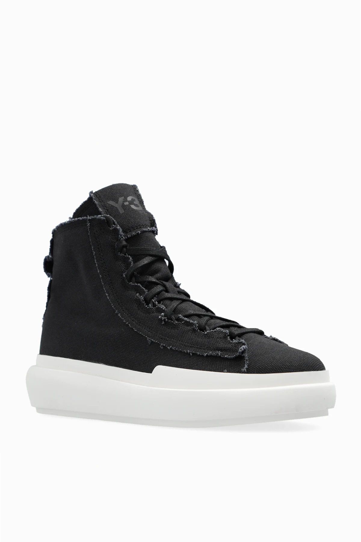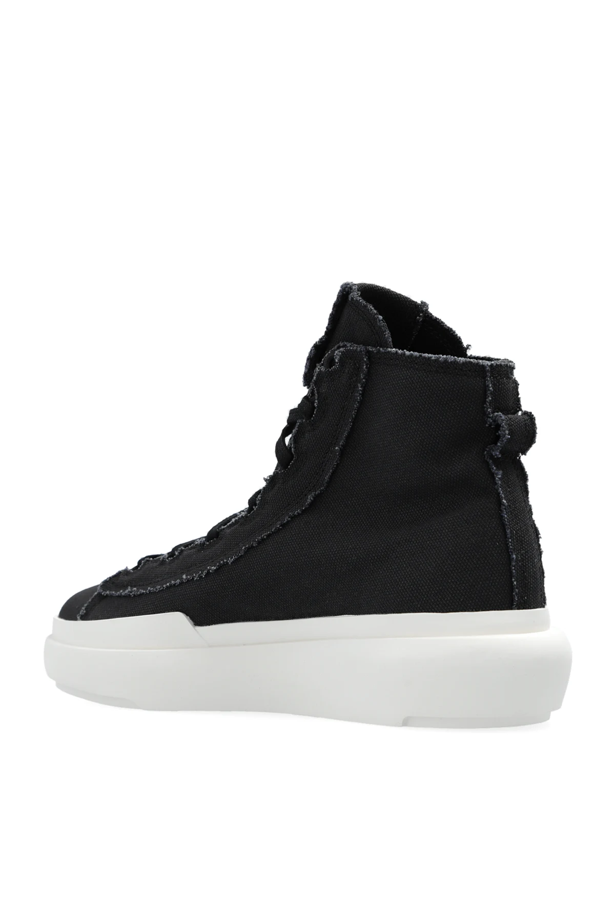 Black ‘Nizza Hi’ high-top sneakers from Y-3 Yohji Yamamoto. Made from raw-trimmed material, this lace-up model features a logo-printed tongue and a white rubber sole.