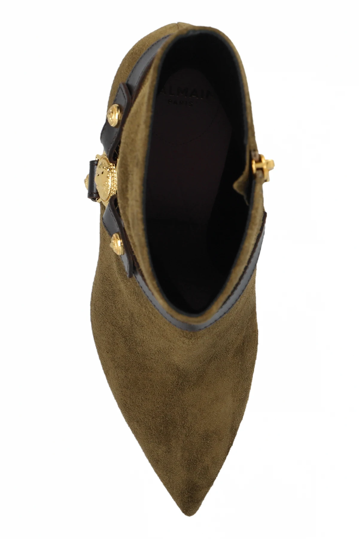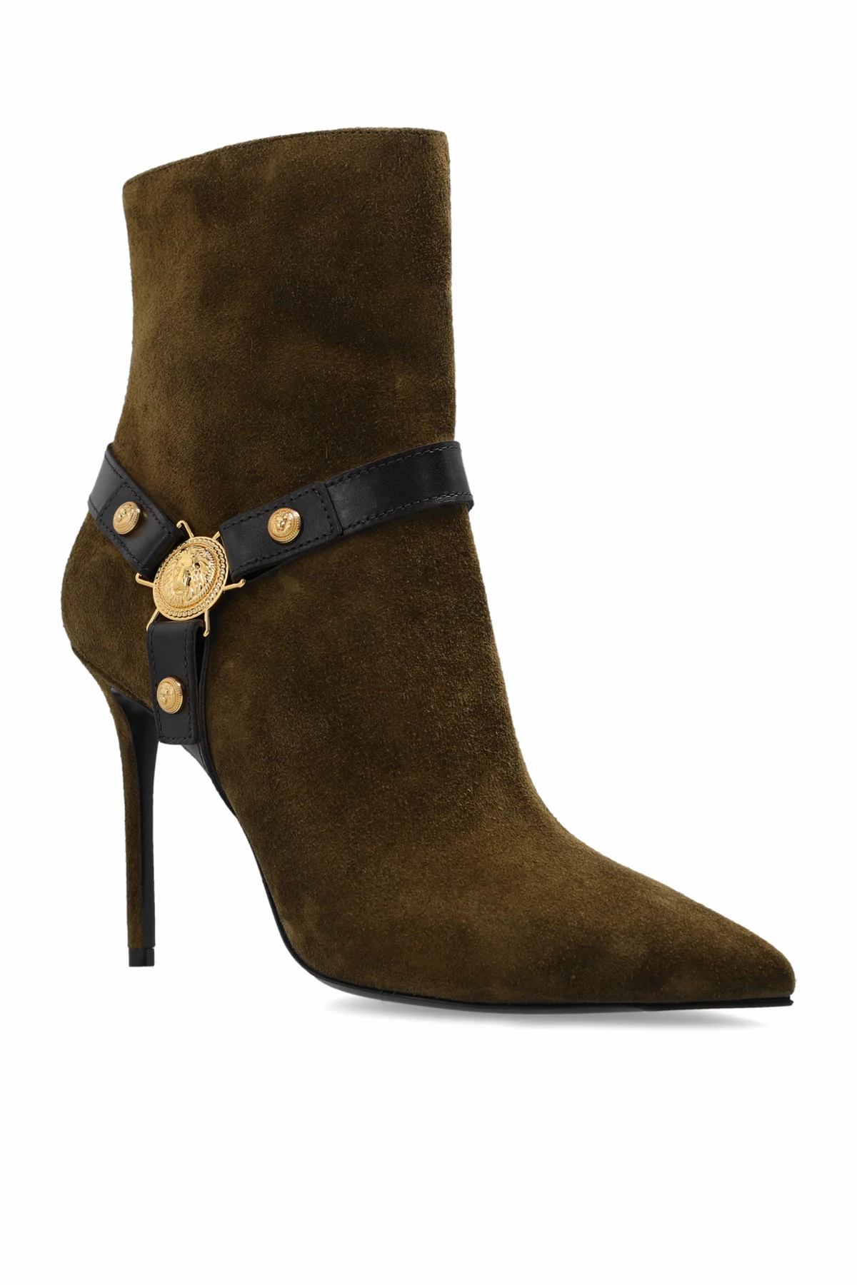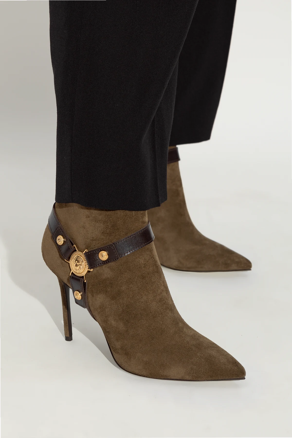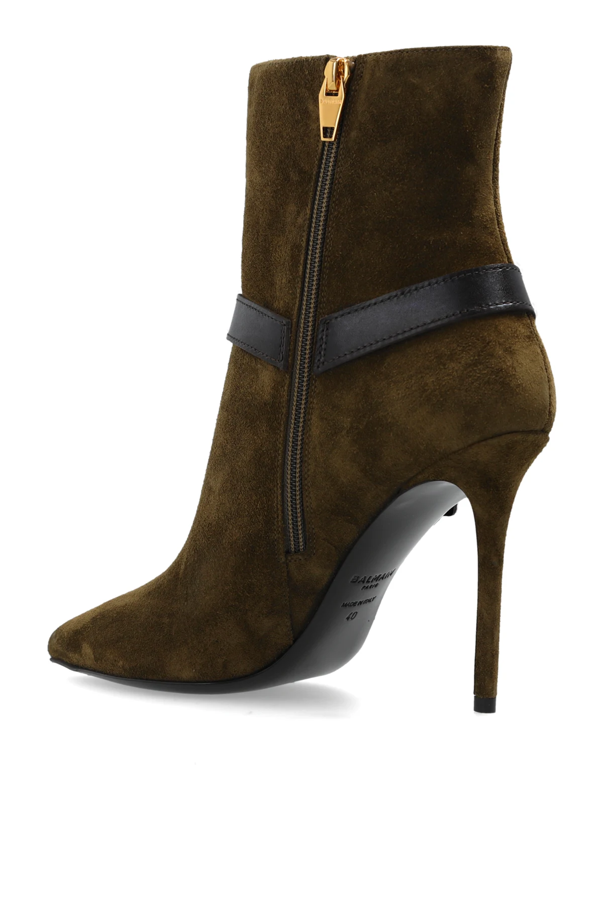 Wir präsentieren exklusive High-Heeled Boots vom renommierten Modehaus Balmain. Diese außergewöhnlichen Boots aus der Bekleidungskollektion zeichnen sich durch eine schlanke, elegante Form mit spitzer Zehenkappe und hohem, dünnem Stiletto-Absatz aus. Sie sind aus hochwertigem Wildleder in Olivgrün gefertigt und vereinen Luxus und Modernität perfekt.