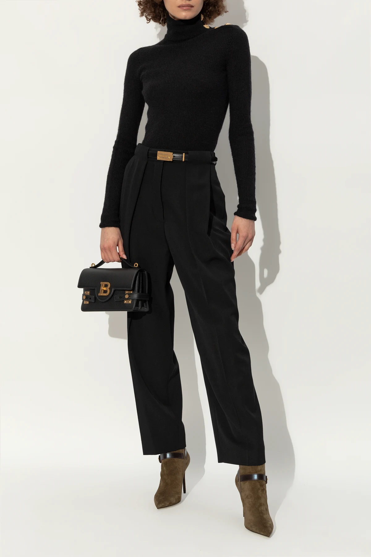 Die einfarbigen Boots ohne Verzierungen auf dem Material zeichnen sich durch einen schwarzen Lederriemen um den Knöchel aus, der mit goldenen Knöpfen und einem zentralen Element mit dem Designer-Logo verziert ist. Ein goldener Reißverschluss auf der Rückseite verleiht ihnen zusätzliche Eleganz.