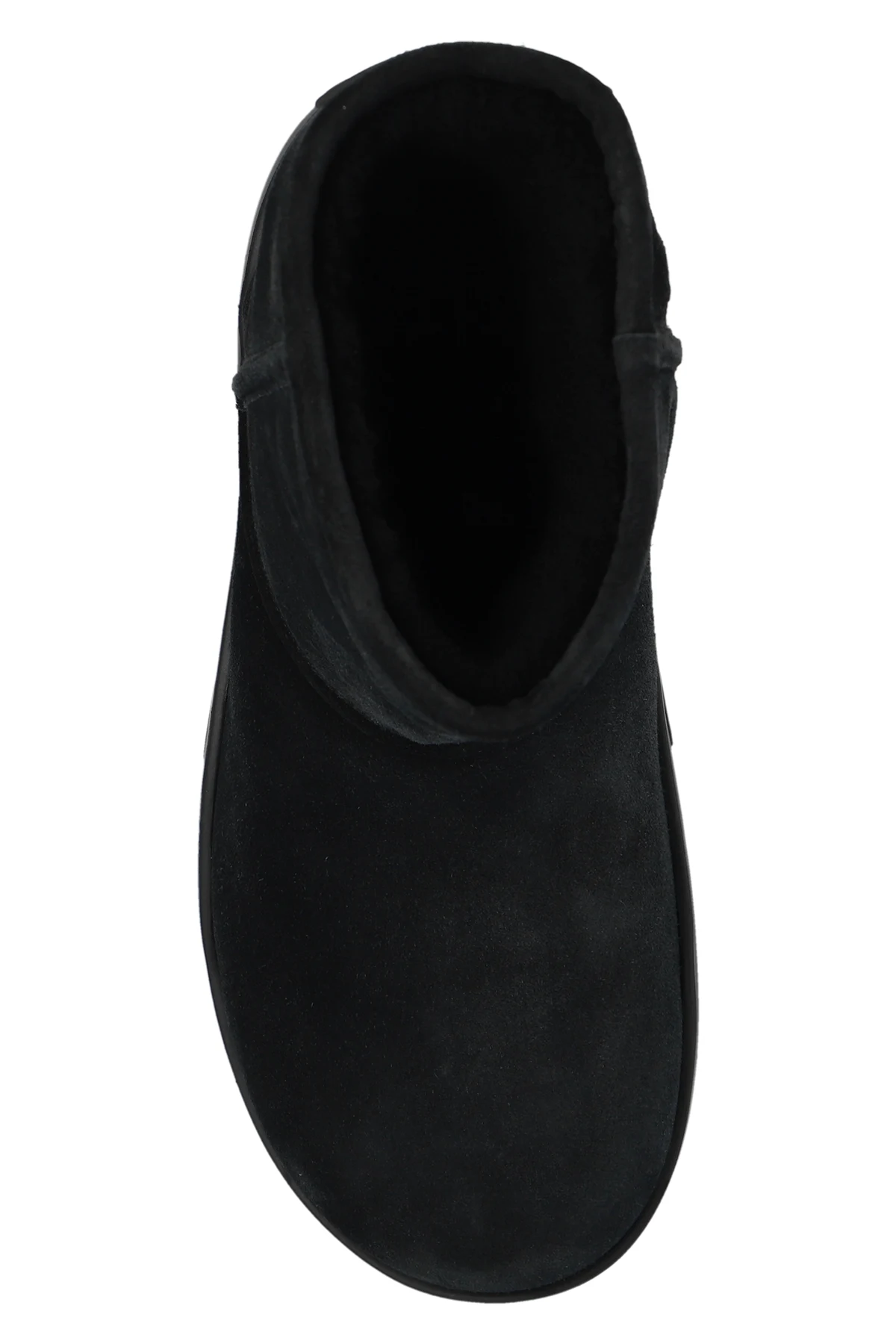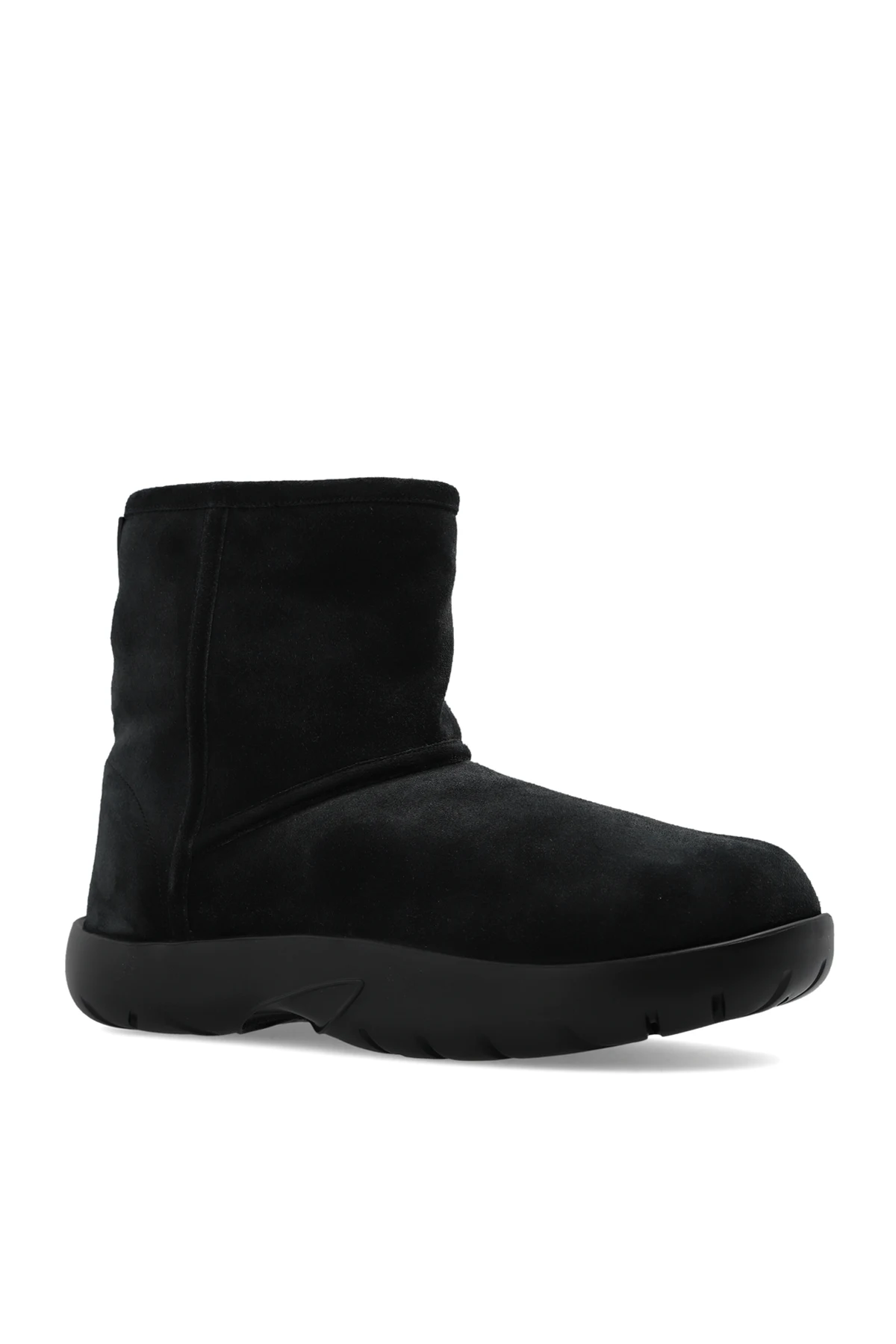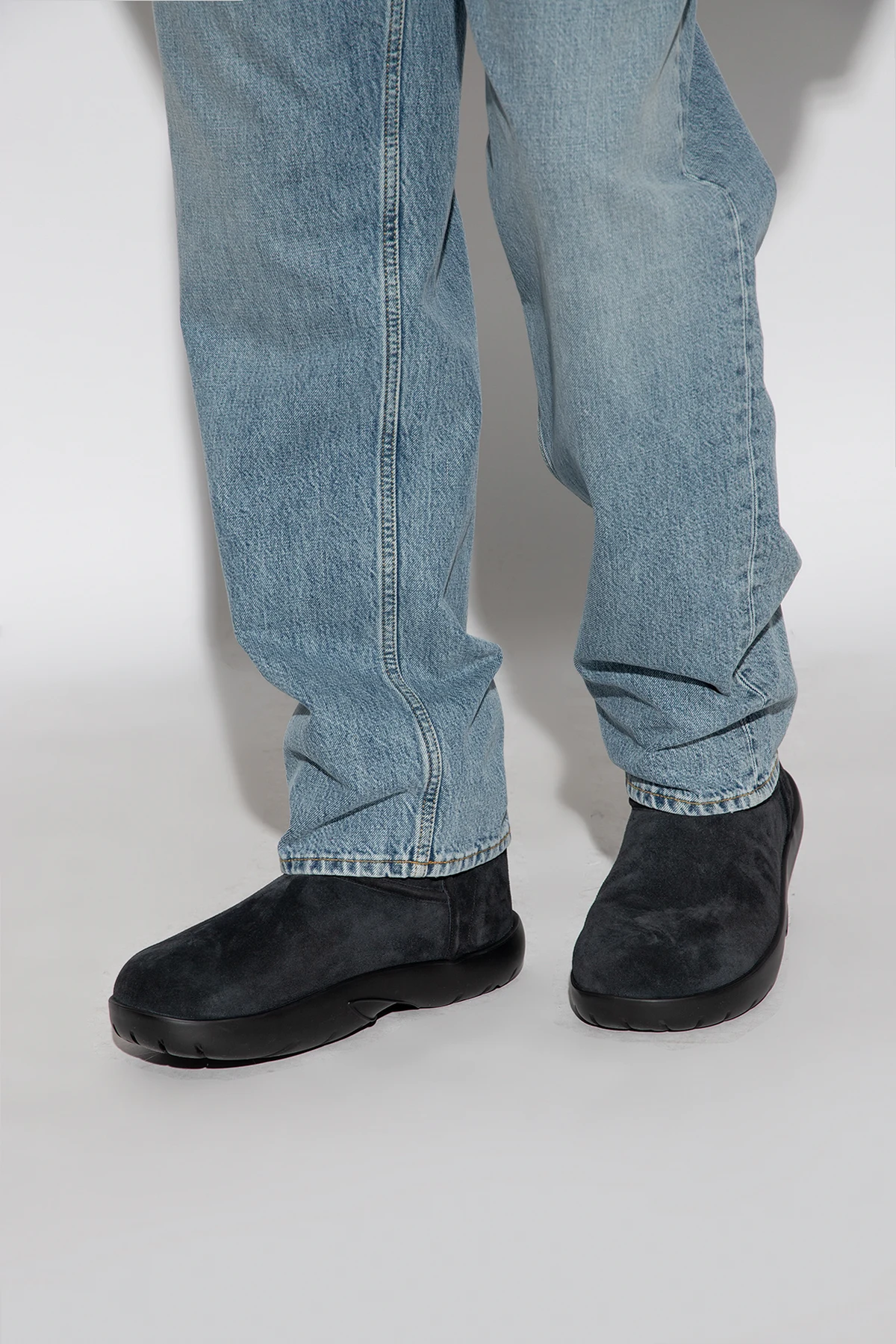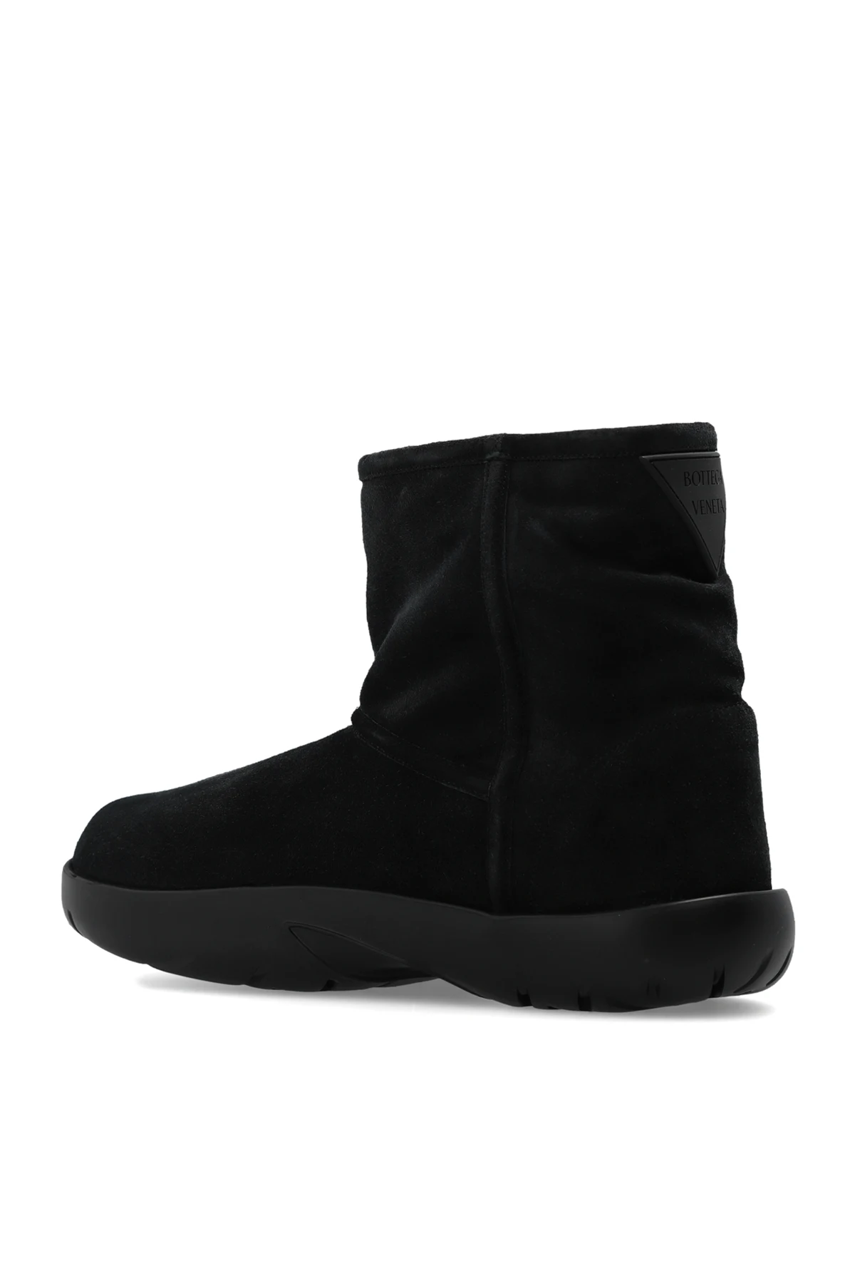 Black ‘Snap’ snow boots from Bottega Veneta. Made from suede and lined with fur, this model features a slip-on silhouette, rubber logo patch on the back and a black rubber sole at the base.