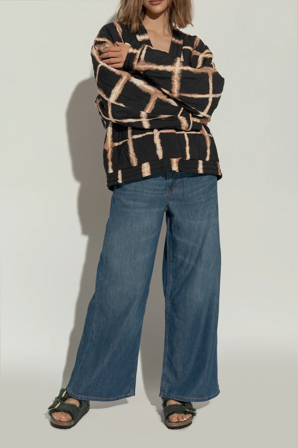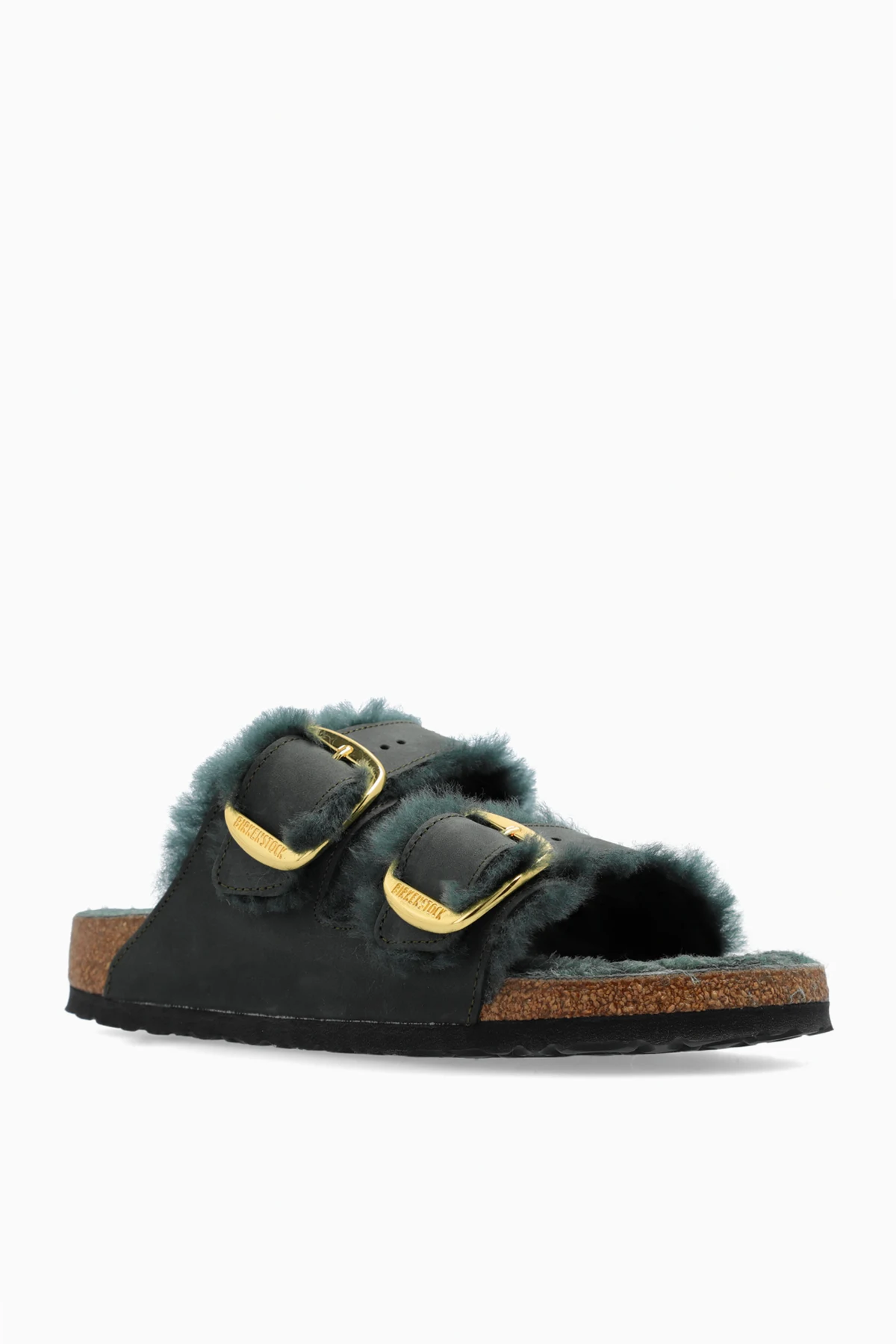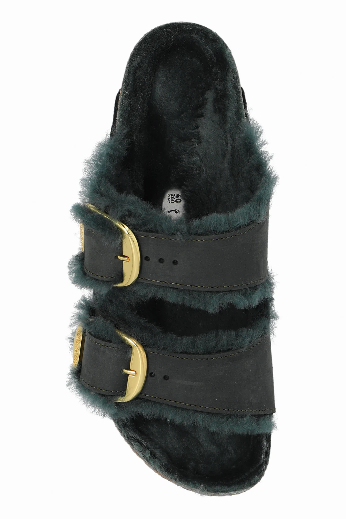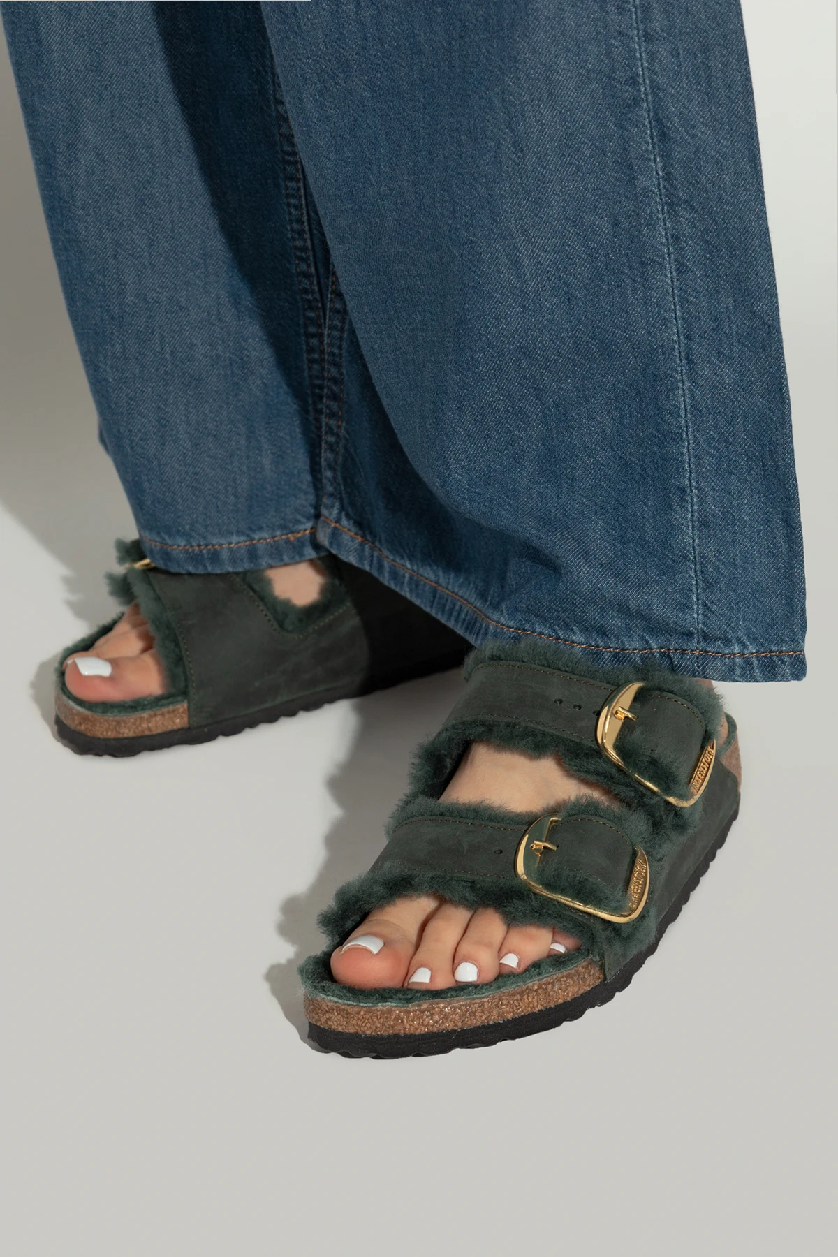 Handgefertigte ‘Arizona Big Buckle Shearling’ Pantoletten von Birkenstock repräsentieren den Gipfel handwerklicher Präzision. Ihr grüner Farbton, der sich je nach Licht wie ein geheimnisvoller Wald verändert, verwandelt jeden Schritt in Teil einer einzigartigen Geschichte. Die Exklusivität dieser Schuhe wird durch breite, verstellbare Wildlederriemen, verziert mit großen, goldenen Schnallen, unterstrichen, welche jeder Styling-Kombination einen eleganten Charakter verleihen.