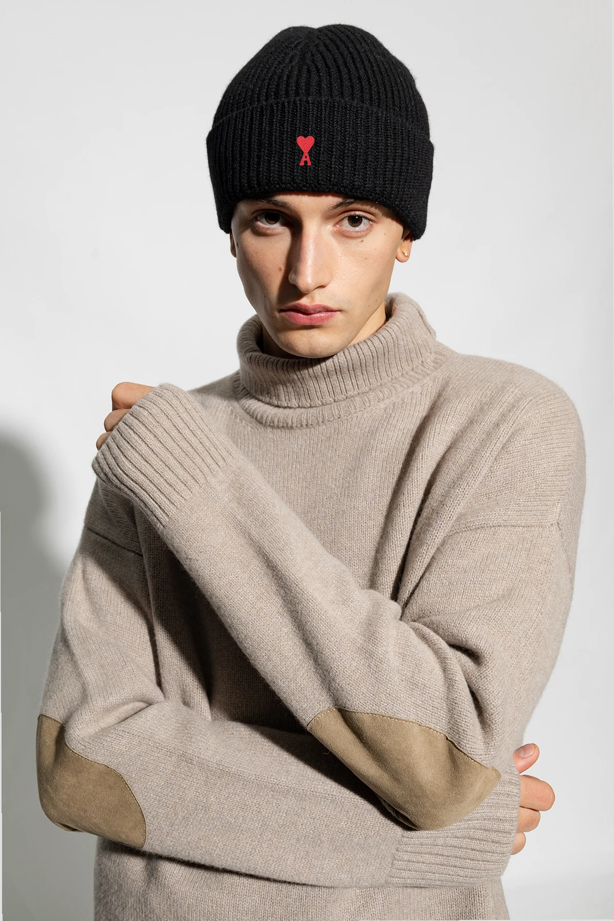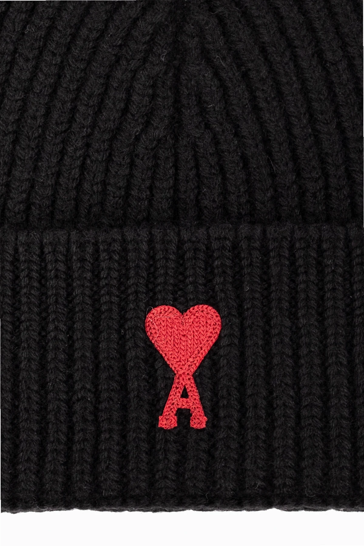 Black beanie from Ami Alexandre Mattiussi. Made from virgin wool, this item showcases a red ‘Ami de Coeur’ patch on the front.