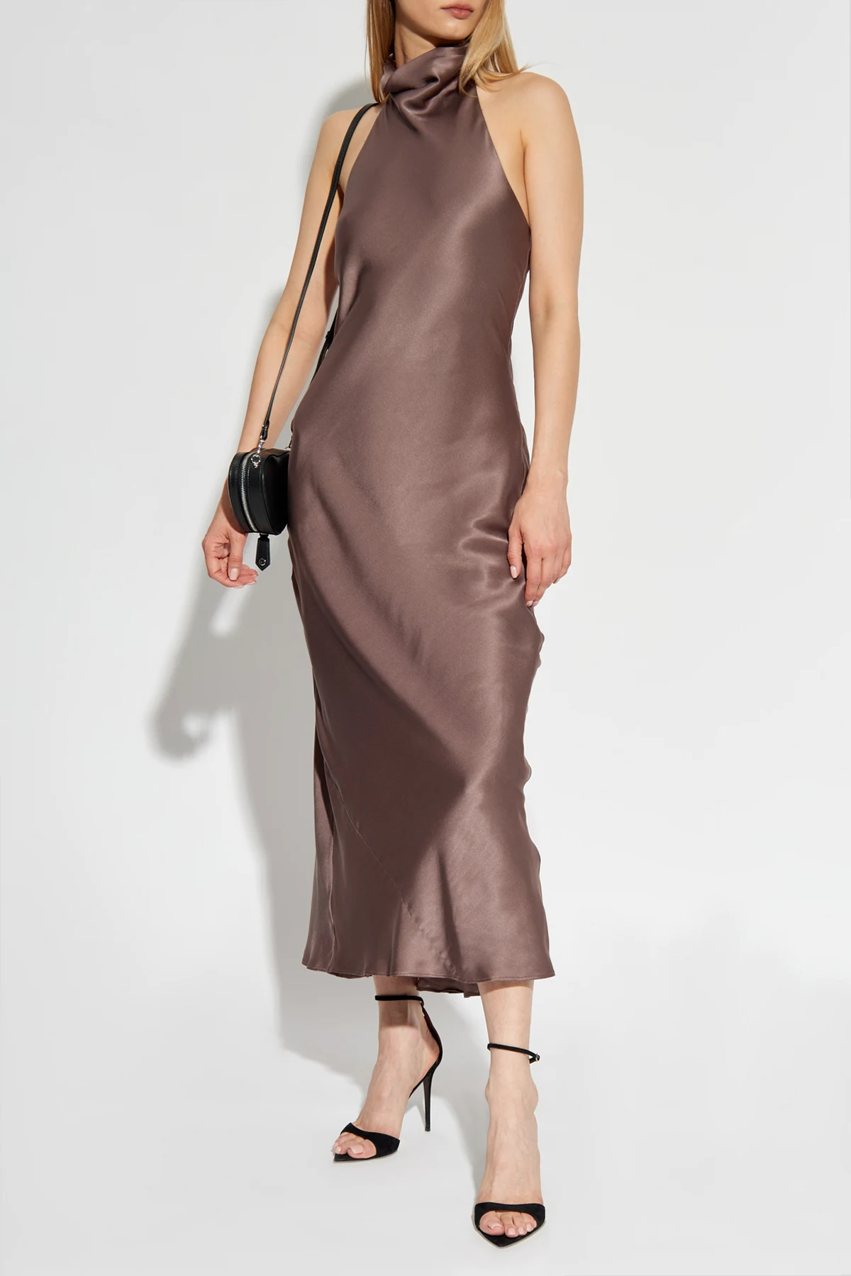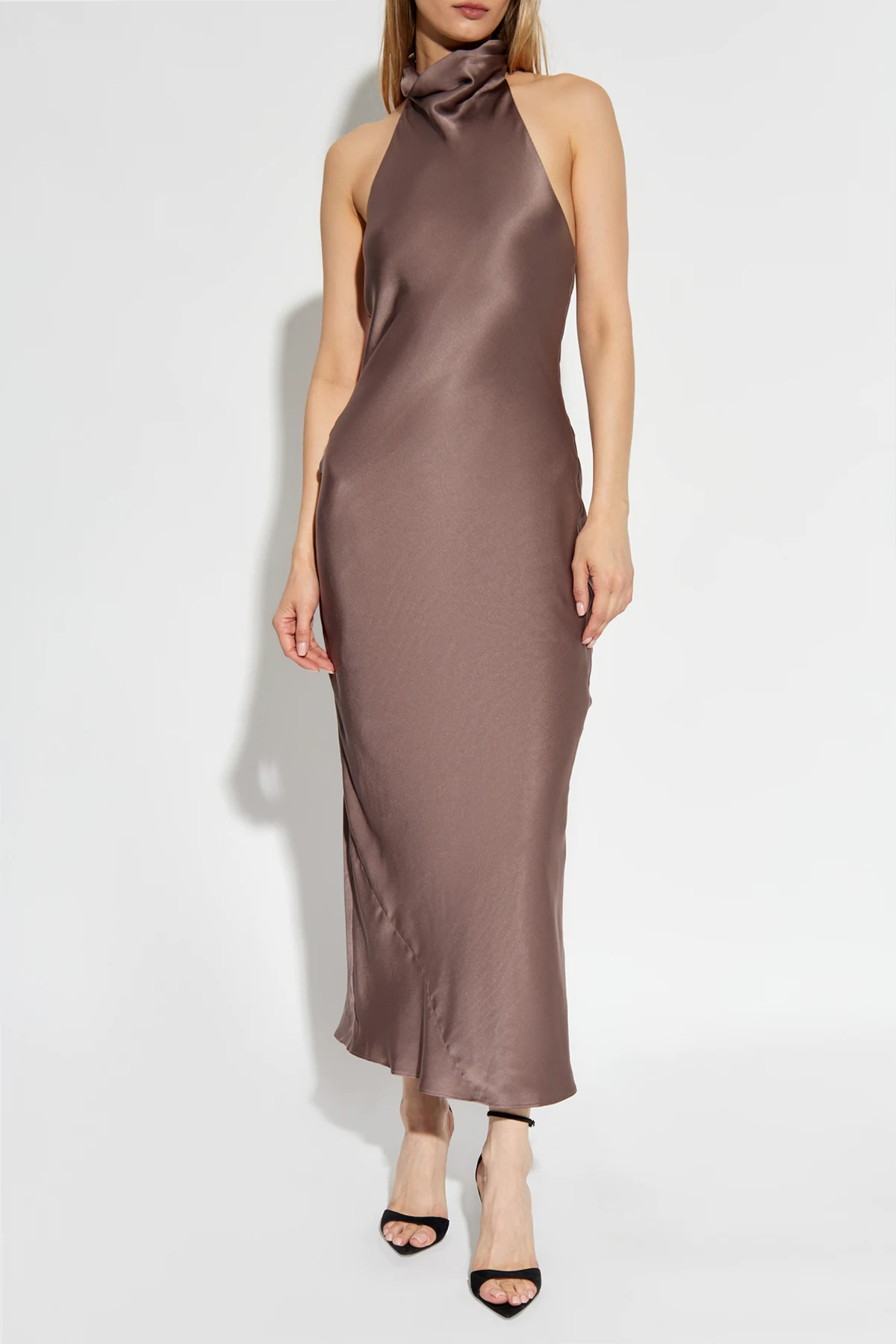 Die Seidenkleid von Anine Bing verzaubert mit ihrem subtilen Glanz und ist die Quintessenz der Eleganz, die sich in Einfachheit und Raffinesse manifestiert. Aus hochwertigster Seide gefertigt, präsentiert es sich in einem tiefen Braunton mit einem zarten metallischen Schimmer, der ihm einen einzigartigen Charakter verleiht. Die Knöchellänge und die ärmellose Gestaltung betonen die Anmut und Weiblichkeit der Silhouette, während der hohe, dekorative Kragen, der hinten gebunden wird, einen Effekt eines zarten Knotens kreiert, der dem Ganzen eine verfeinerte Note hinzufügt.