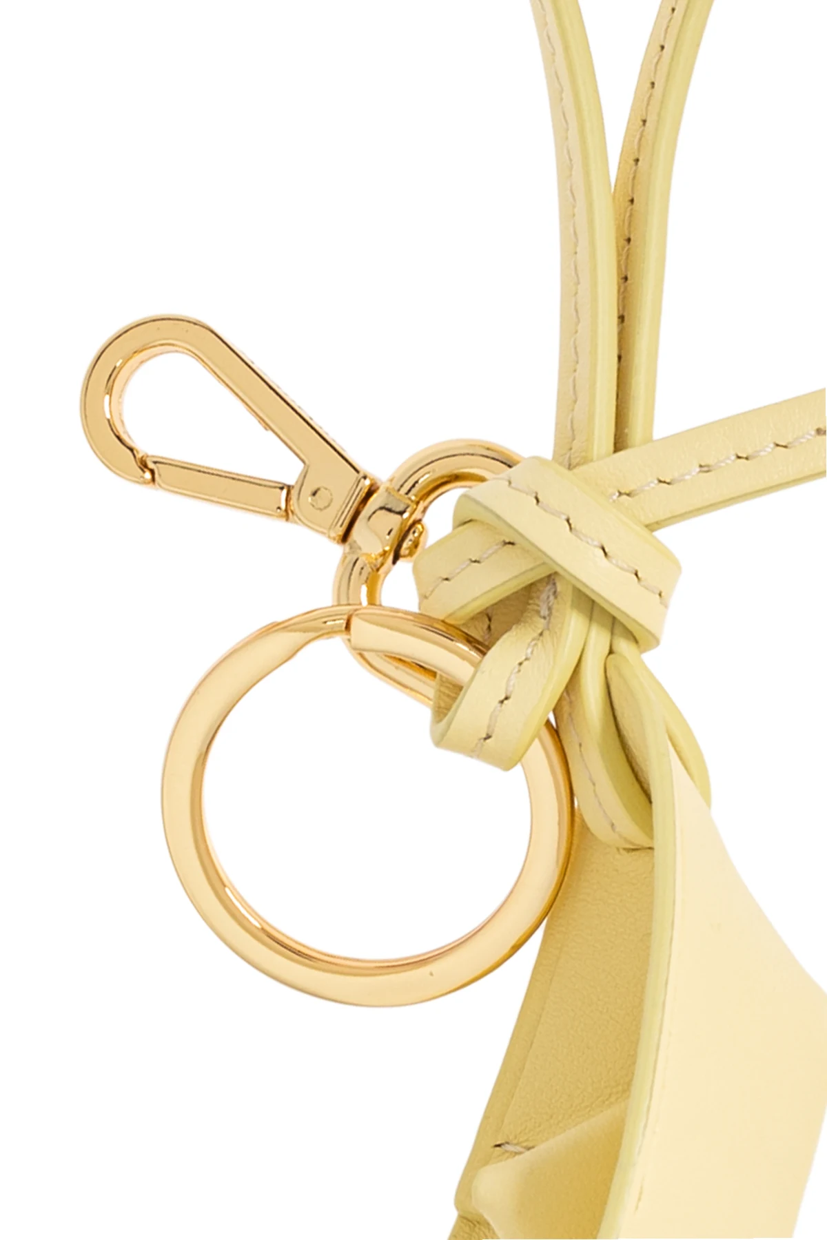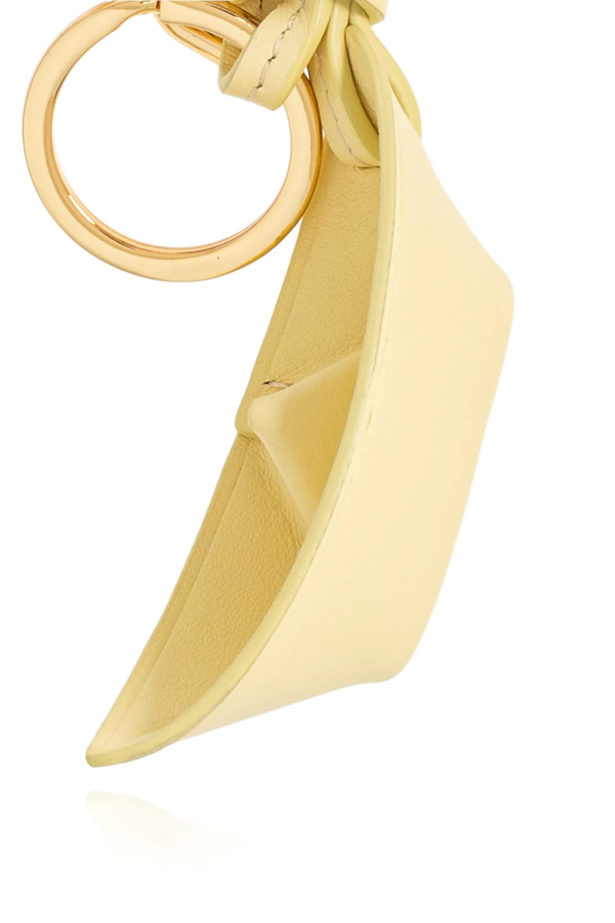 Der Schlüsselanhänger zeichnet sich durch seine einzigartige, asymmetrische Form aus, die an eine Miniaturtasche oder einen Geldbeutel erinnert. Gefertigt aus hochwertigstem Leder in intensivem Gelb, besticht er durch seine Glätte und präzise Verarbeitung. Der luxuriöse Charakter des Schlüsselanhängers wird durch goldene Metallelemente – den Ring und den Karabiner – unterstrichen, die einen perfekten Kontrast zum gelben Leder bilden.
