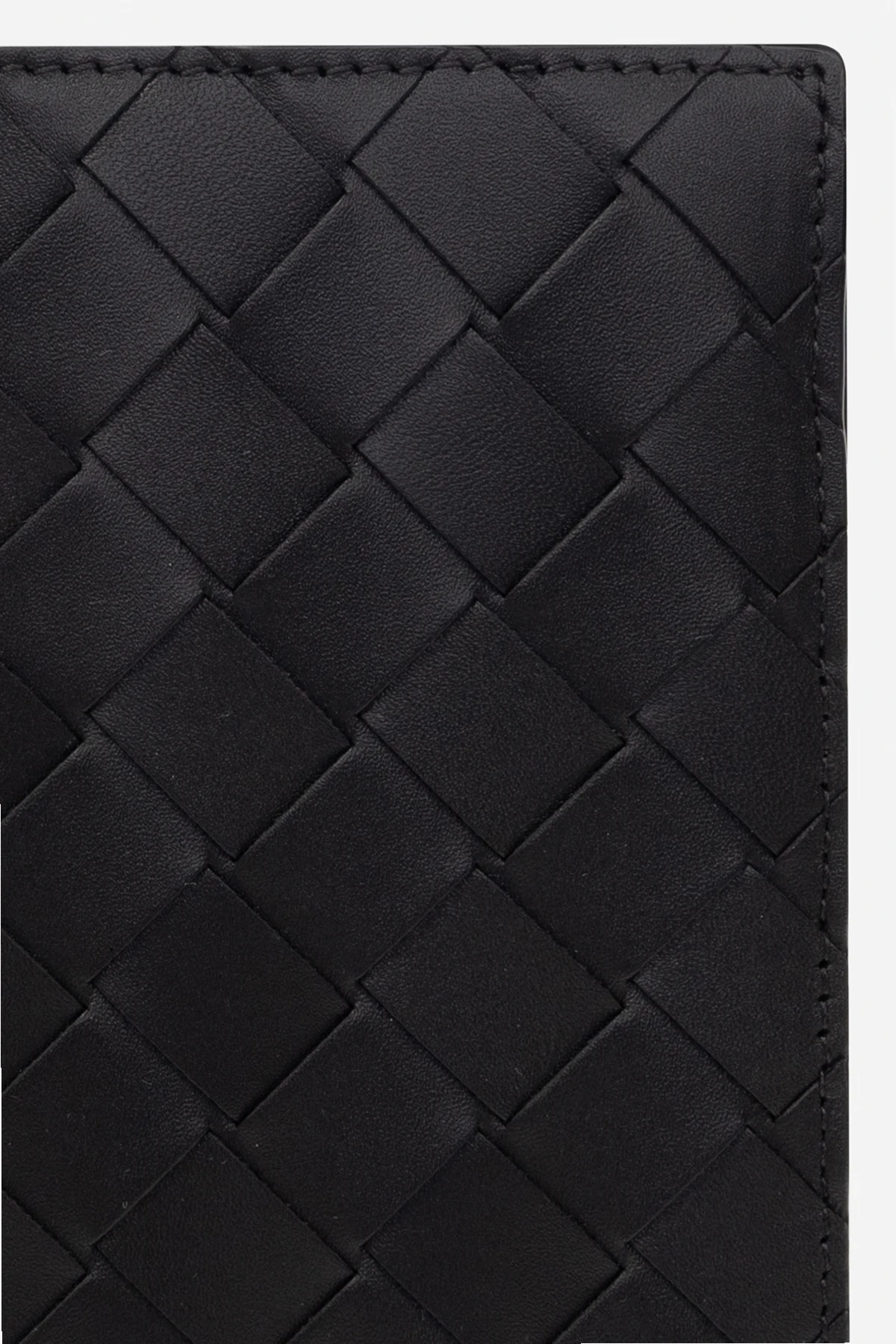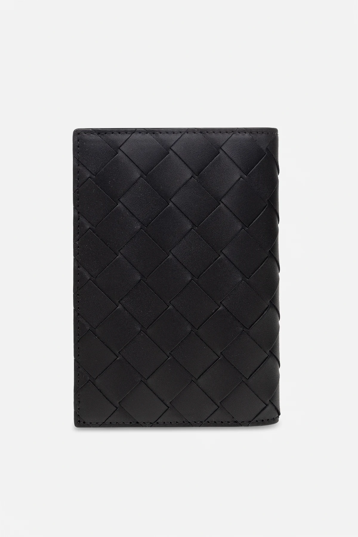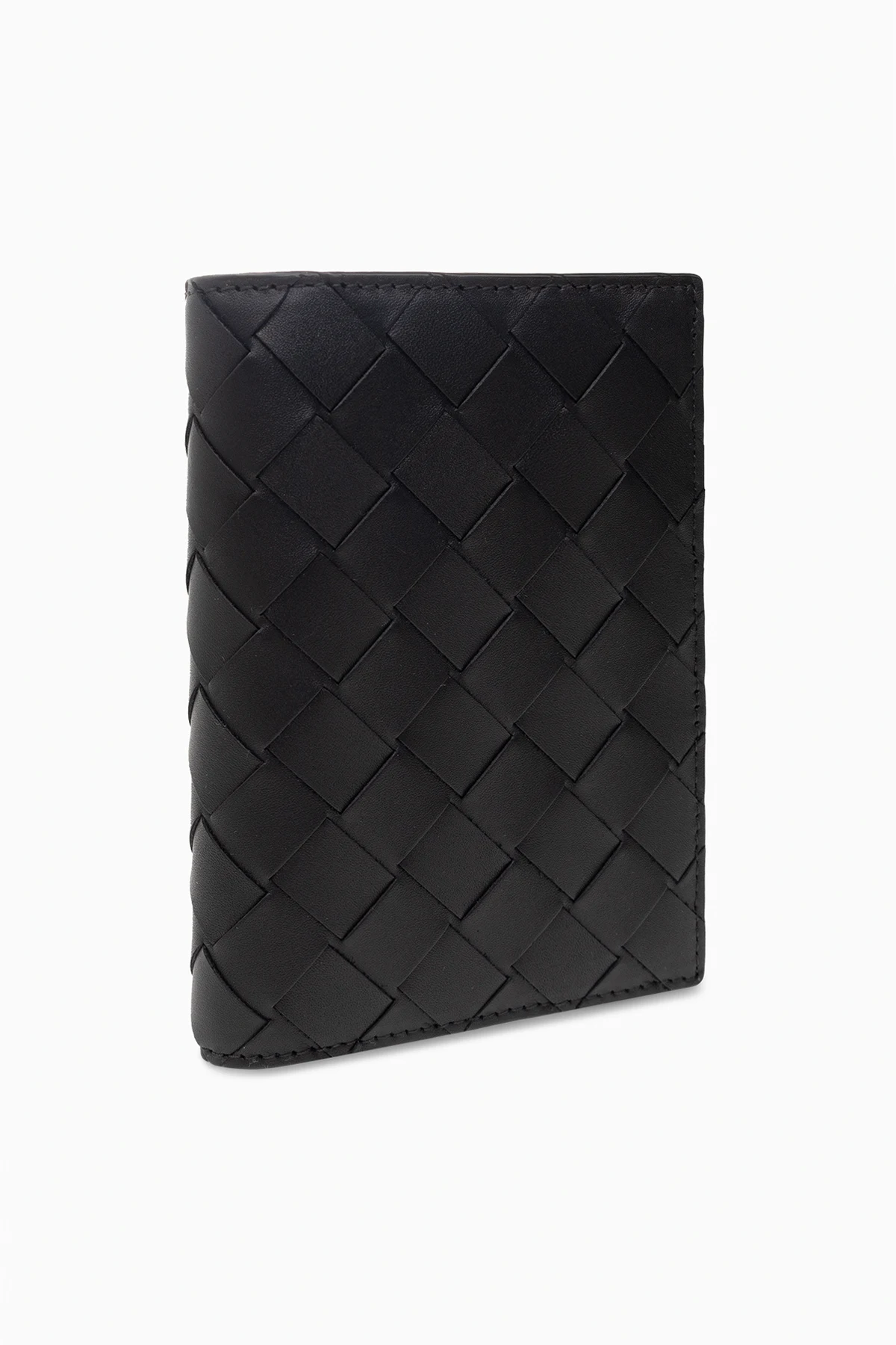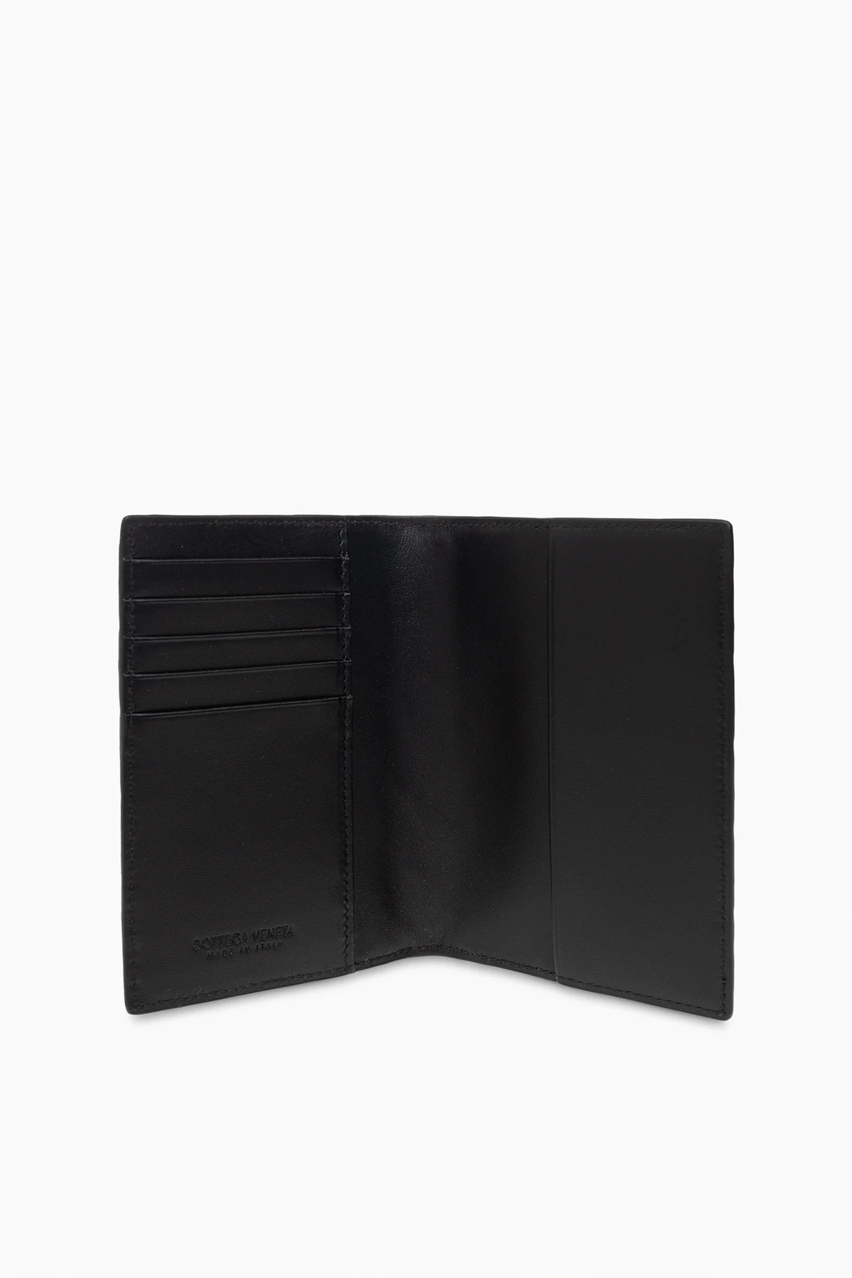Schwarzes Passetui von Bottega Veneta. Aus Leder gefertigt. Mit dem charakteristischen Flechtmuster der Marke verziert. Innen ein Fach, fünf Kartenfächer und eine Einschubtasche.