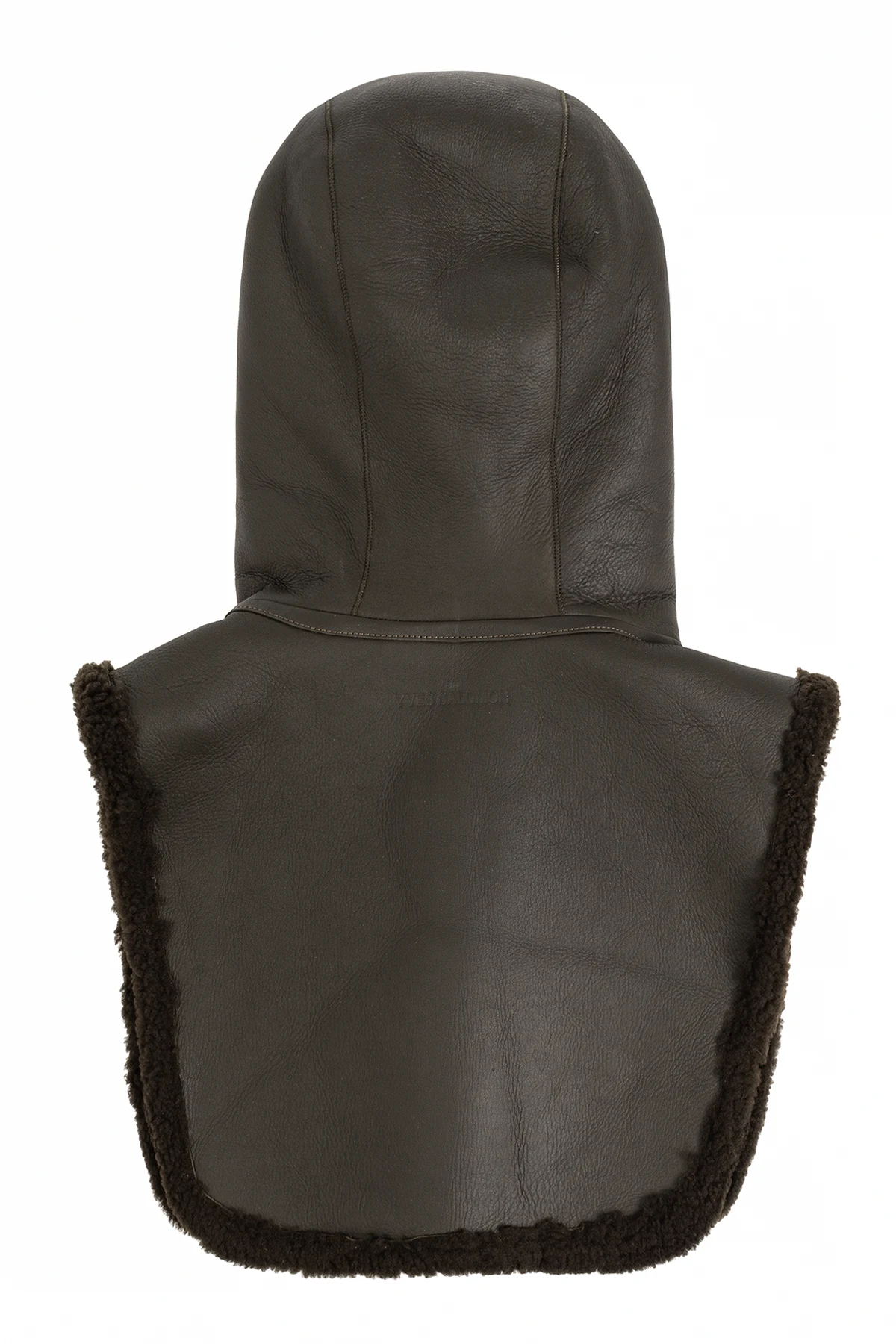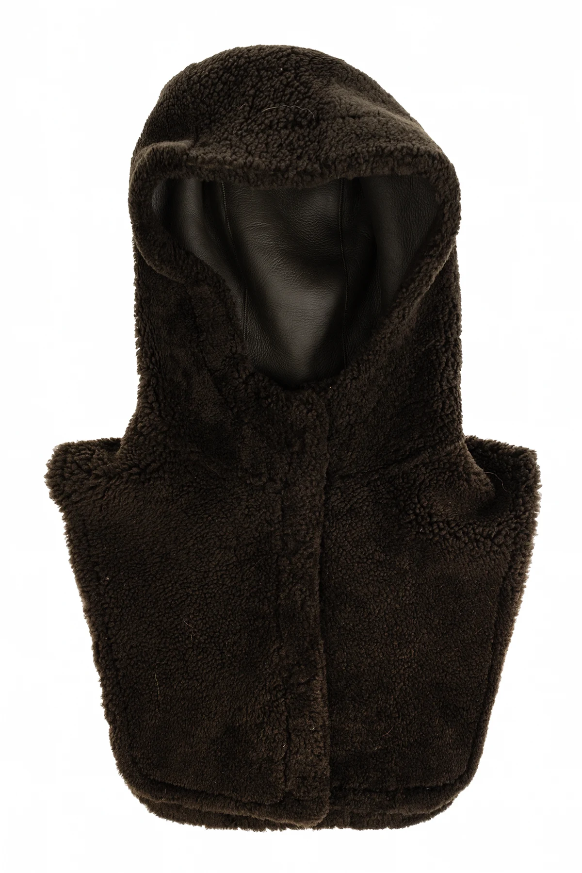 Dark green hood from Yves Salomon. Made of lamb fur, this item fastens with snaps and showcases an embossed logo on the back.