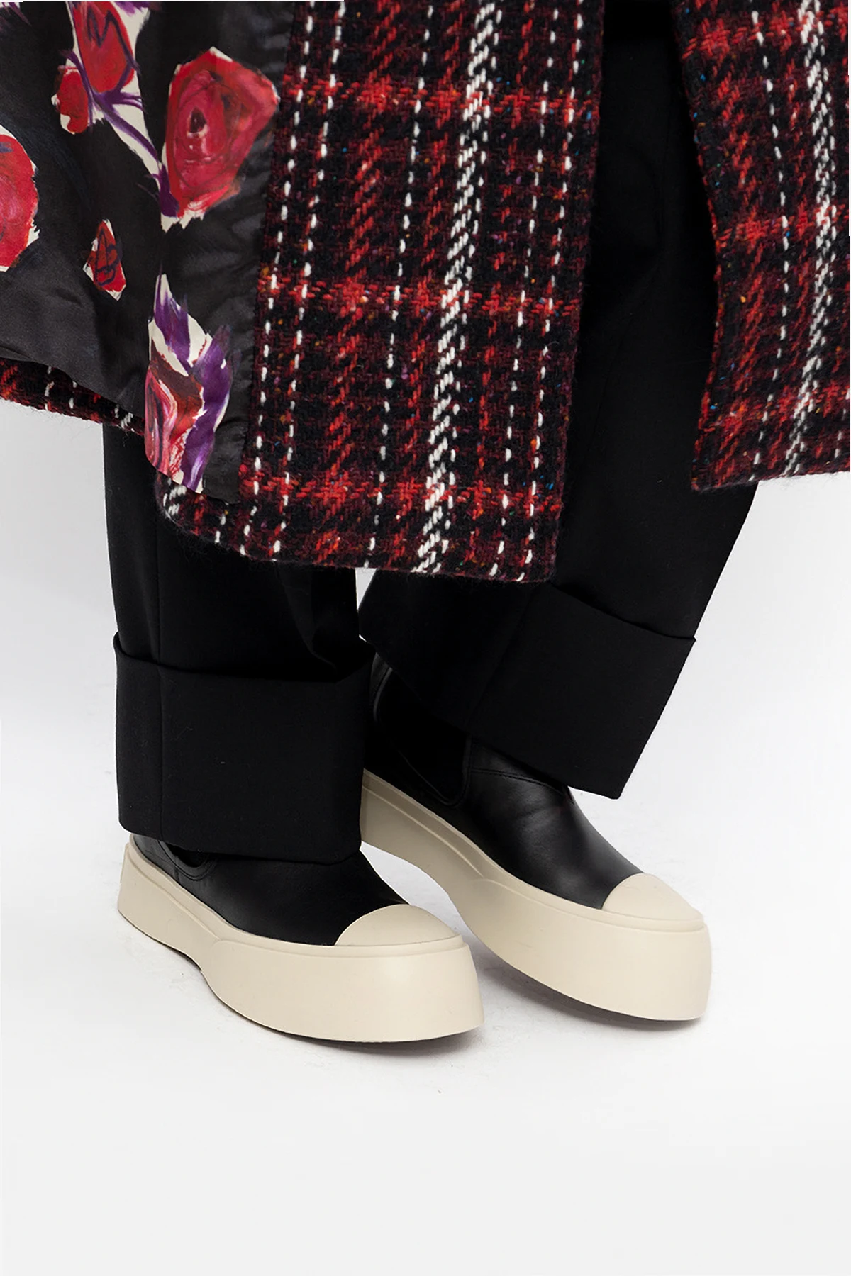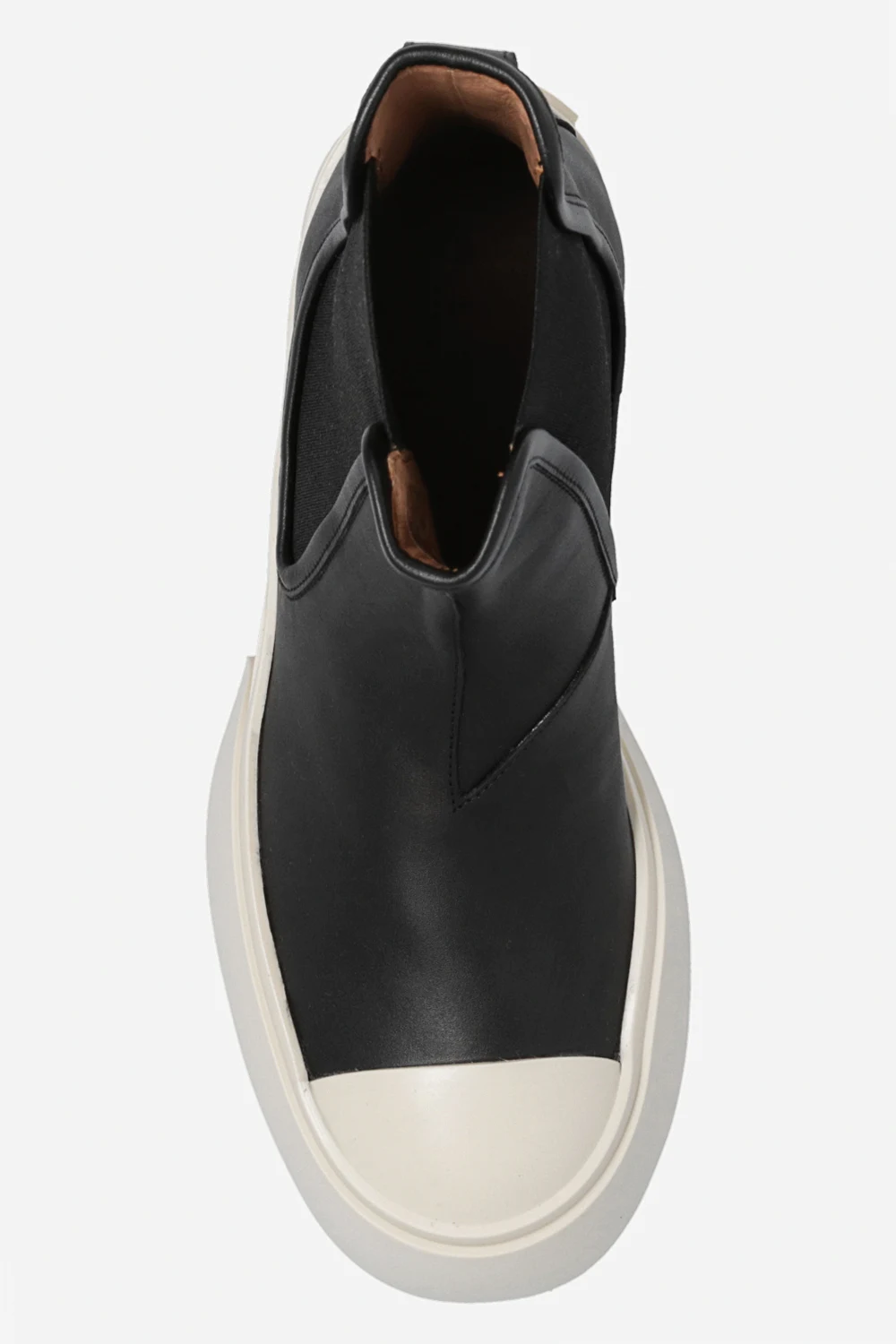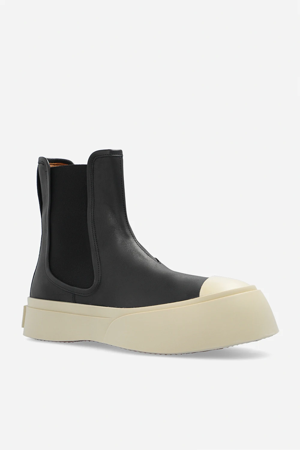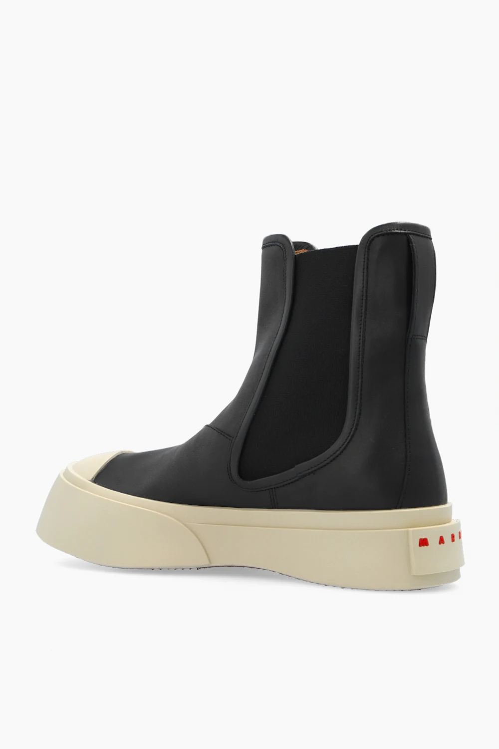 Black ‘Pablo’ ankle boots from Marni. Crafted from calf leather, this slip-on pair features elastic side panels, cream and brown chunky rubber sole and red logo at the back.