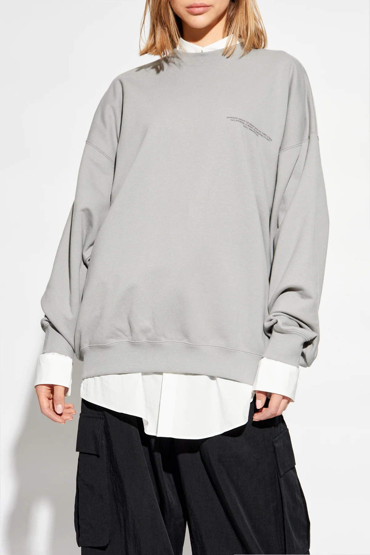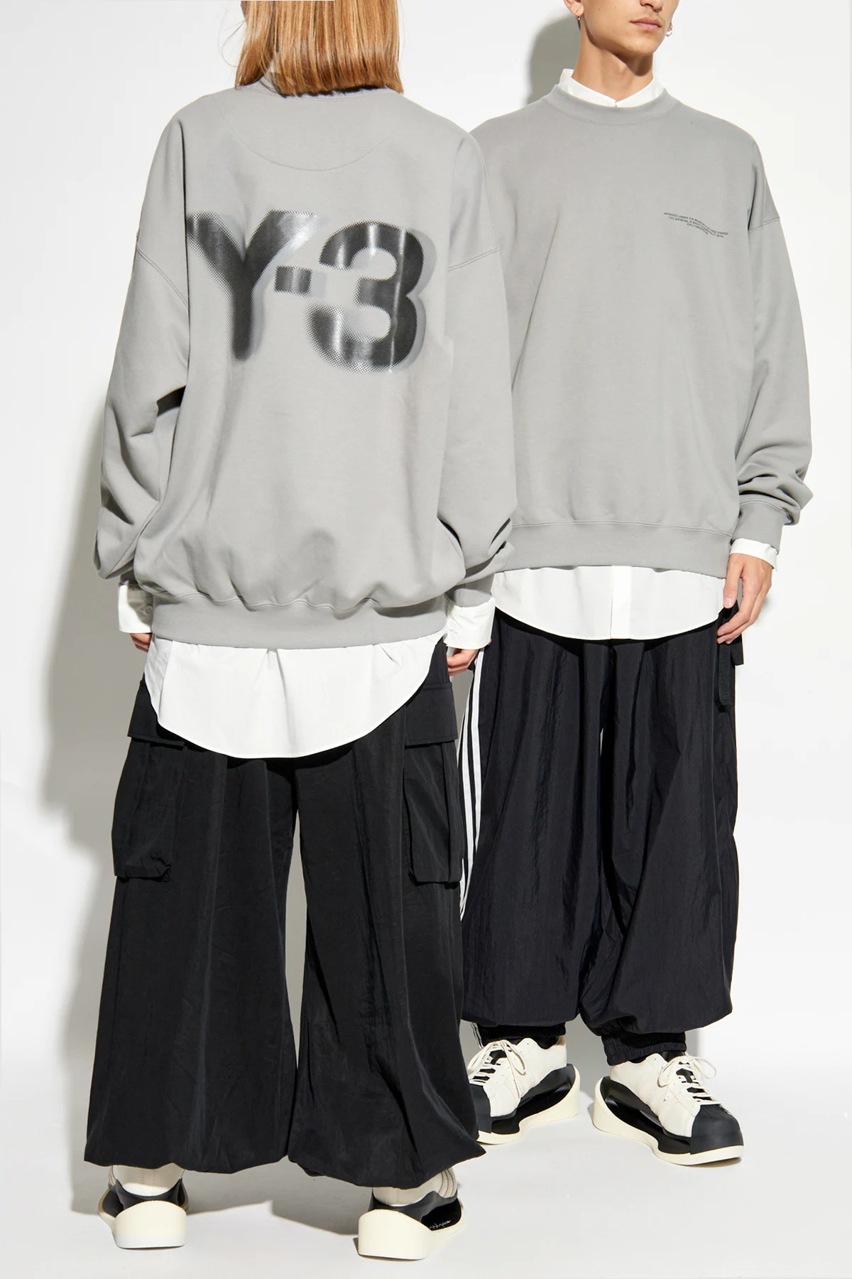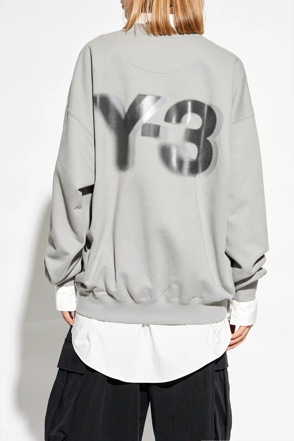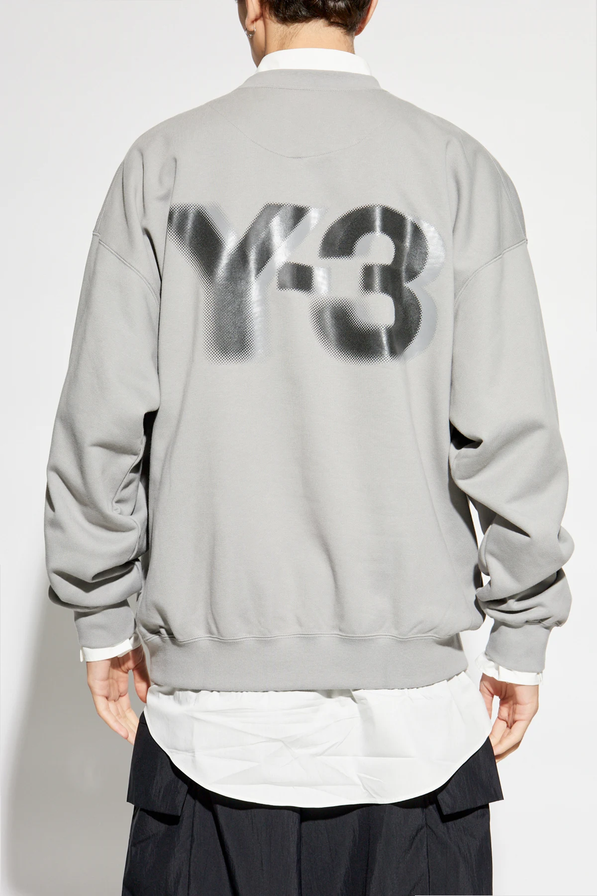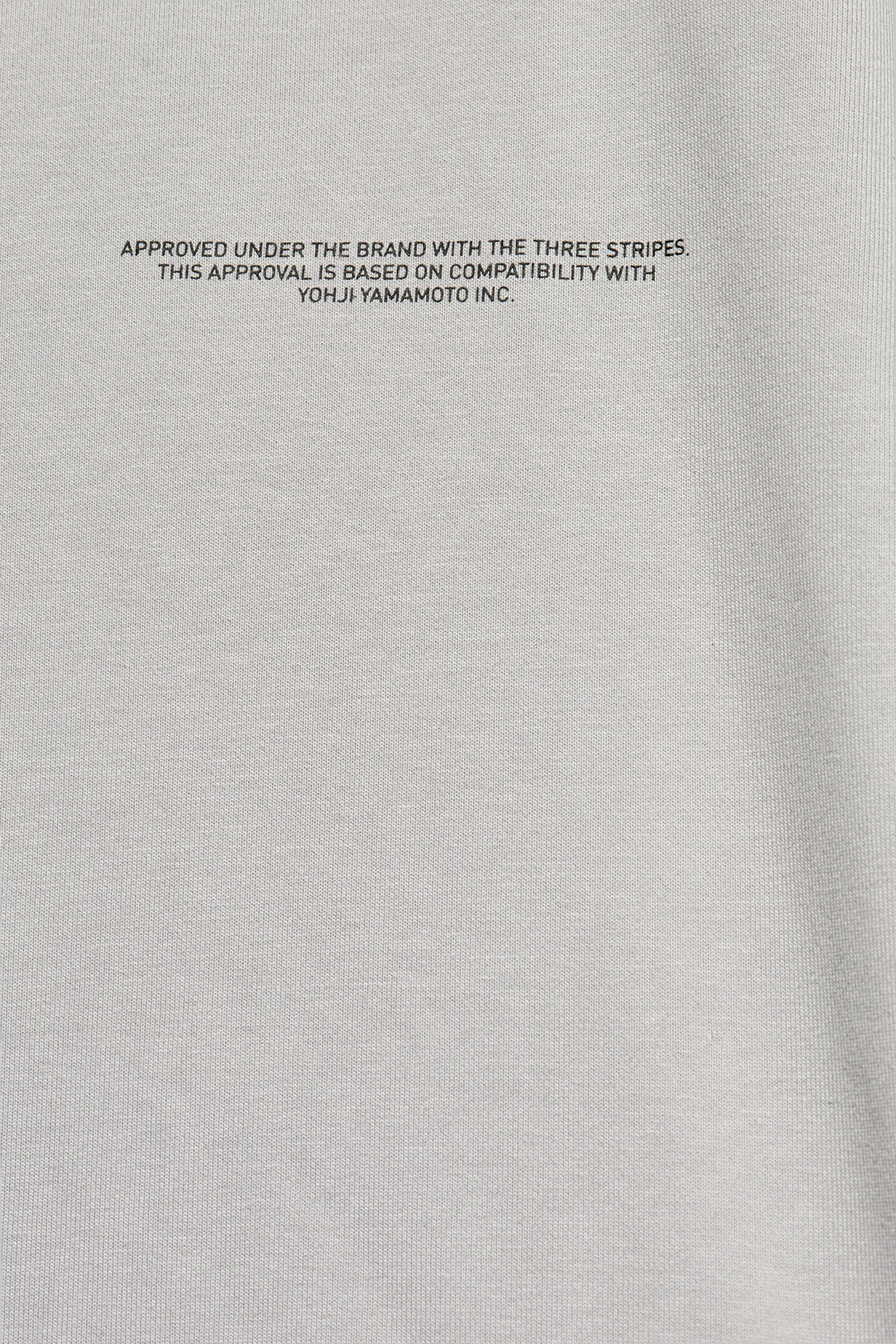Auf der Vorderseite des Sweatshirts, auf der linken Brustseite, befindet sich der dezente Schriftzug: "APPROVED UNDER THE BRAND WITH THE THREE STRIPES. THIS APPROVAL IS BASED ON COMPATIBILITY WITH YOHJI YAMAMOTO INC." Auf dem Rücken prangen hingegen große, schwarze Buchstaben "Y-3", die ein charakteristisches Element dieses Designs darstellen.