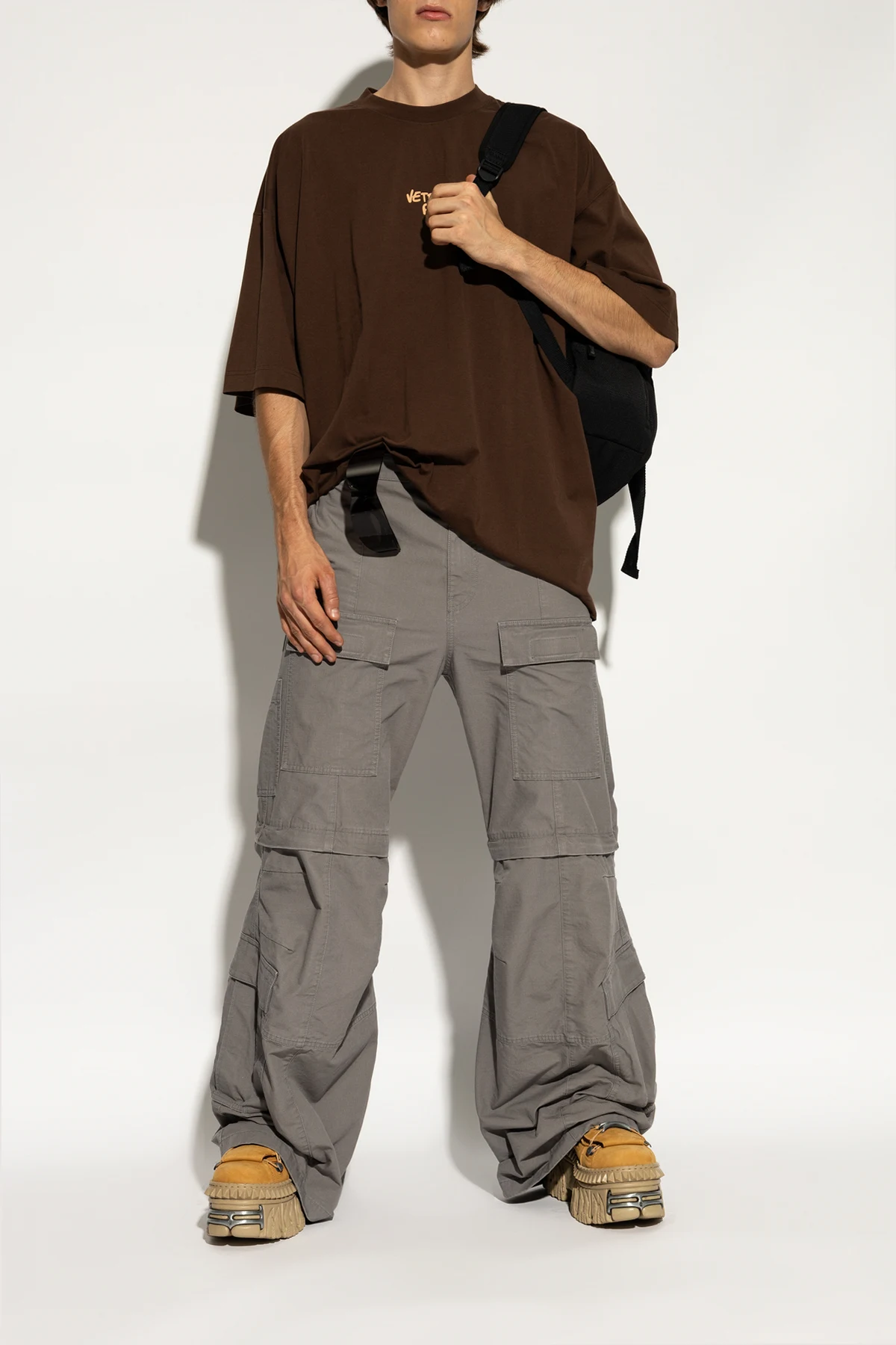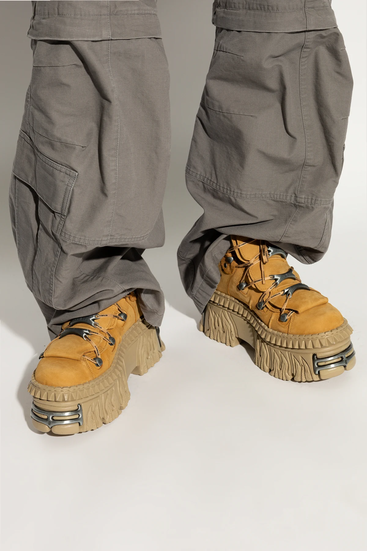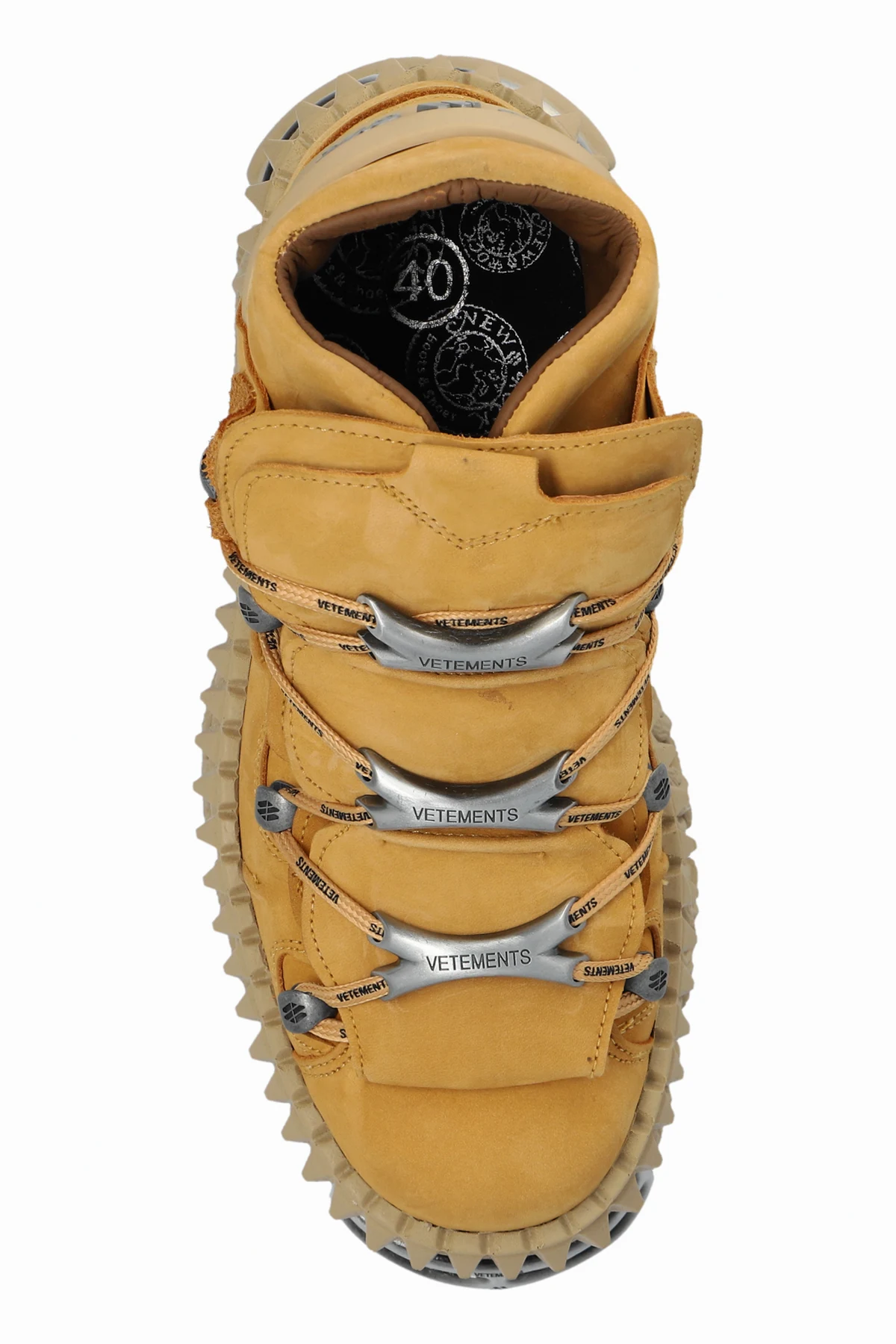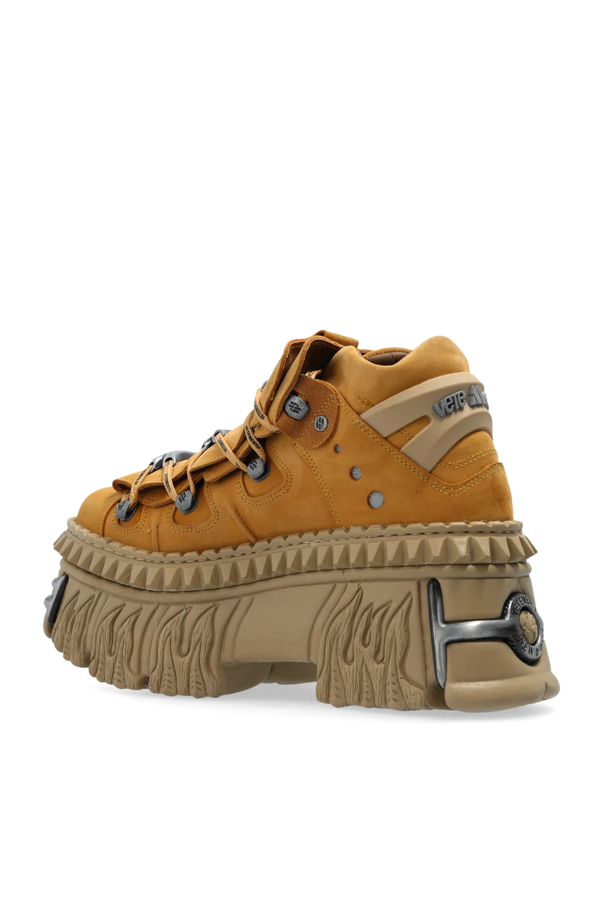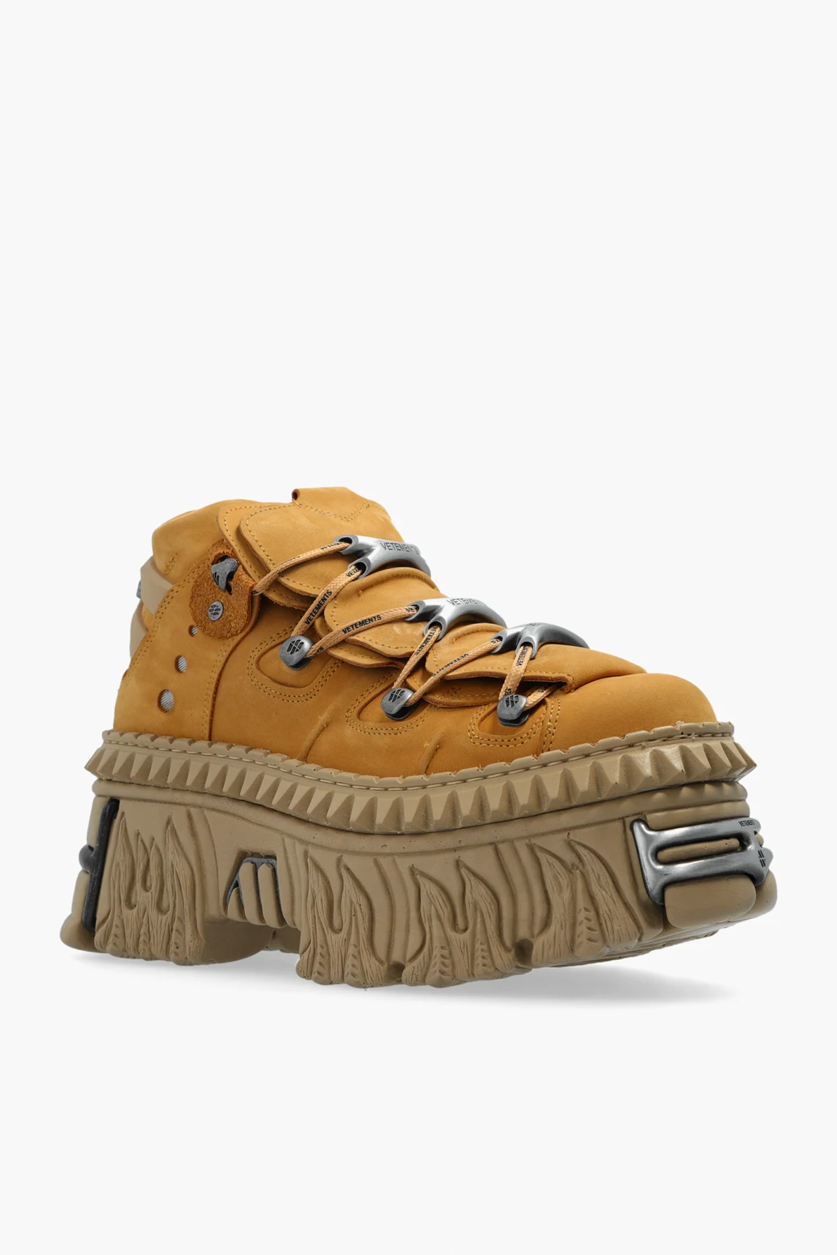 Der industrielle Charakter der Schuhe wird durch Metallelemente in Form von Ösen und Schnallen an den Schnürsenkeln sowie silberne "VETEMENTS"-Aufschriften auf der Vorderseite und an den Seiten der Schuhe unterstrichen. Ein zusätzliches, auffälliges Element ist die Metallverzierung an der Ferse, die das Gesamtbild abrundet.
