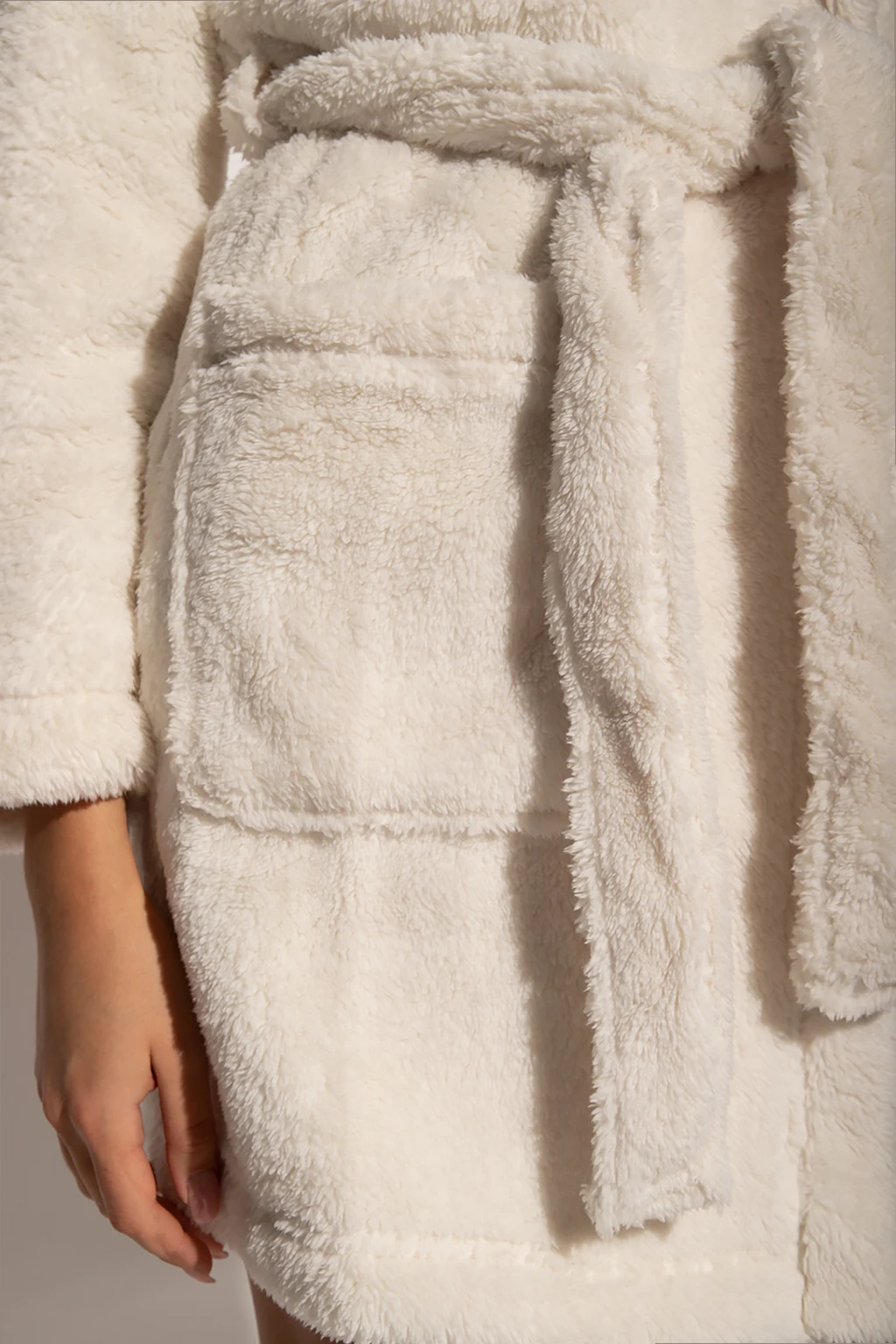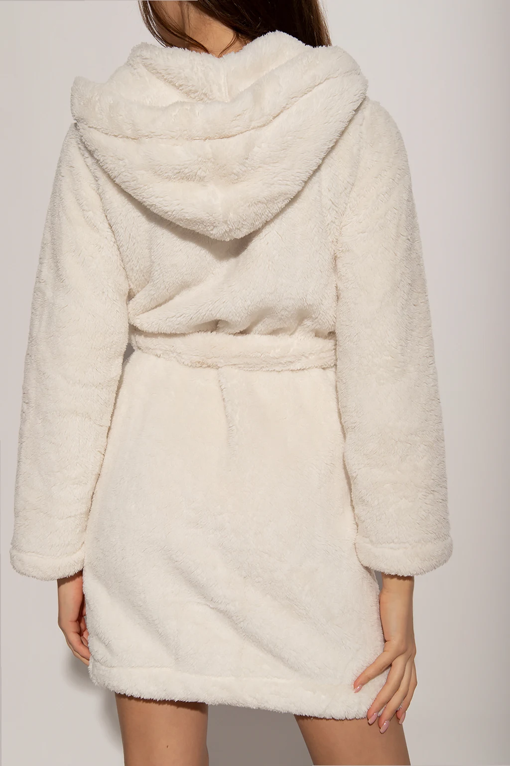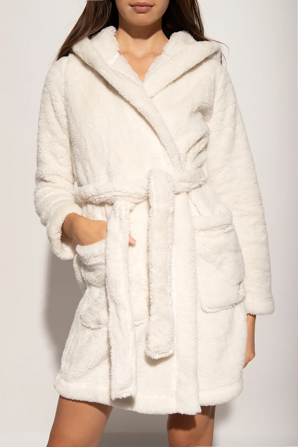 Cream robe with a hood from UGG. Made of plush fabric, this style features a waist-cinching belt, two front patch pockets and long sleeves.