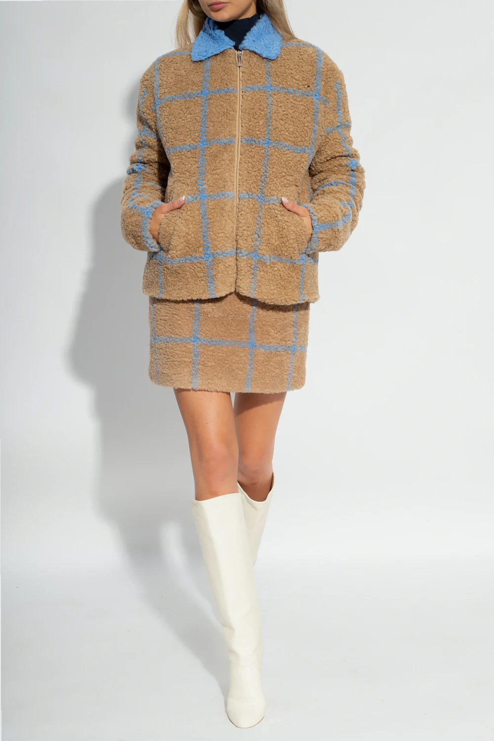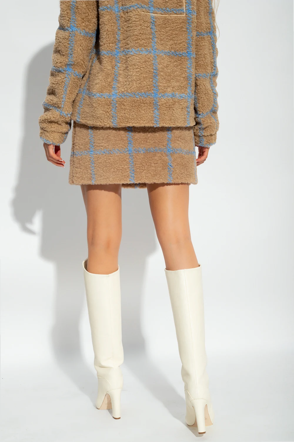 Beige and blue mini skirt from Opening Ceremony. Crafted in fleece, this style features a check pattern and a hidden zipper with a hook & eye closure on the side.