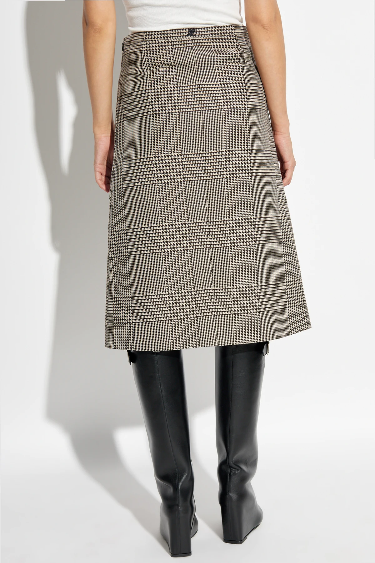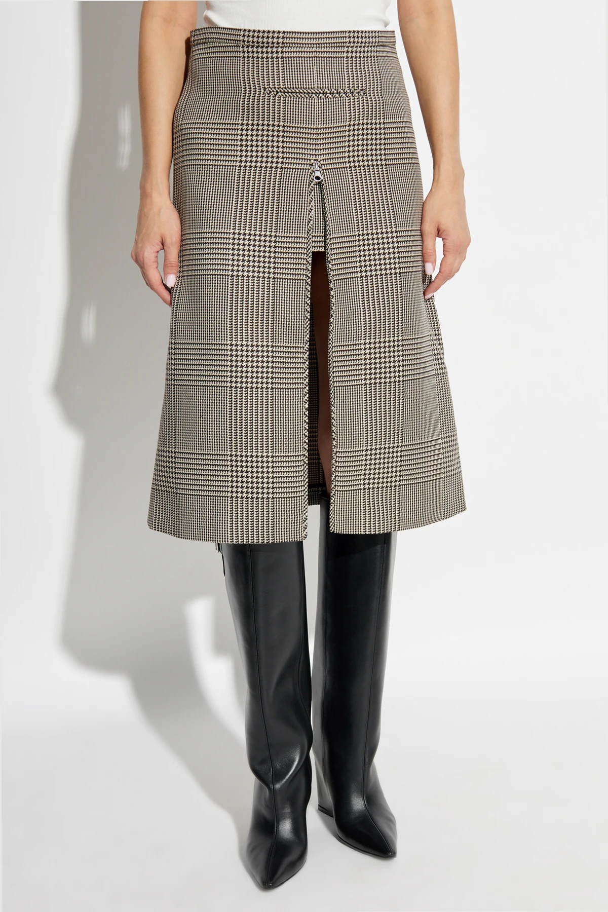 Das klassische Karomuster in Grautönen mit schwarzen Akzenten macht den Rock äußerst vielseitig und leicht mit verschiedenen Garderobenelementen kombinierbar. Der Schlitz vorne, verziert mit einem kleinen Knopf, bringt einen modernen Akzent, und die diskreten Taschen auf Hüfthöhe erhöhen seine Funktionalität.