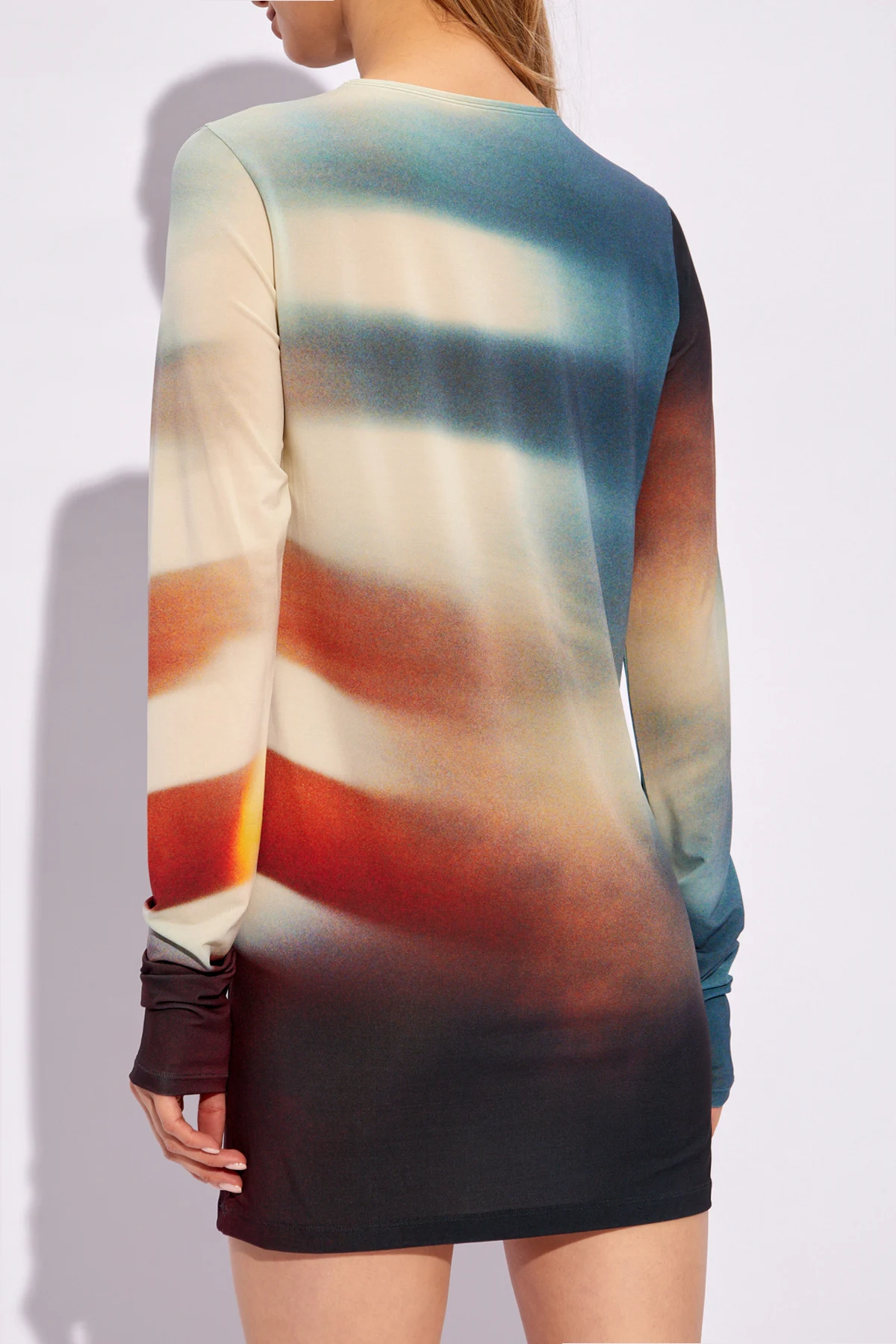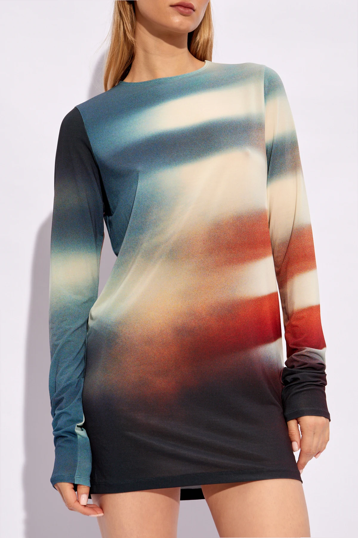 Wir präsentieren Ihnen ein kurzes Kleid vom renommierten Designer Issey Miyake, dessen Design mit einem raffinierten, multikolorierten Muster die Aufmerksamkeit auf sich zieht. Diese künstlerische Komposition, die an ein verschwommenes Foto oder eine Abstraktion erinnert, mit einer Dominanz von Blau-, Rot- und Beigetönen, schafft einen unvergleichlichen visuellen Effekt. Das Kleid begeistert mit fließenden Farbübergängen, die ihm eine außergewöhnliche Tiefe und Dynamik verleihen.