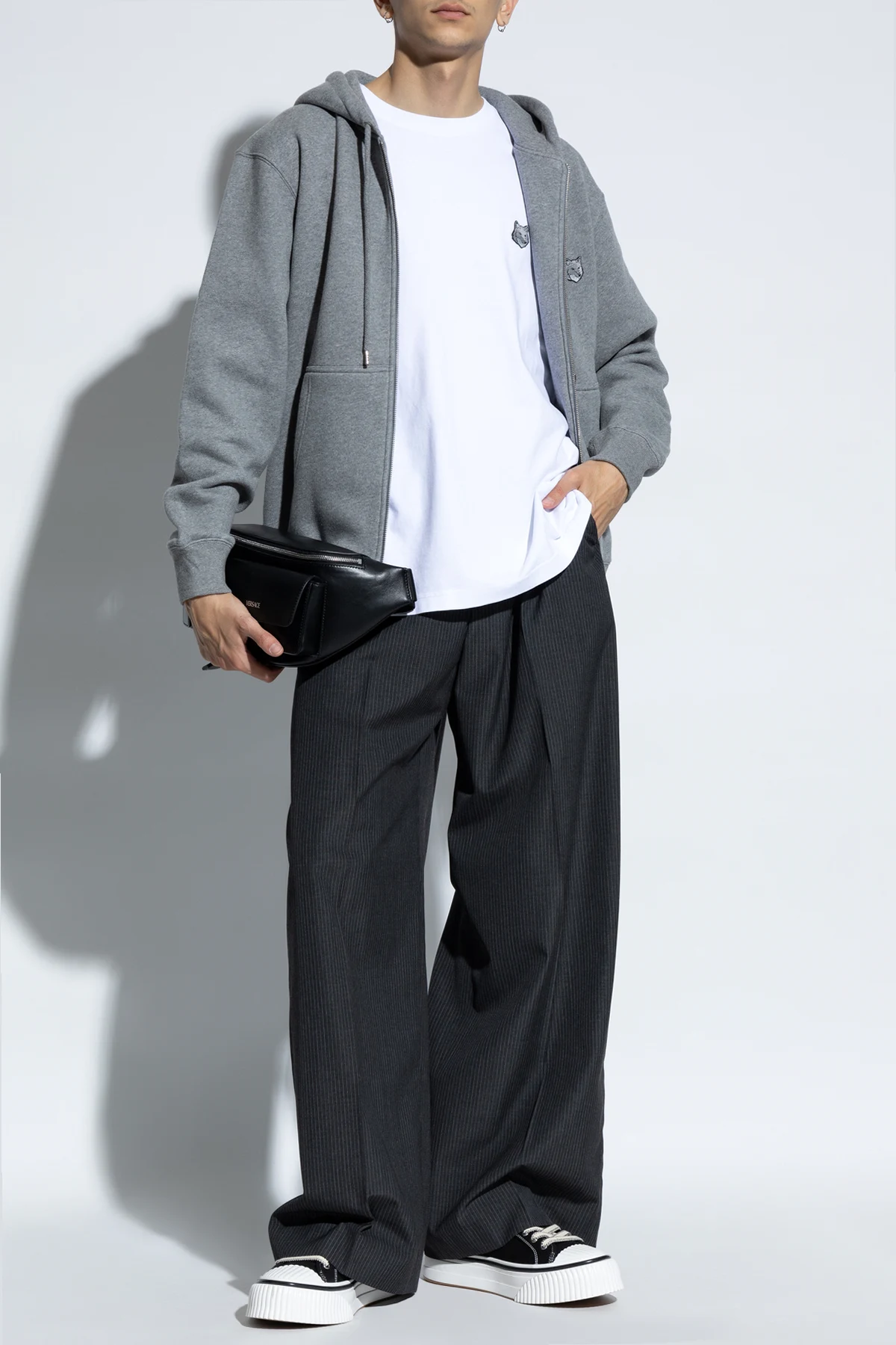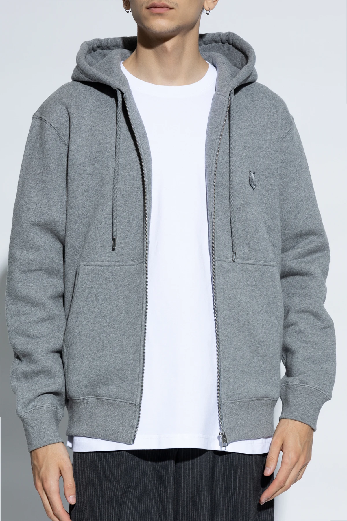 Wir präsentieren die Reißverschlussjacke aus der exklusiven Herrenkollektion von Maison Kitsuné . Diese elegante Jacke in einheitlichem Grau verbindet klassisches Design mit modernem Akzent und ist die perfekte Wahl für kühlere Tage.
