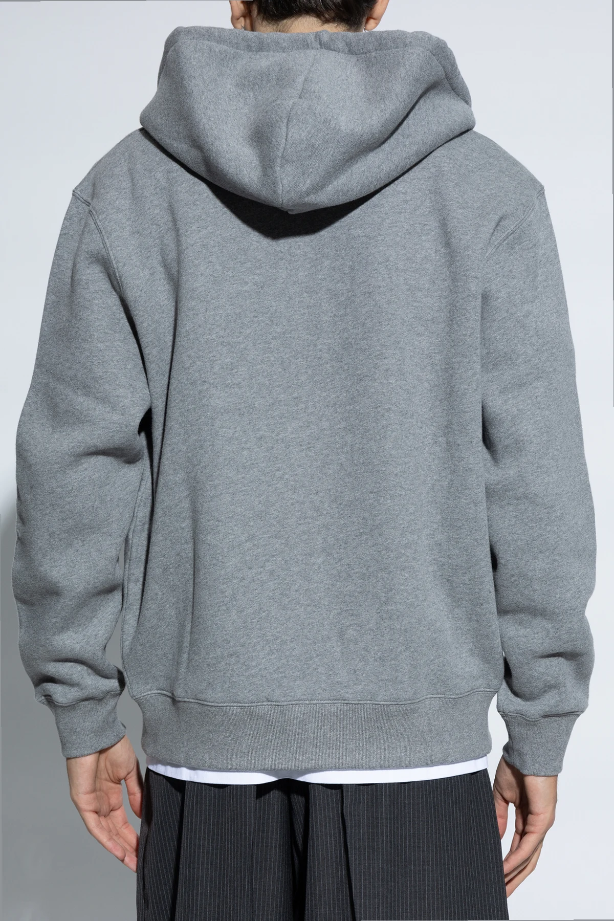 Gefertigt aus weichem, warmem Stoff, vermutlich Baumwolle, bietet die Jacke höchsten Tragekomfort. Der klassische, schlichte Schnitt mit langen Ärmeln und einer Kapuze, die mit Kordeln verstellbar ist, ist die Essenz von Stil und Funktionalität. Zwei Fronttaschen und ein Reißverschluss vorne sorgen für zusätzliche Praktikabilität.