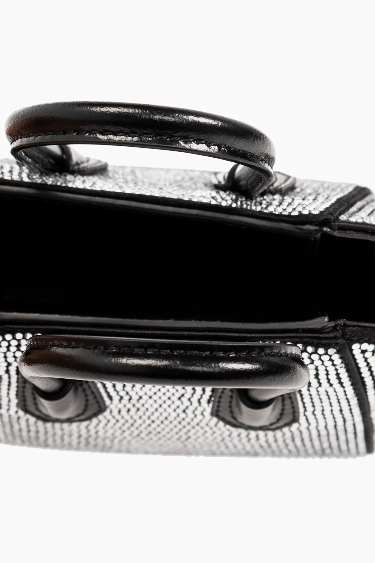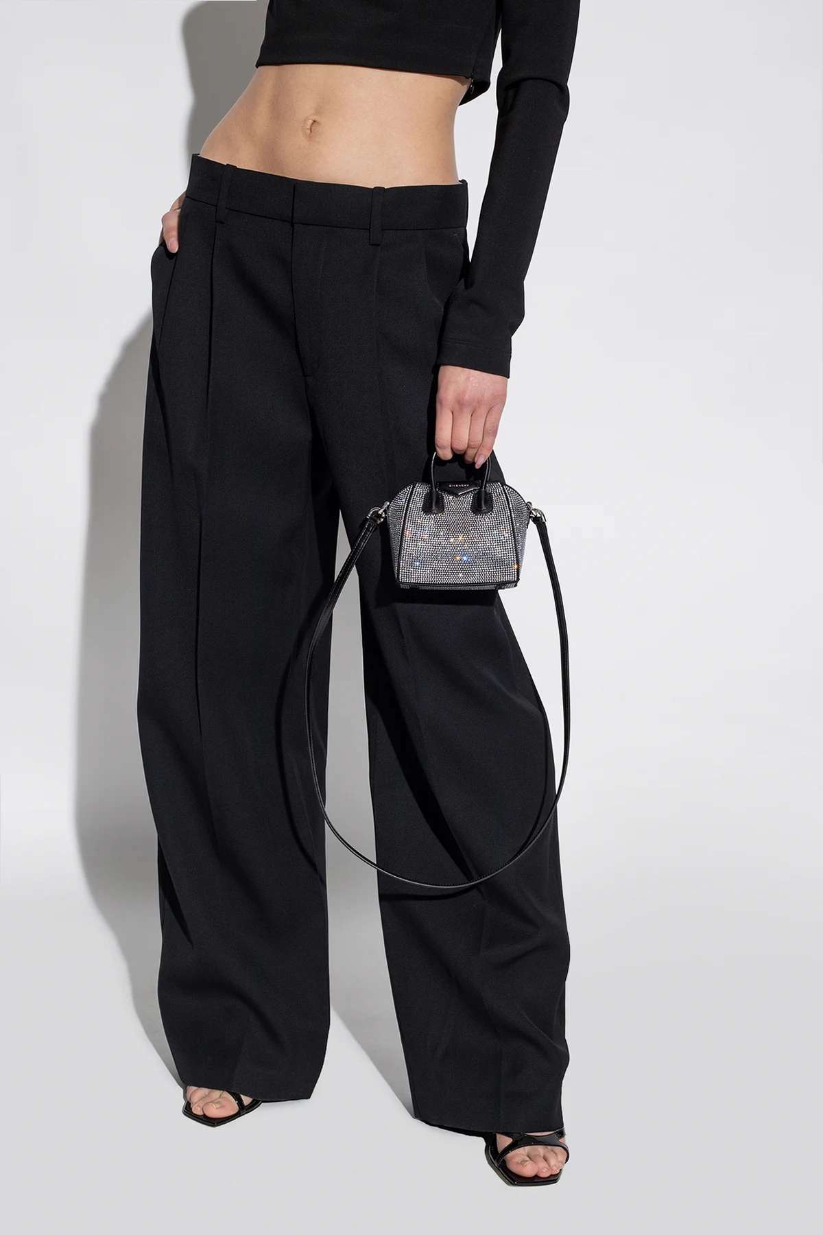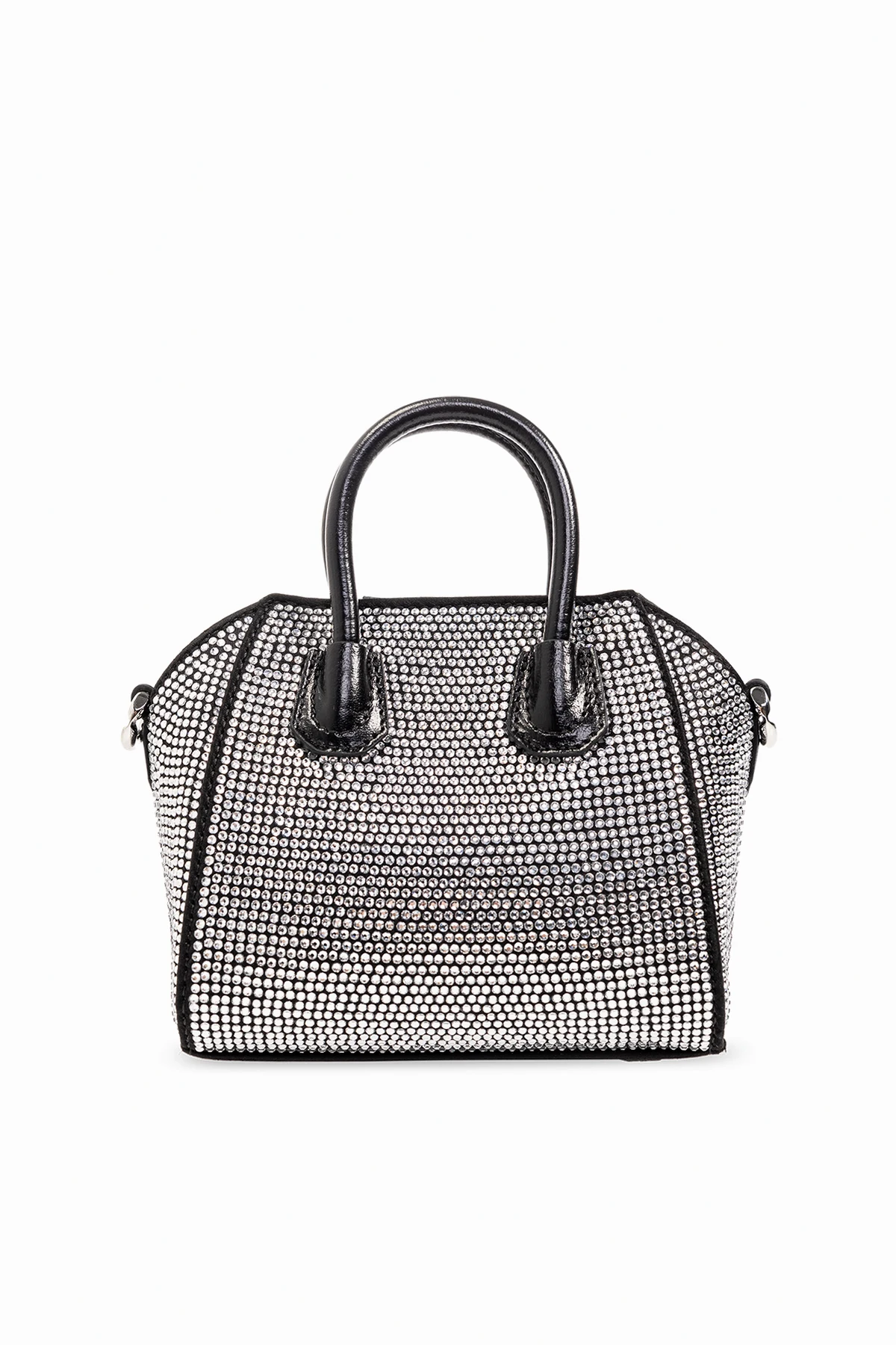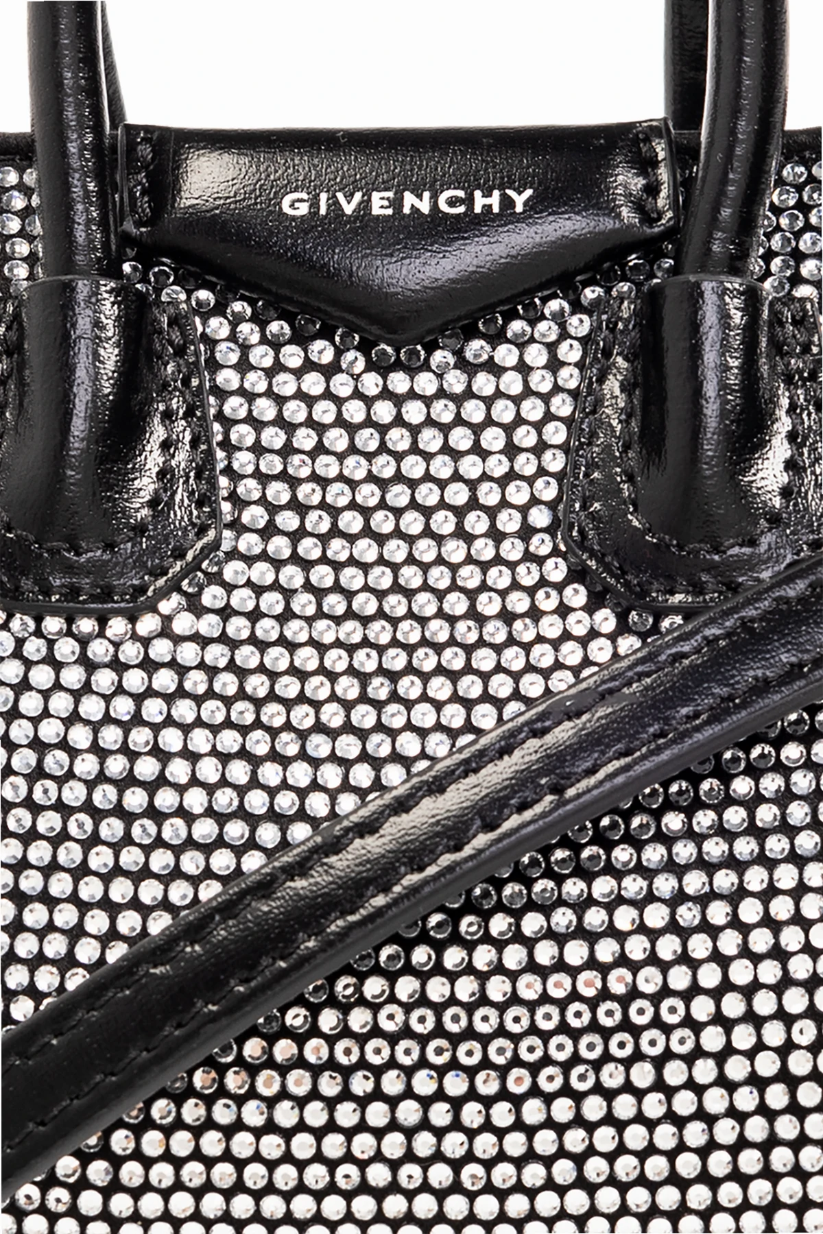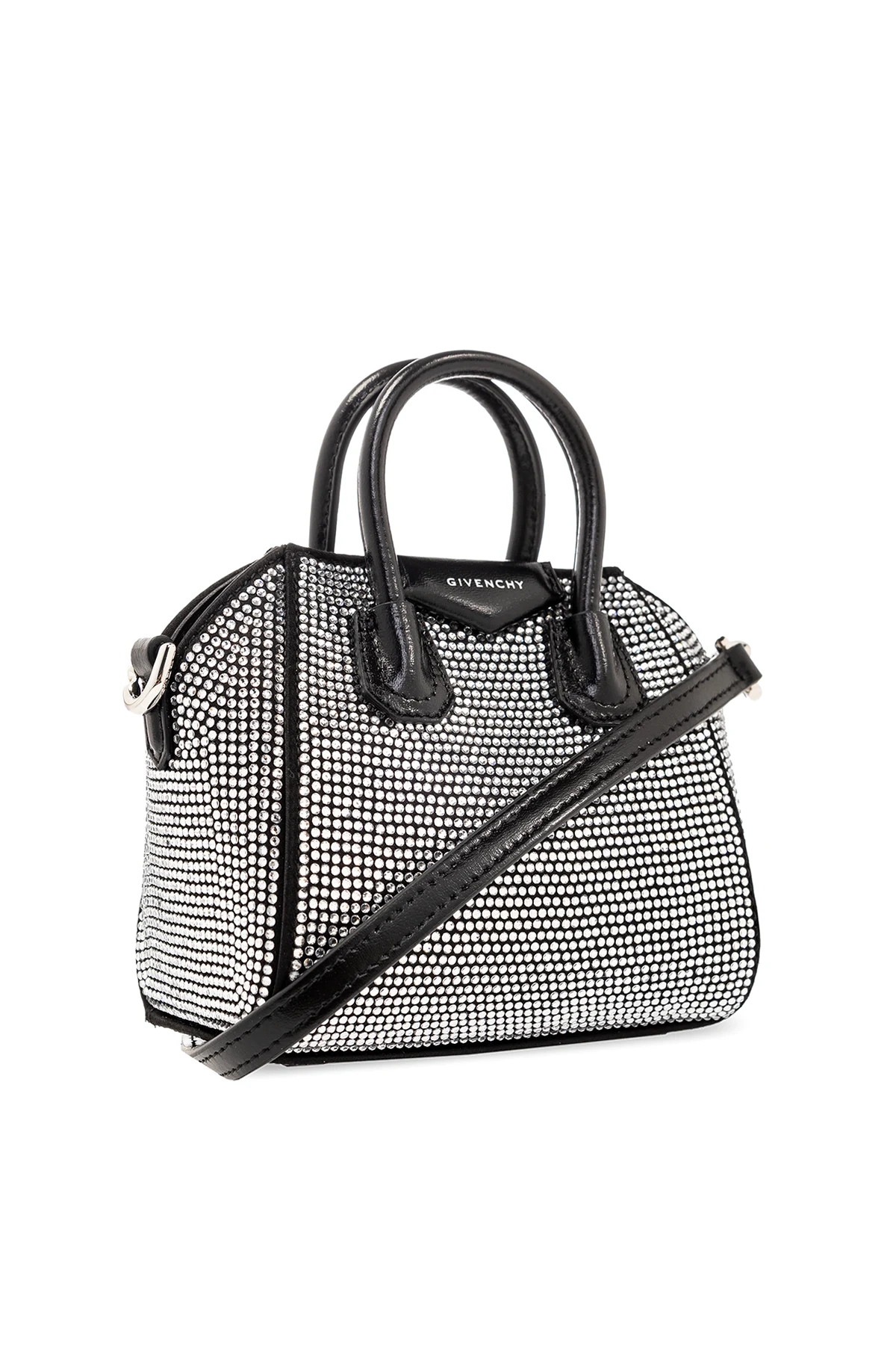 Black ‘Antigona Mini’ shoulder bag from Givenchy. Spruced up with glistening crystals, this item fastens with a magnetic snap and showcases a logo patch on the front, two half-round handles, a detachable shoulder strap, silver-tone metal hardware and one internal compartment.