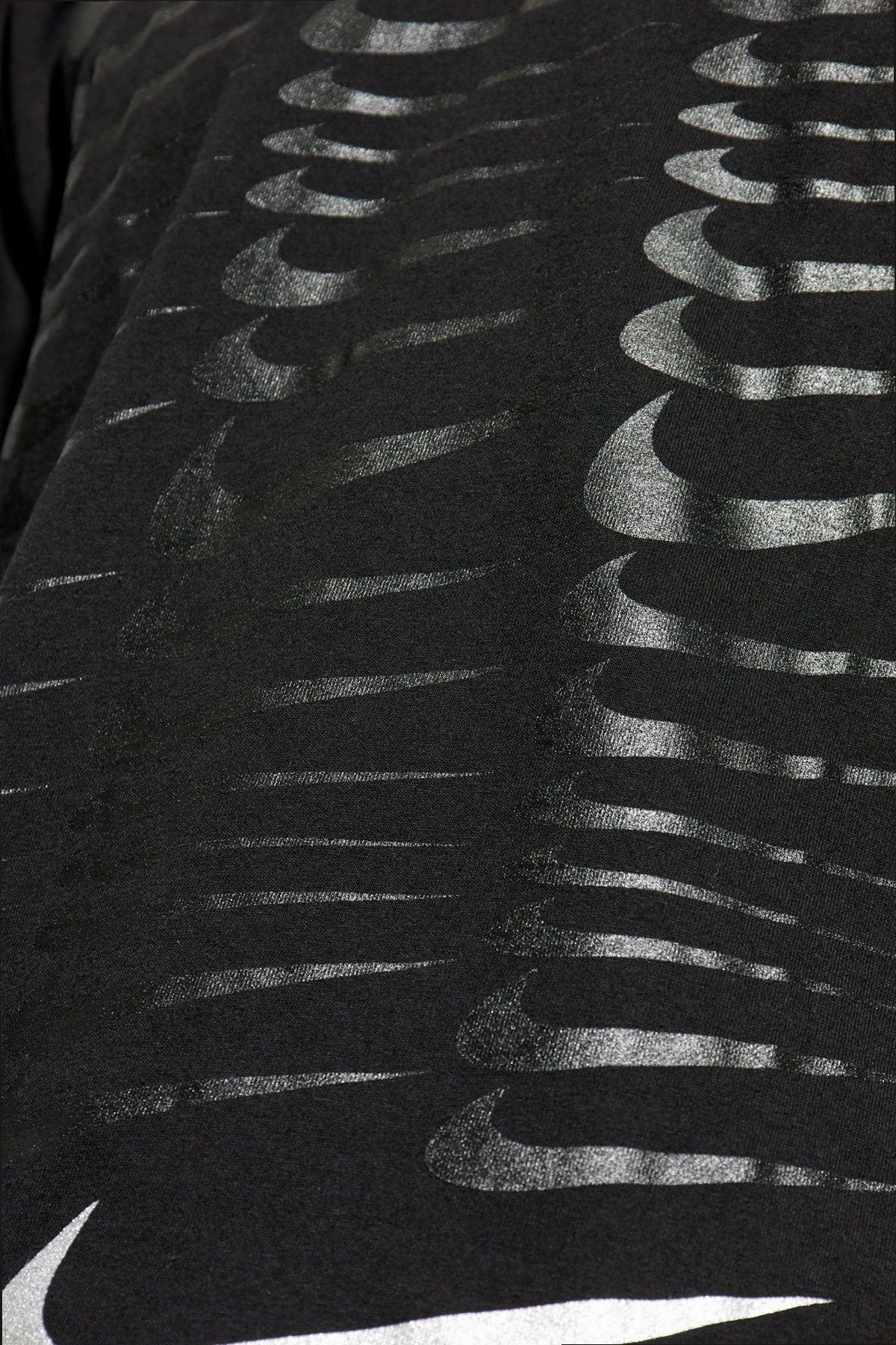 Das T-Shirt zeichnet sich durch einen klassischen, geraden Schnitt mit kurzen Ärmeln und einem Rundhalsausschnitt aus. Das Muster auf der Vorderseite des Shirts besteht aus dem mehrfach wiederholten Nike-Logo in verschiedenen Schwarztönen, mit einem weißen Logo am unteren Rand, das einen dynamischen, geschichteten Effekt erzeugt. Das Material, aus dem das Shirt gefertigt ist, besteht aus hochwertiger Baumwolle , die Tragekomfort und Atmungsaktivität gewährleistet.